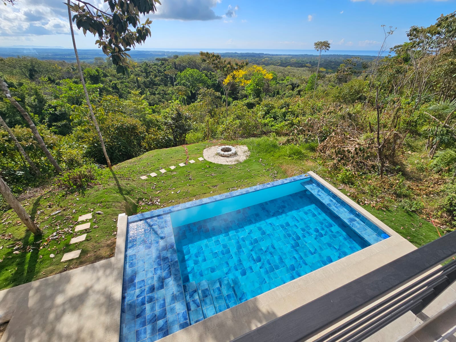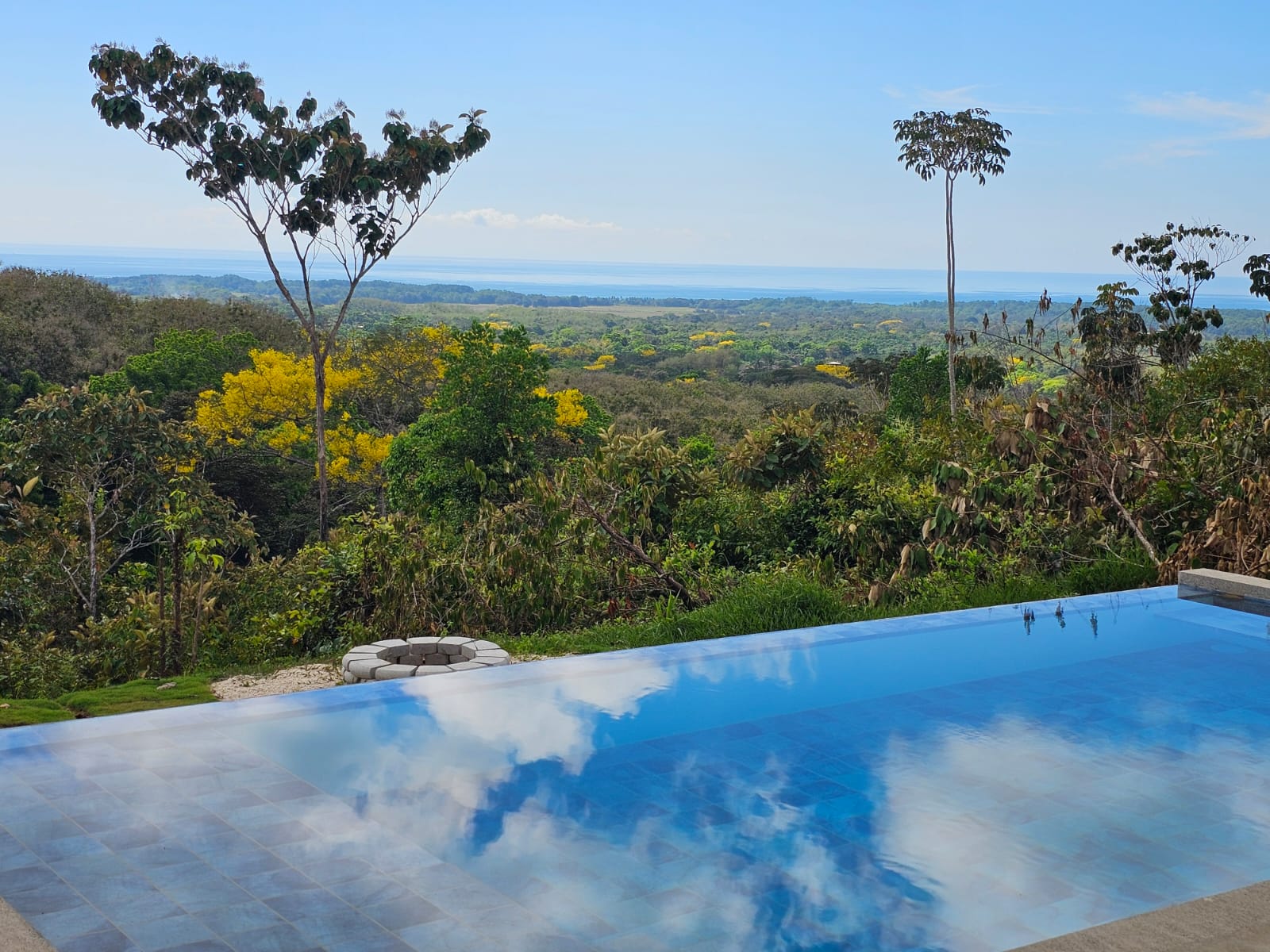Outdoor living is just as impressive, featuring an infinity-edge pool, mature tropical landscaping, generous balconies and patios, an exterior shower, and a fire pit—all positioned to take full advantage of the unobstructed ocean views stretching along the Pacific coastline, with Manuel Antonio visible in the distance. Sunset views can also be enjoyed from the second-floor balcony on the opposite side of the home.