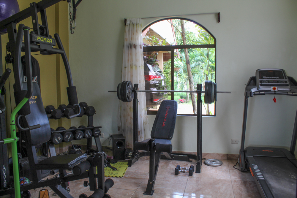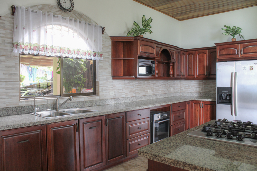 The house is solidly built, featuring large rooms, halls, and terraces. Beautiful carved wooden doors lead into the main living space, featuring a bright living room. The kitchen has an expanse of custom cabinets and granite counters, with a pantry, stainless steel appliances, and an island cooking zone with breakfast bar. The adjoining dining room has patio doors leading to the deck, overlooking the incredible valley, river, ocean and peninsula views. On the main floor there is one bedroom, currently used as a home gym, as well as a bathroom and the laundry room.