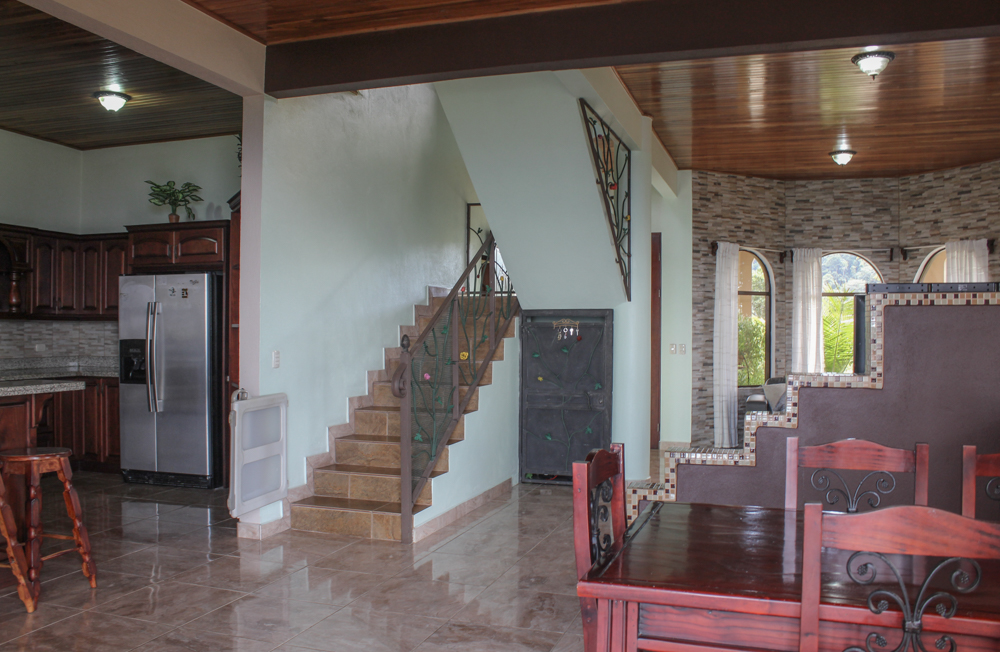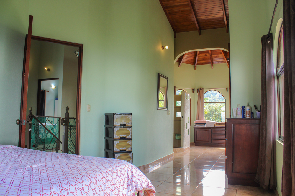 The stairs leading to the second level features a beautiful wrought iron railing. Upstairs there are two balconies, one out front with a nice mountain view, while the hall leads to the second large covered balcony across the back of the house, which overlooks the incredible panoramic views once again. The master bedroom is spacious and flows openly past closets to the ensuite bathroom. The second and third bedrooms both feature large windows which make the rooms bright and provides great views. A full bathroom services these two bedrooms.