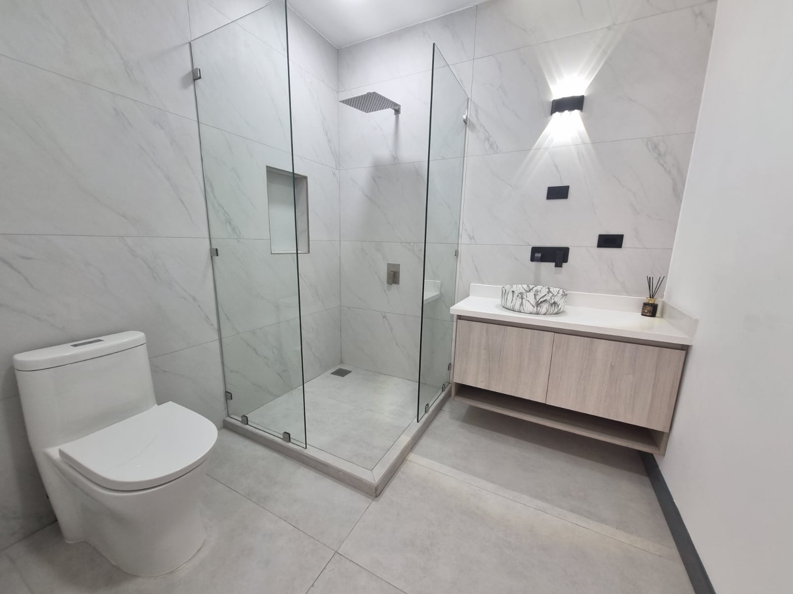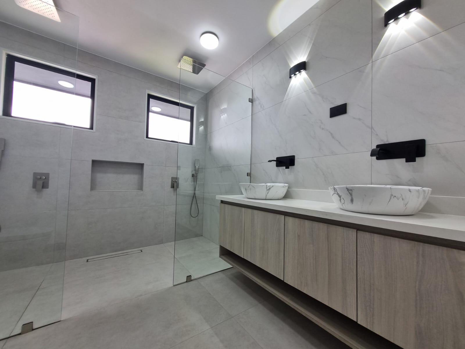 Second level: Master bedroom with WC space, private bathroom with double shower, double sink.
