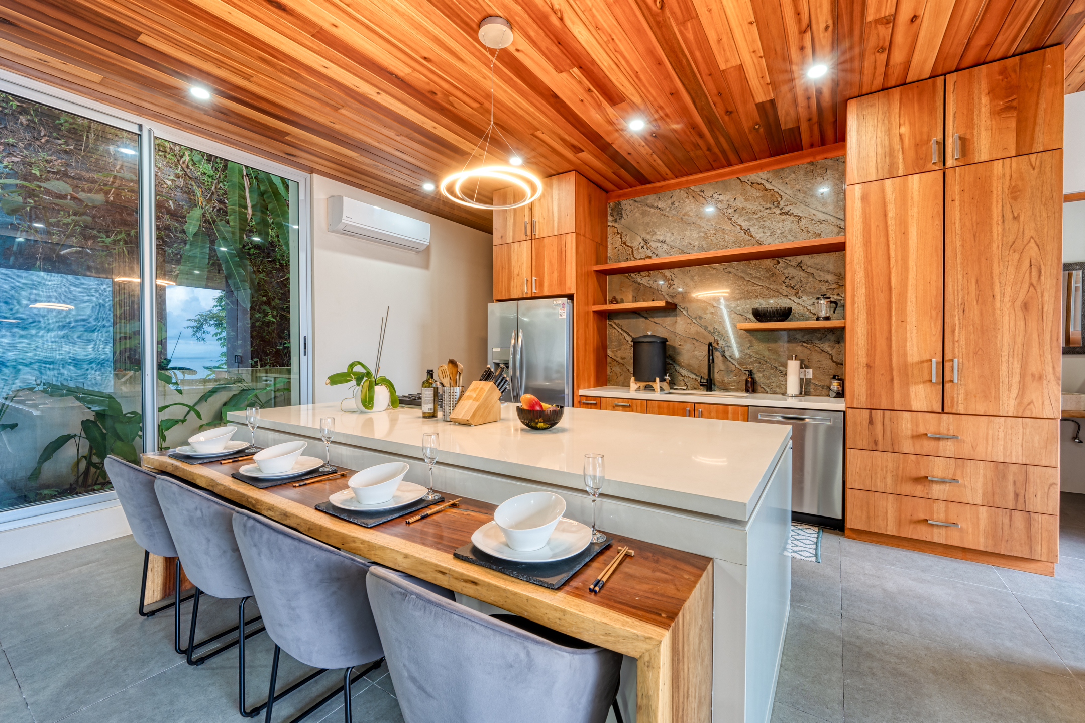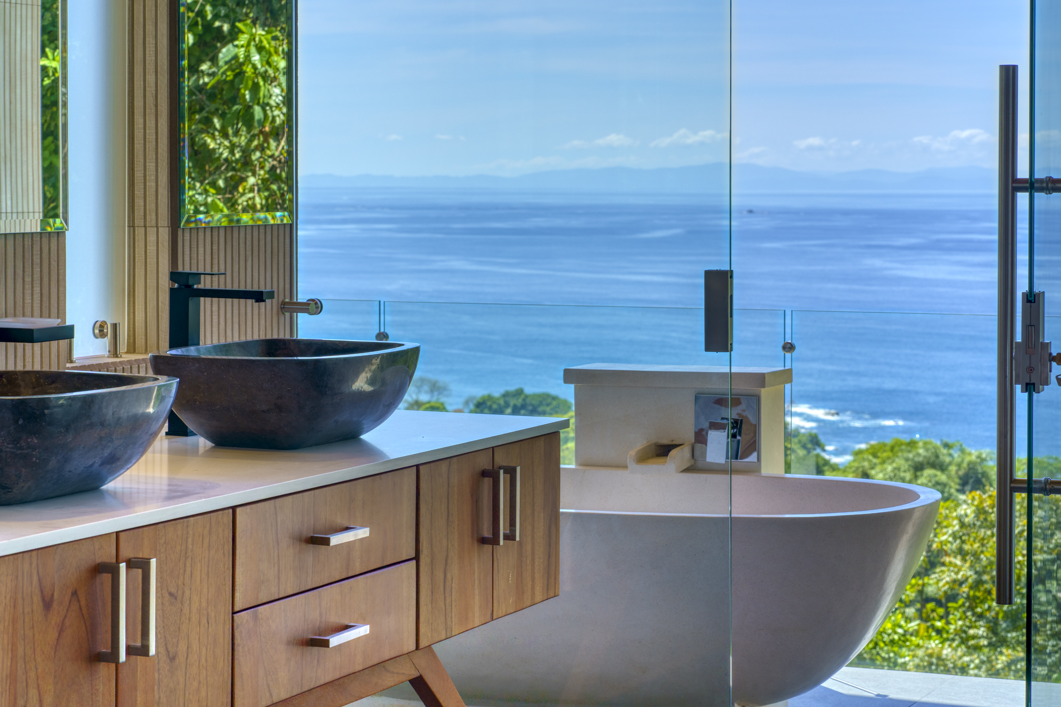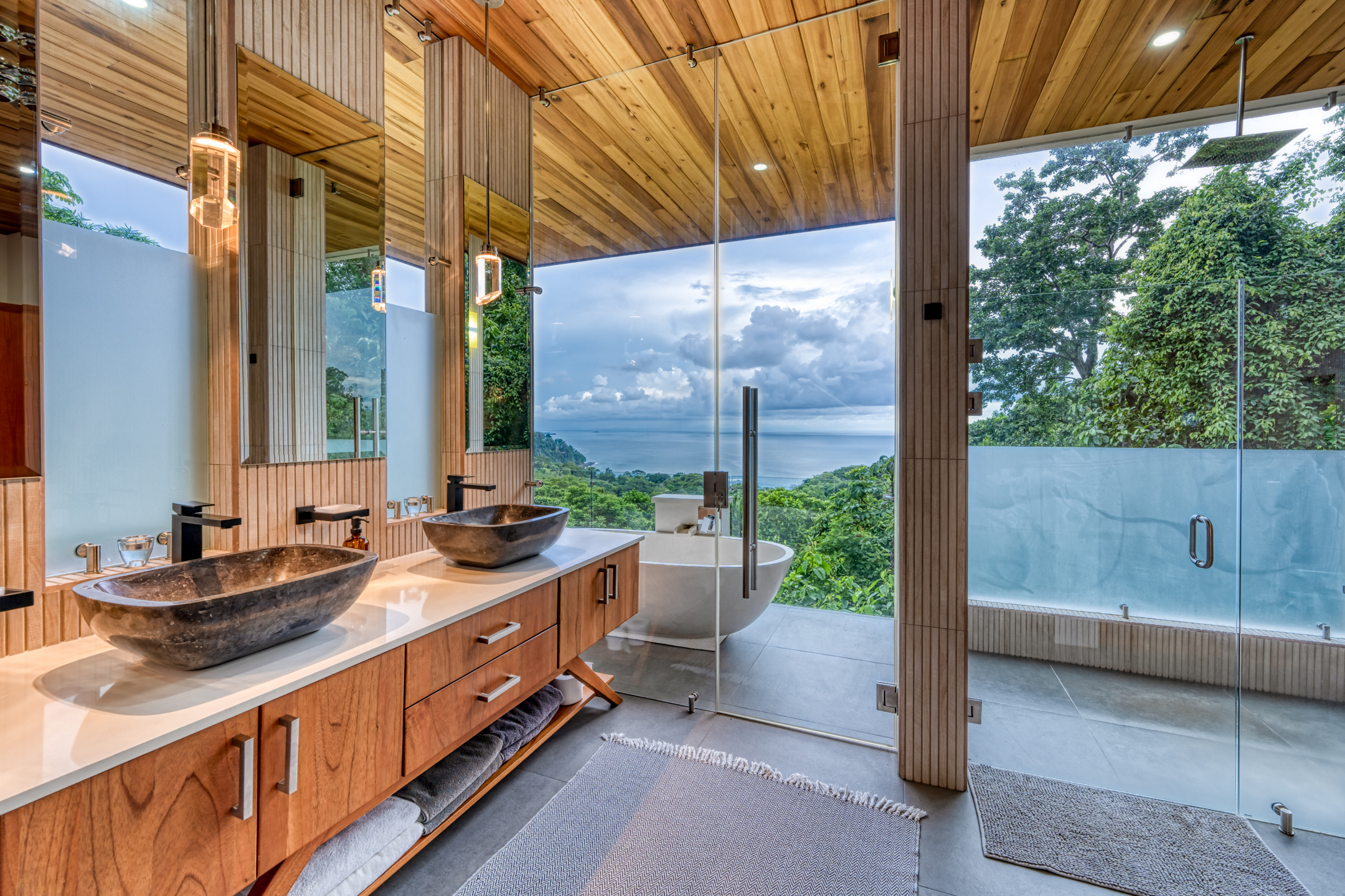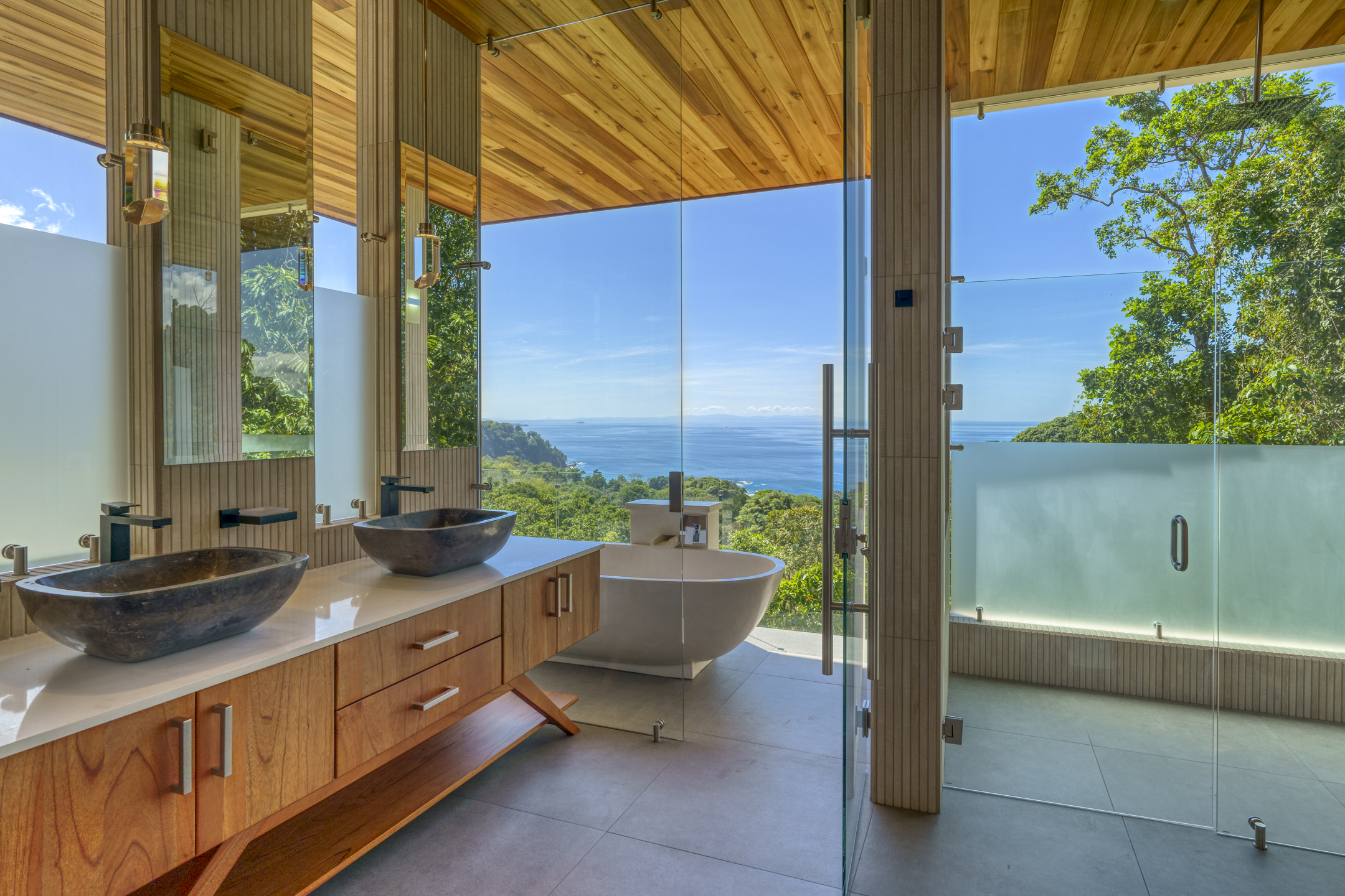 The two additional bedroom suites on the top floor capitalize on the awe-inspiring ocean vistas. From the comfort of your bed, witness the majestic ocean unfold before your eyes. Each suite has an outdoor shower and double vanity adorned with polished stone sinks. Full-length sliding doors beckon the healing ocean air, and the jungle melodies into your private sanctuary. The fourth bedroom has a private entrance and views of the jungle and ocean.