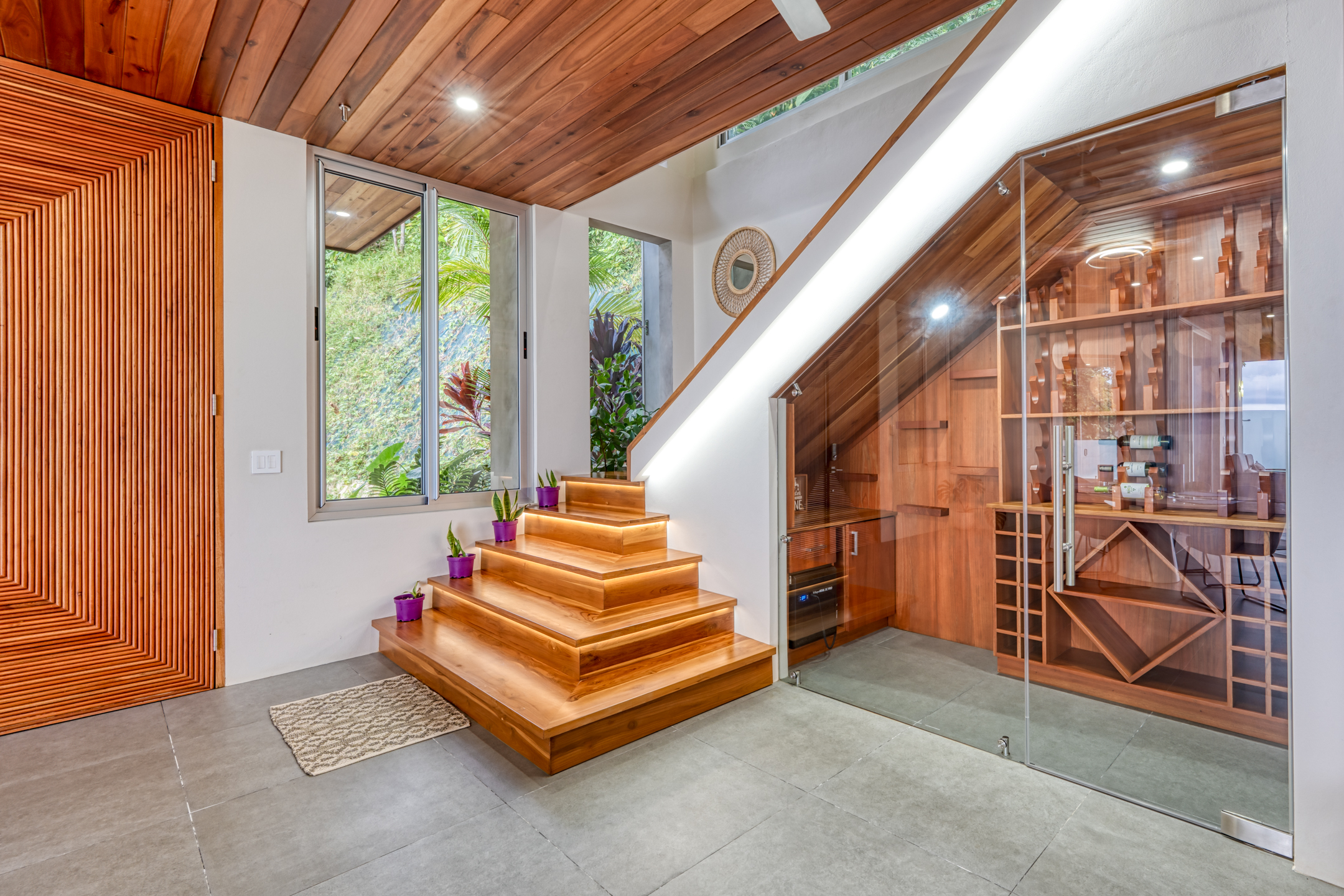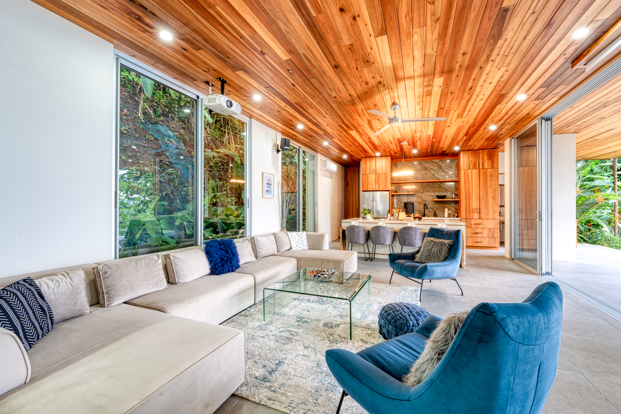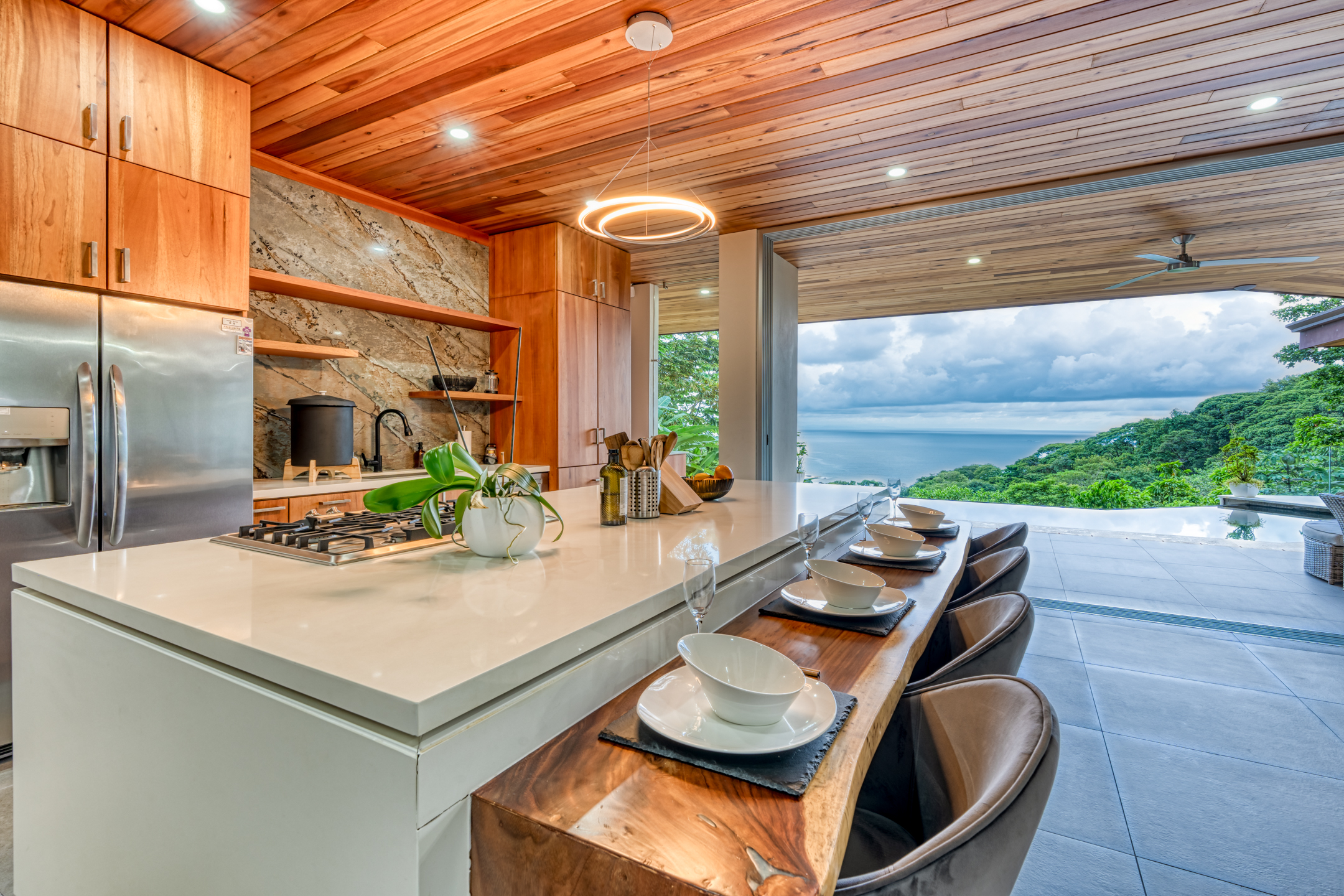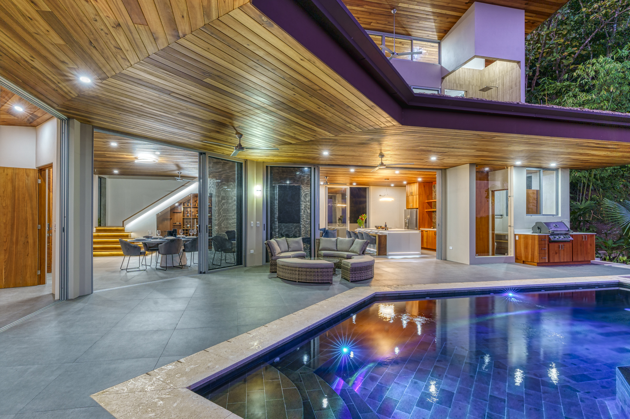 Casa Sulit is an ode to a well-lived life. The main floor presents an open living space that seamlessly merges the interior and exterior, creating an oasis of free-flowing harmony. The outdoor living area features a generous patio with an infinity pool, providing ample space for sun loungers, outdoor dining, and relaxation. Ignite the barbecue and relish in the warmth of Costa Rica's nights as you dine under the celestial canopy. This exquisite residence is a true entertainer's paradise, offering plenty of room to host family gatherings and sophisticated soirées. Indulge your culinary desires in the gourmet kitchen, which comes complete with a walk-in pantry. Discover the clever utilization of space beneath the stairs—a walk-in wine cellar with a glass wall showcasing your impressive collection.