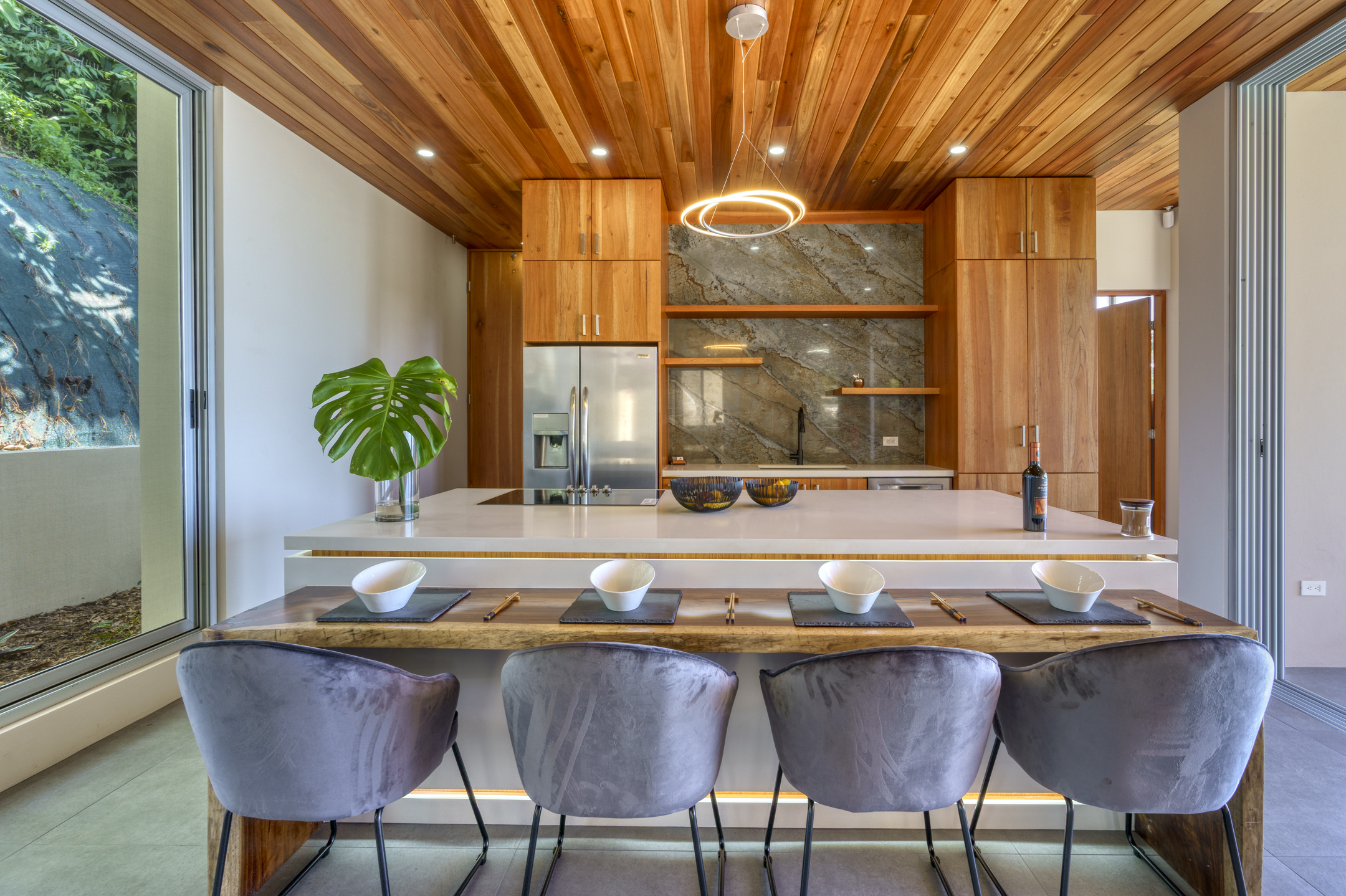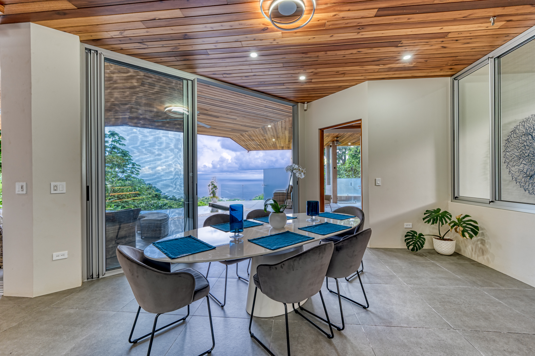 Embrace the seamless fusion of interior and exterior living in every corner of Casa Sulit. The rooms feature expansive glass sliding doors, erasing the boundaries between your living space and the refreshing coastal breeze. The master bedroom suite indulges your senses with an open-air bathroom, allowing you to savor the view without ever tearing your gaze away. Imagine starting your morning showering while spotting whales and ending your days stargazing from the bathtub on your balcony.