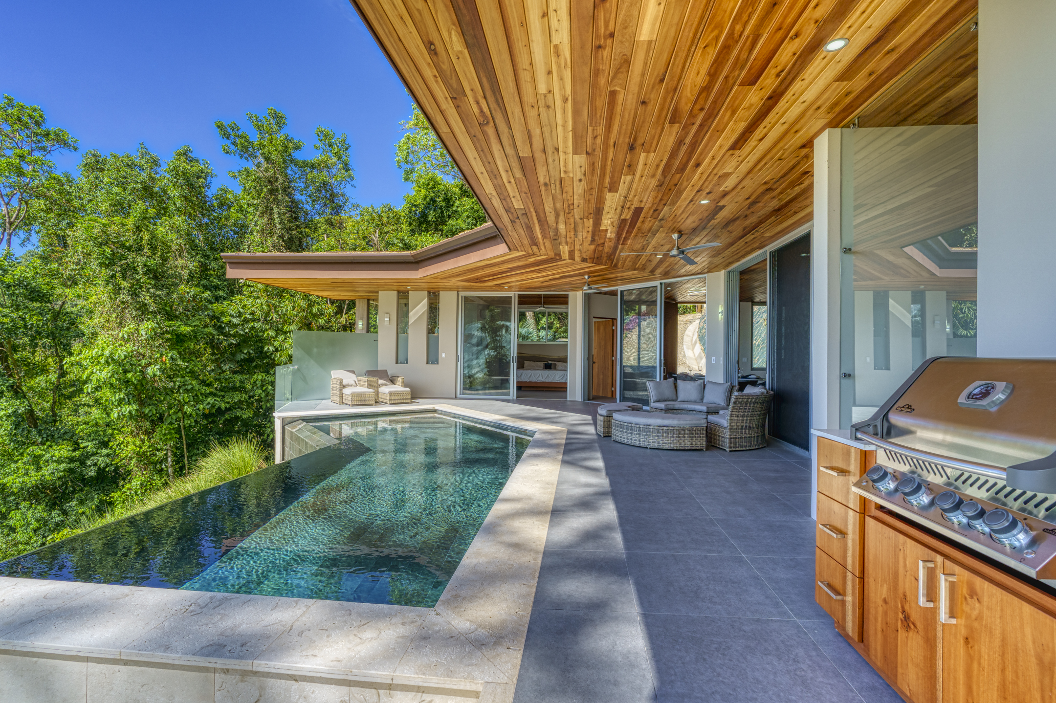 - A sun-soaked terrace beneath the infinity pool with cascading waterfall, perfect for hammocks and sun loungers