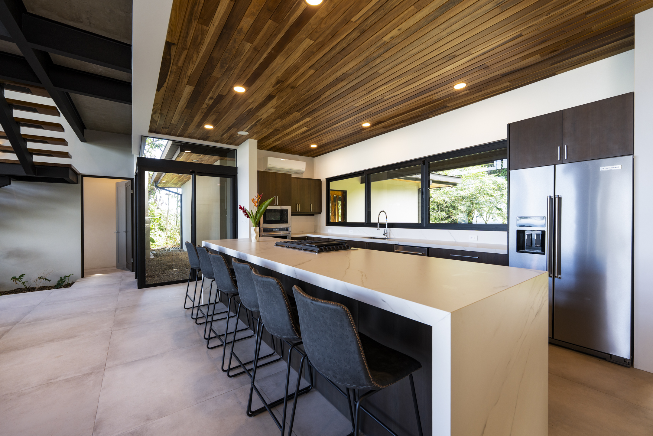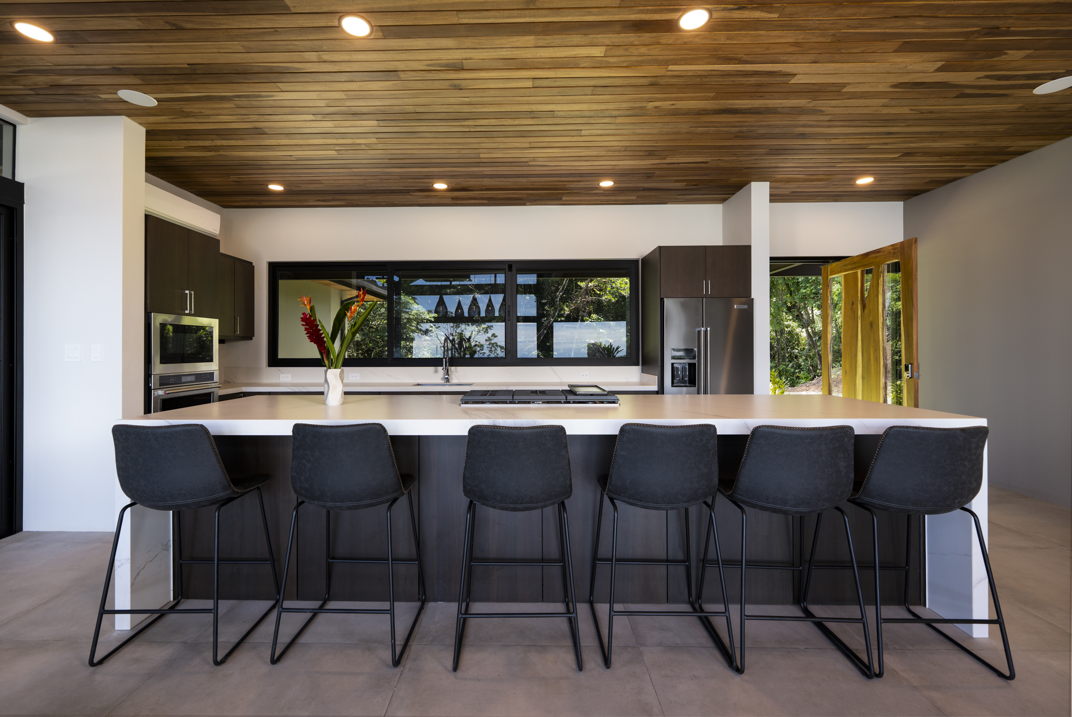 From every angle, you see either the rainforest canopy, the Pacific Ocean, or both. Whether it’s sunrise casting light through the trees or the afternoon sun setting over the horizon, the view is constant and always changing. The custom kitchen features clean, modern cabinetry, high-end appliances, and an oversized island perfect for gathering. But it’s the seamless transition to the outdoors that makes everyday living here feel special. Step out onto the sprawling teak deck, and the hand-tiled infinity-edge pool stretches before you, appearing to pour directly into the ocean beyond.