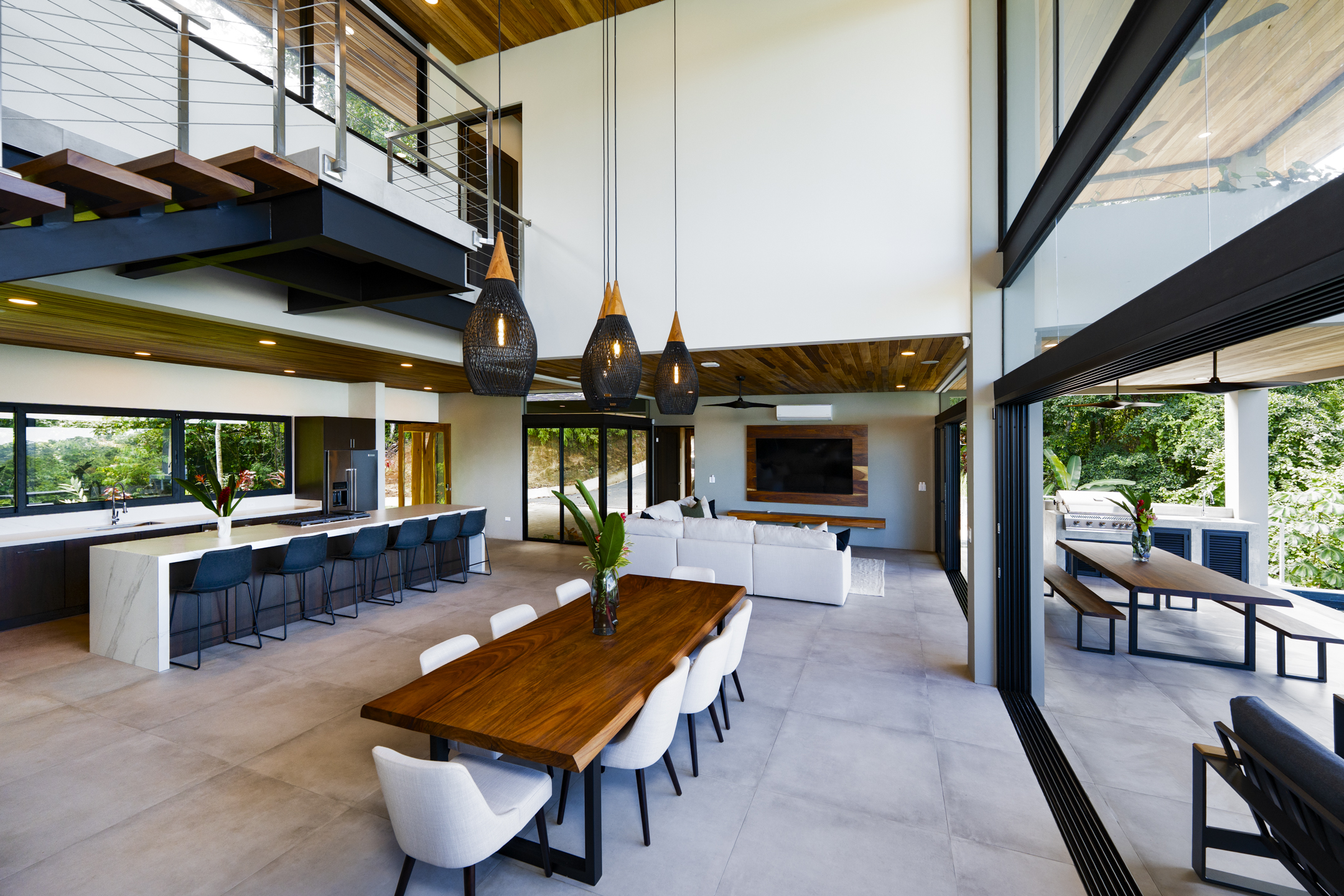 The main living area is the centerpiece of the home. This expansive open-concept space combines kitchen, dining, and lounge in one continuous flow, framed by soaring floor-to-ceiling glass on three sides. Sliding glass panels fully retract, transforming the entire living space into an open-air pavilion.