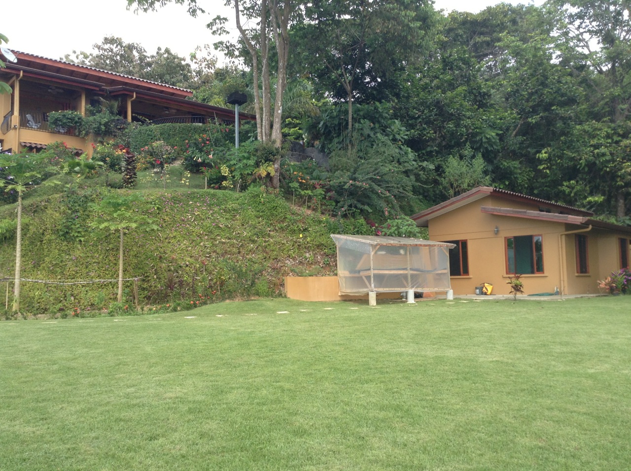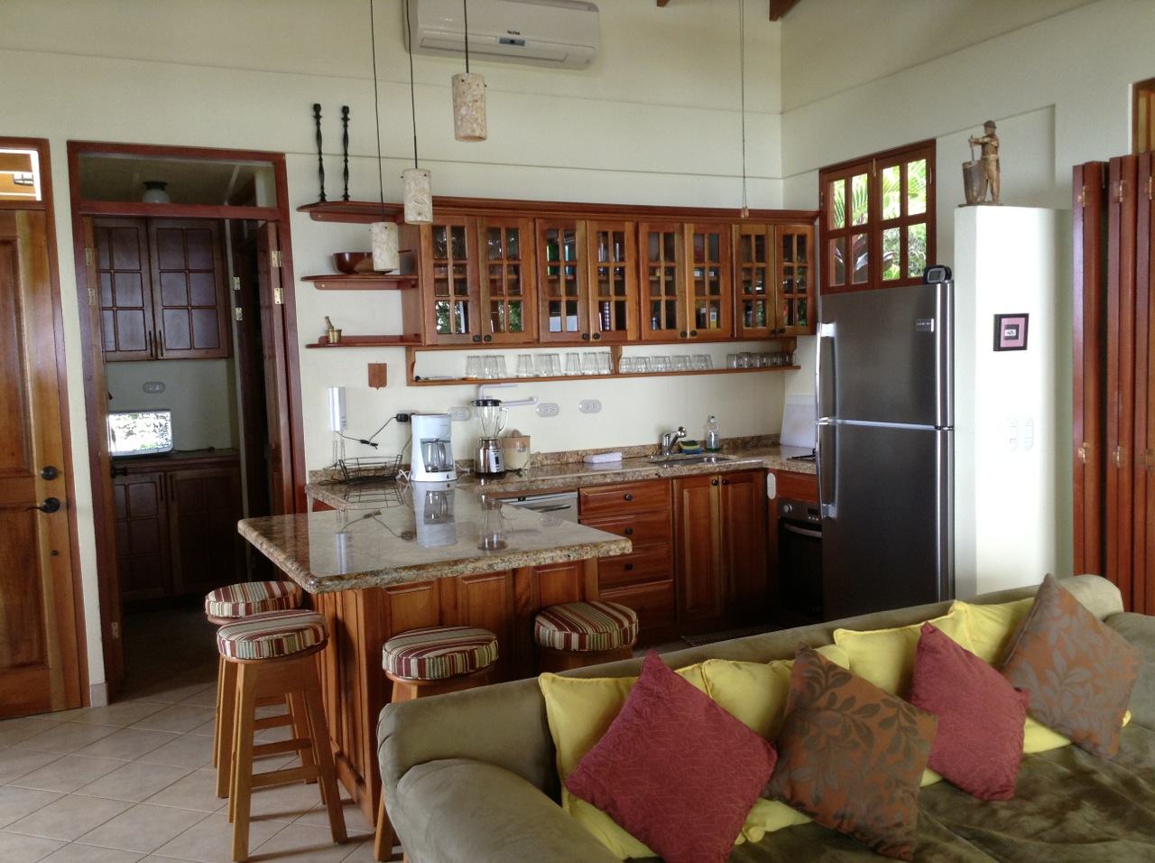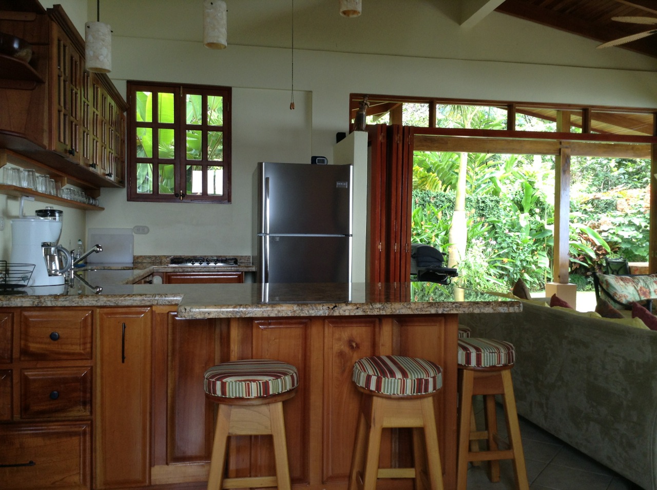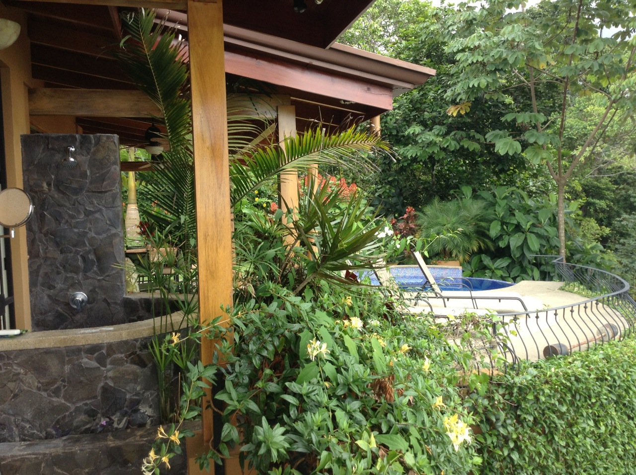 The main house has the tropical indoor/outdoor living experience mixed with the feeling of a Tuscan villa nestled within your own personal tropical garden. The kitchen, finished with granite counter tops and stainless steel appliances, open onto the living room with fold-away doors, which extend to the exterior patio. The design welcomes warm breezes, scents of the rain forest and spectacular ocean views. The master bedroom has its own private ocean view balcony and indoor/outdoor shower. Downstairs is the guest room with its own bathroom and terrace with flowering gardens allowing oneself to enjoy toucans, hummingbirds and much more.
