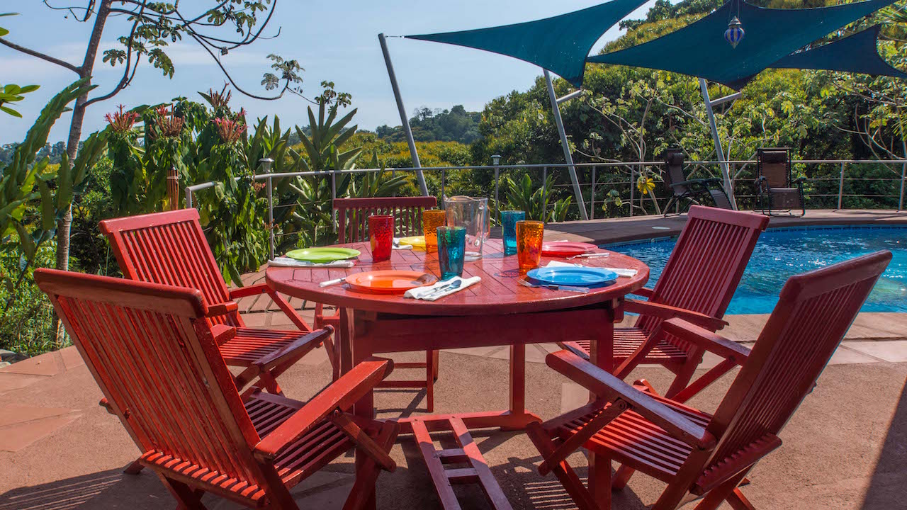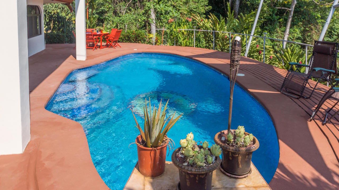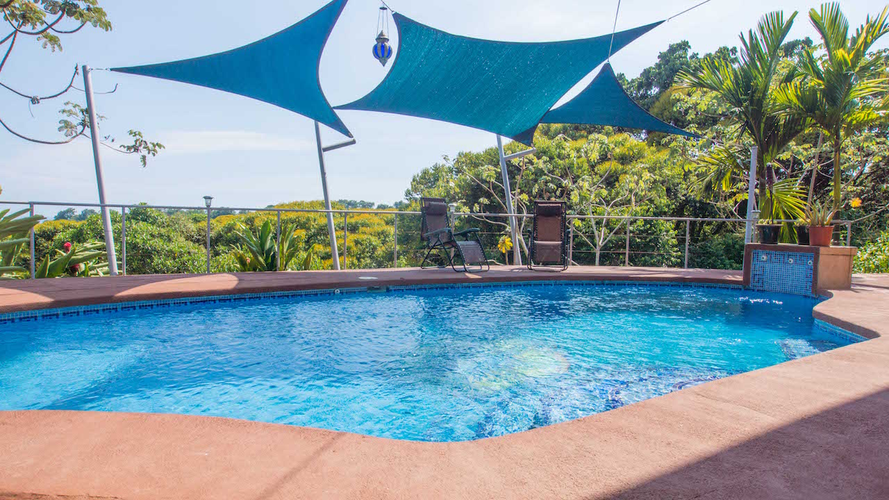 The seashell-shaped pool and terrace are covered with layered tarps, offering gradient shade in this year-round sunny environment. Even during the rainy season, you will find yourself enjoying pleasantly sunlit mornings in this luxurious, ecological retreat. The incredible forest and ocean view from your poolside lounge will remind you of what it means to be alive, amidst all of this revitalizing life.
