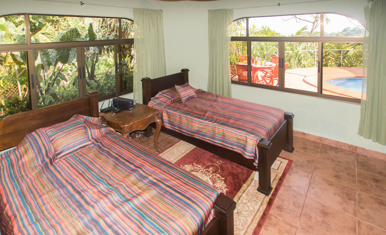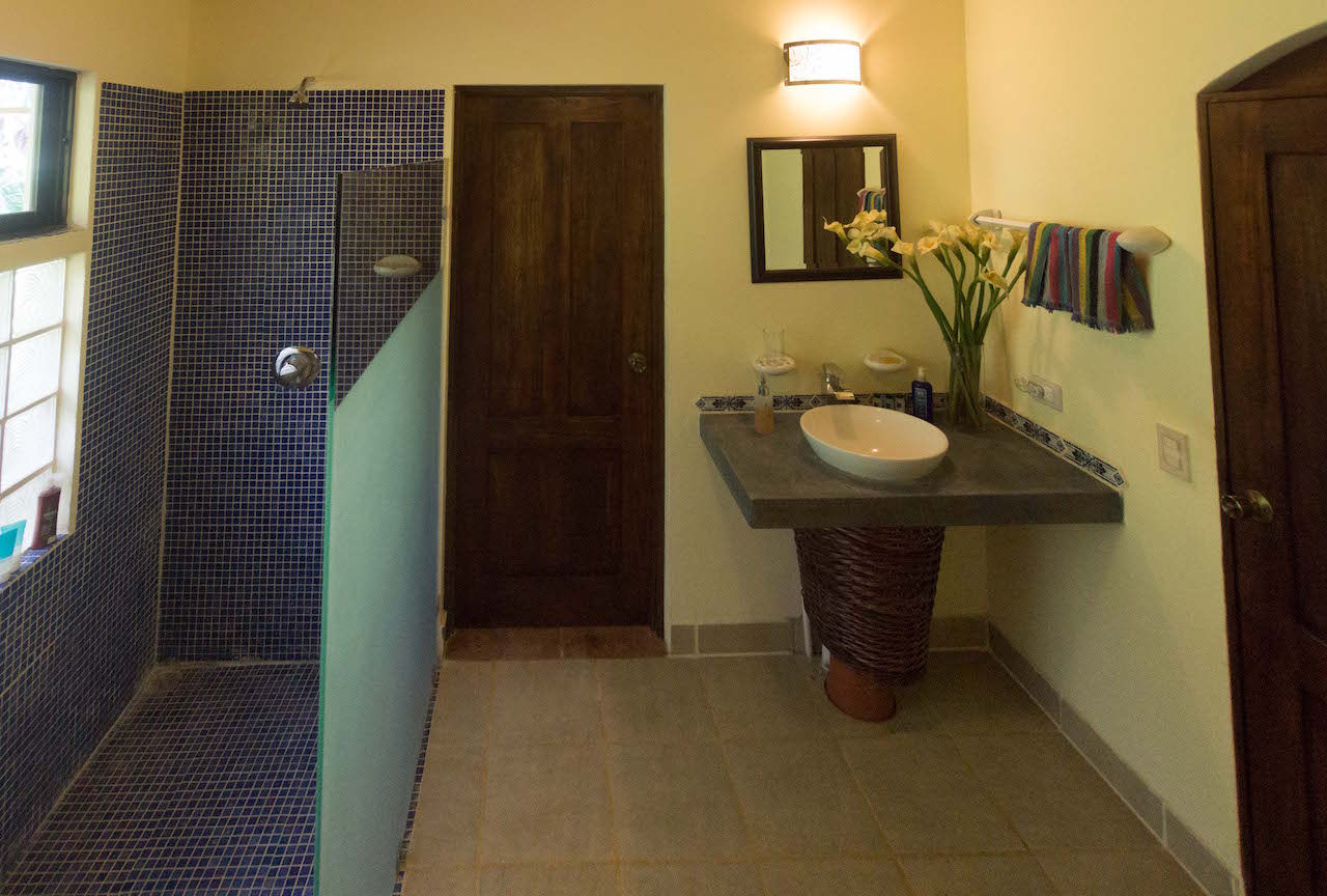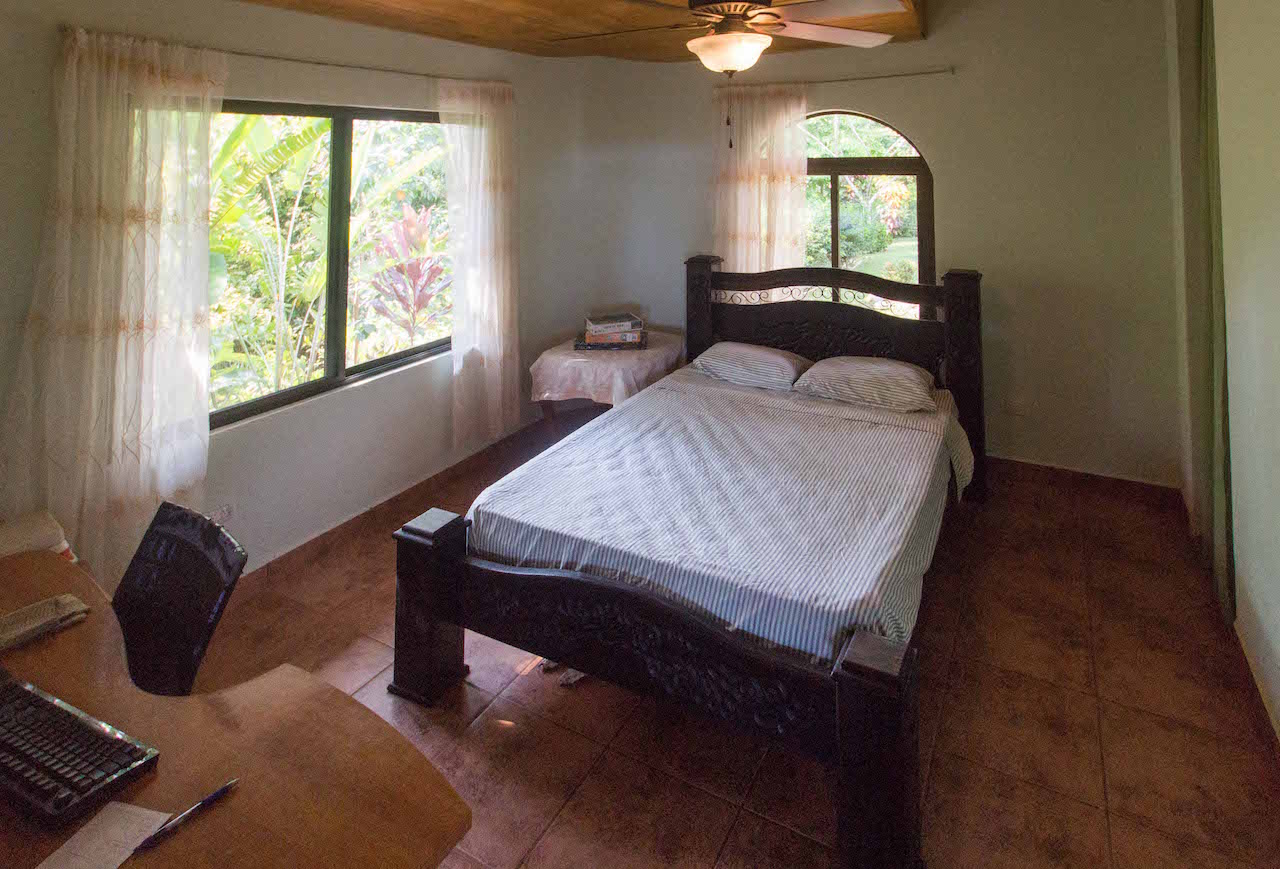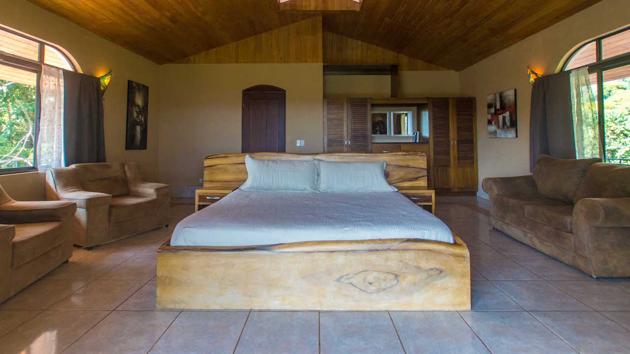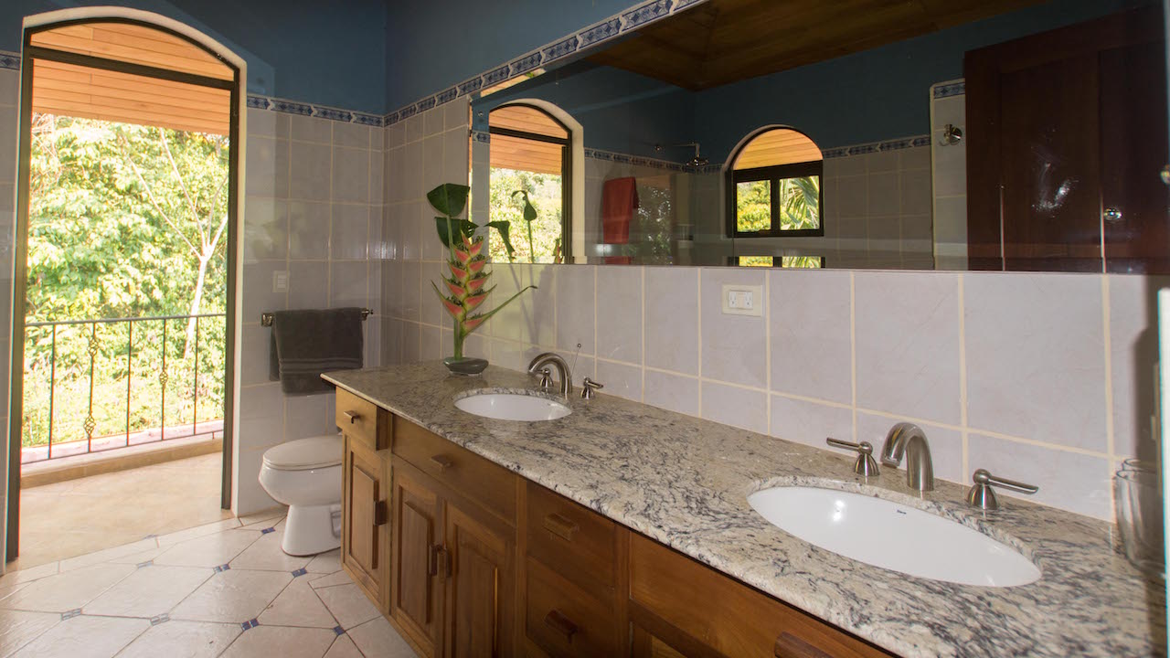 The master suite has a resplendent handmade solid Guanacaste wood bed frame that inspires awe from all those who see it and makes for a sumptuous sleep. The laurel wood ceilings, which are found throughout the residence and are in immaculate condition, offer 9.5ft of clearance at their highest point, bringing more openness to the already spacious room size. The ensuite bathroom with couples’ sinks and waterfall shower are a richly rewarding way to begin and end your day, all while enjoying the serene mountain view.