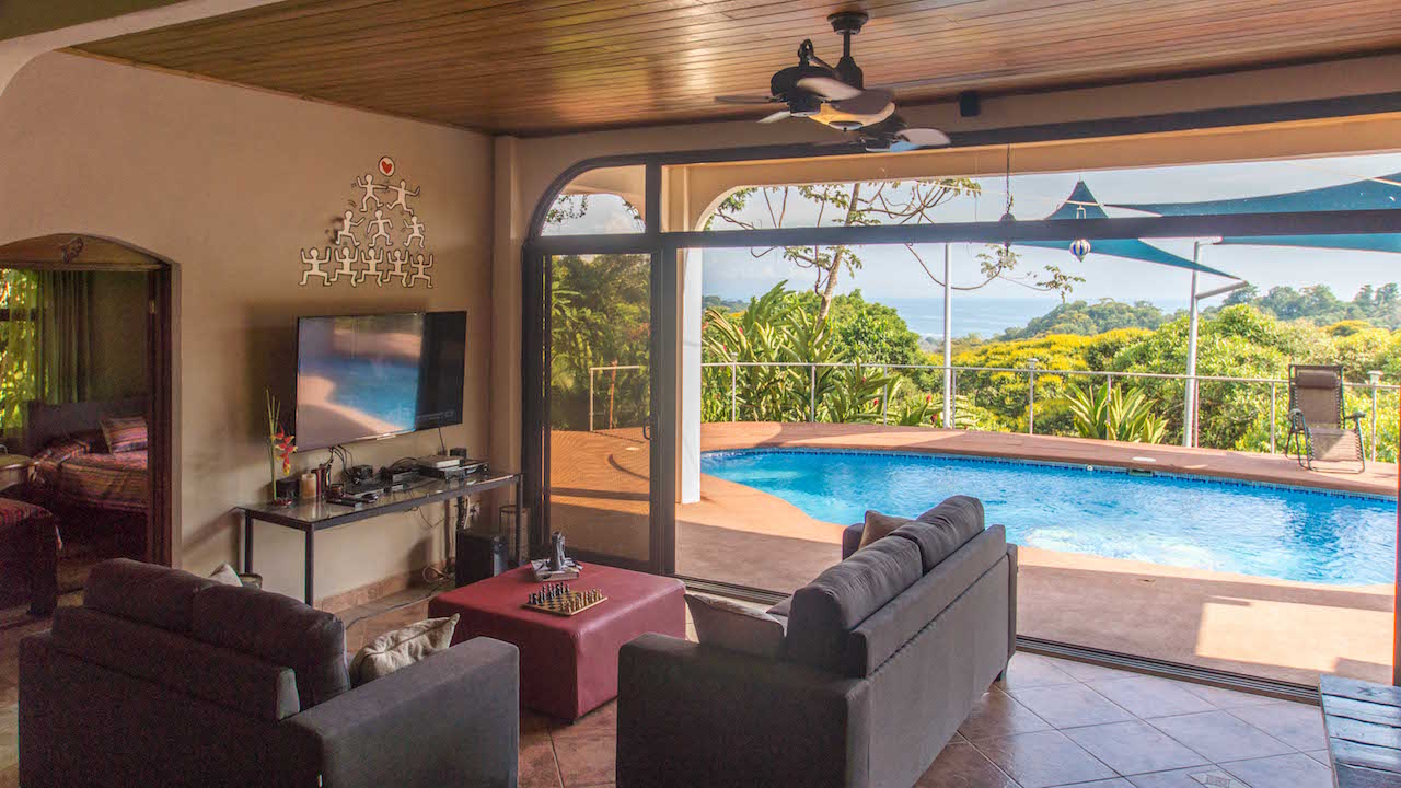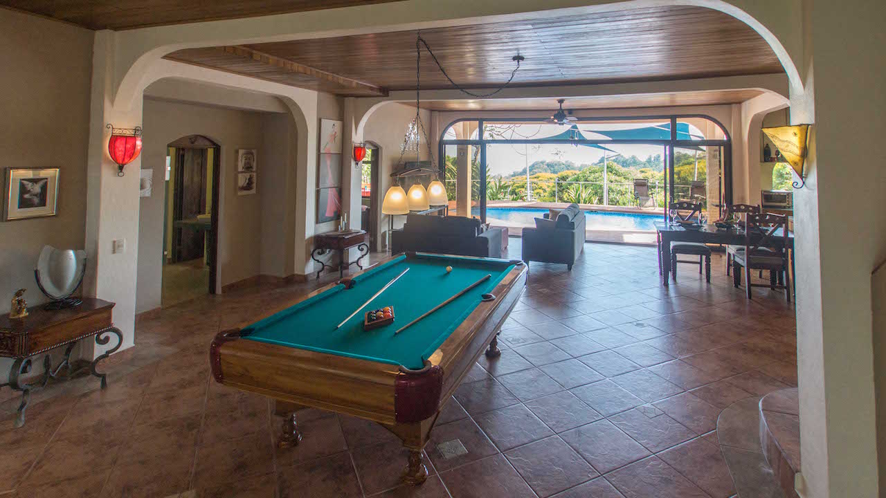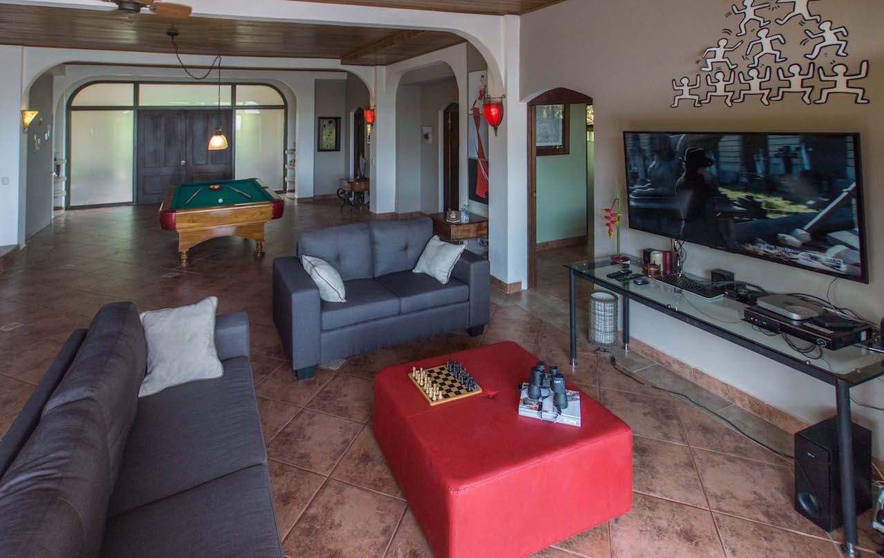 An indoor recreation and living area adjoin the outdoor pool and terrace area, and is furnished with a full-sized, handmade solid teak pool table crafted by a local architect and woodworker in Puriscal. The high-end entertainment system is surrounded by a new couch set and the walls are adorned with an eclectic art collection ranging from modern abstract to Klimt prints.