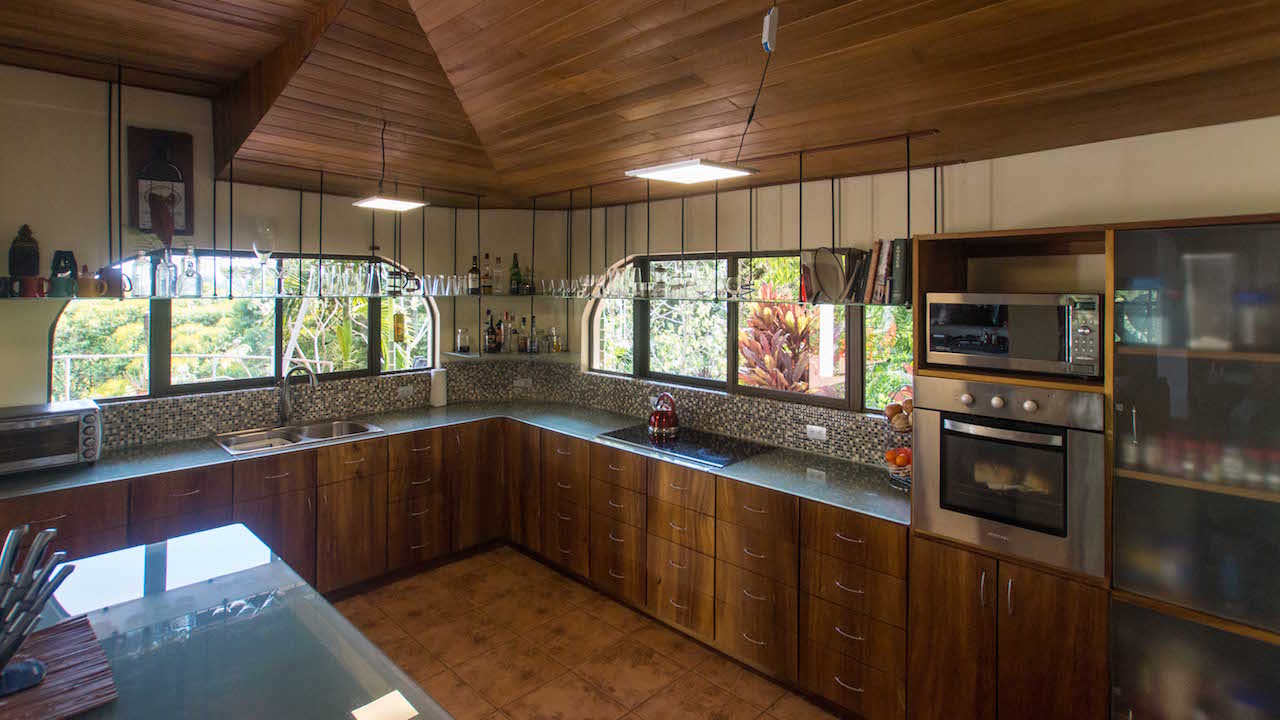 A fantastically functional kitchen is adjacent to the living space, with ample tempered glass countertops, gorgeous mosaic tile backsplash, and plentiful glass shelving lining the entire square space, making for a quick and convenient reach to your most used kitchen items. All of the appliances are top of the line, stainless steel with a mirrored front Samsung refrigerator, positioned so that you can see the Pacific Ocean from any spot in the kitchen. The cupboards are made with locally-sourced handmade solid guanacaste wood, opening and closing smoothly along seamless rollers which are a pleasure to use and abundantly plentiful. Looking out your kitchen window while making your loved ones a meal will be a pleasure that will fill you with the spice of life. Additionally, the fertile land that surrounds this home will provide you the opportunity to grow your own fresh foods, herbs and spices, making for an easy reach to the most nutritious lifestyle.