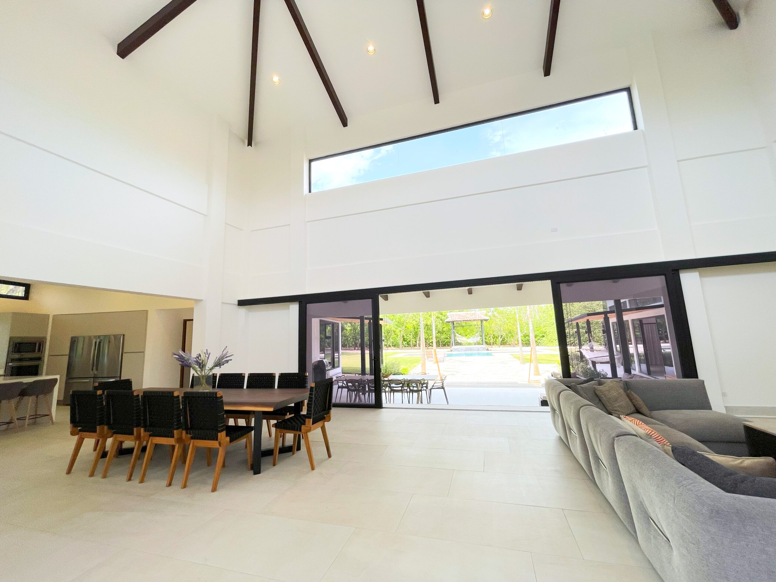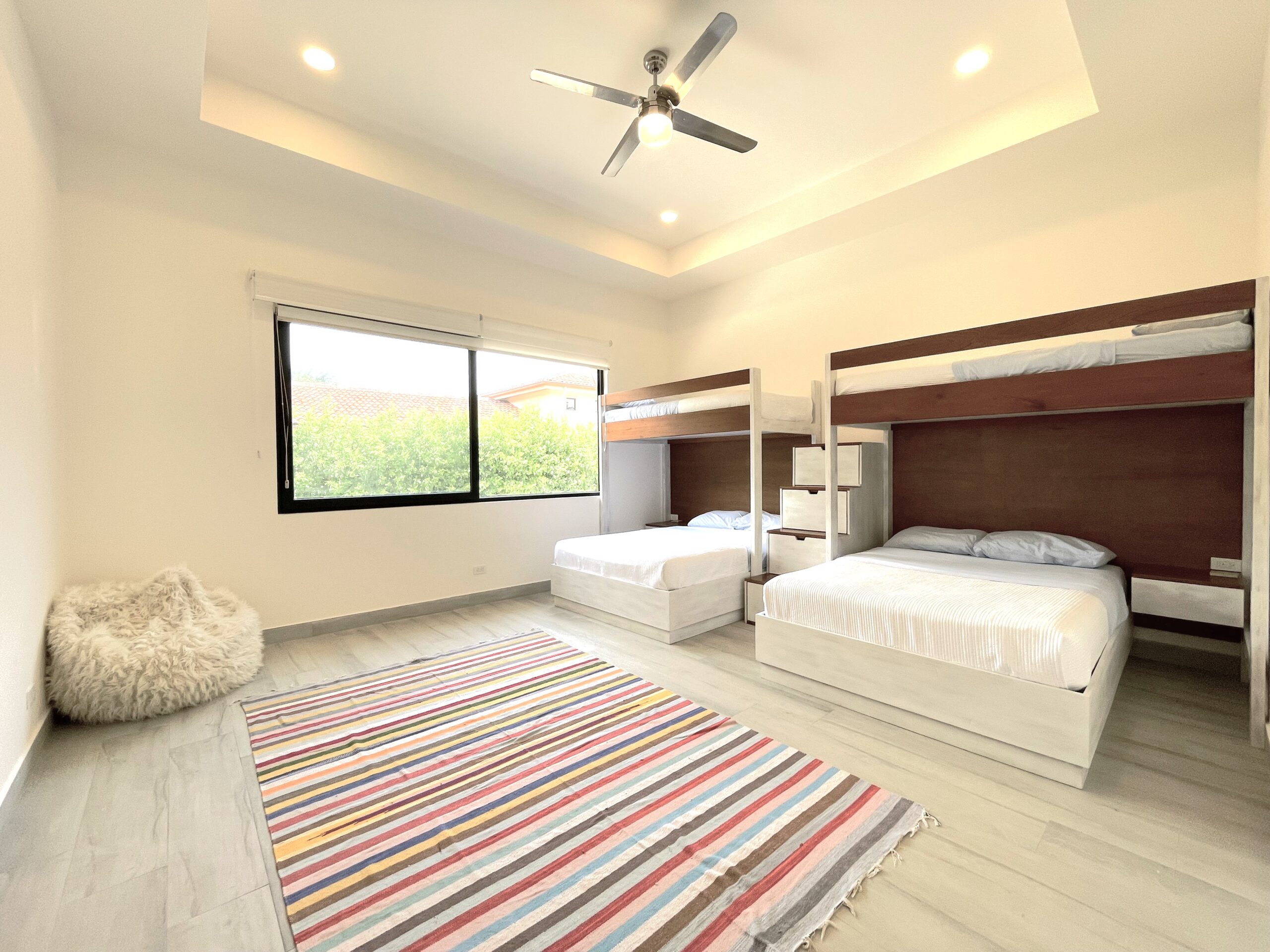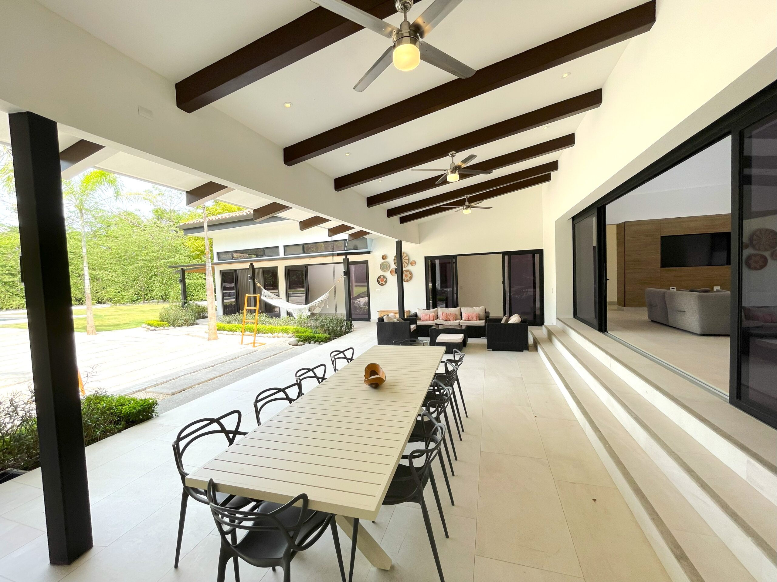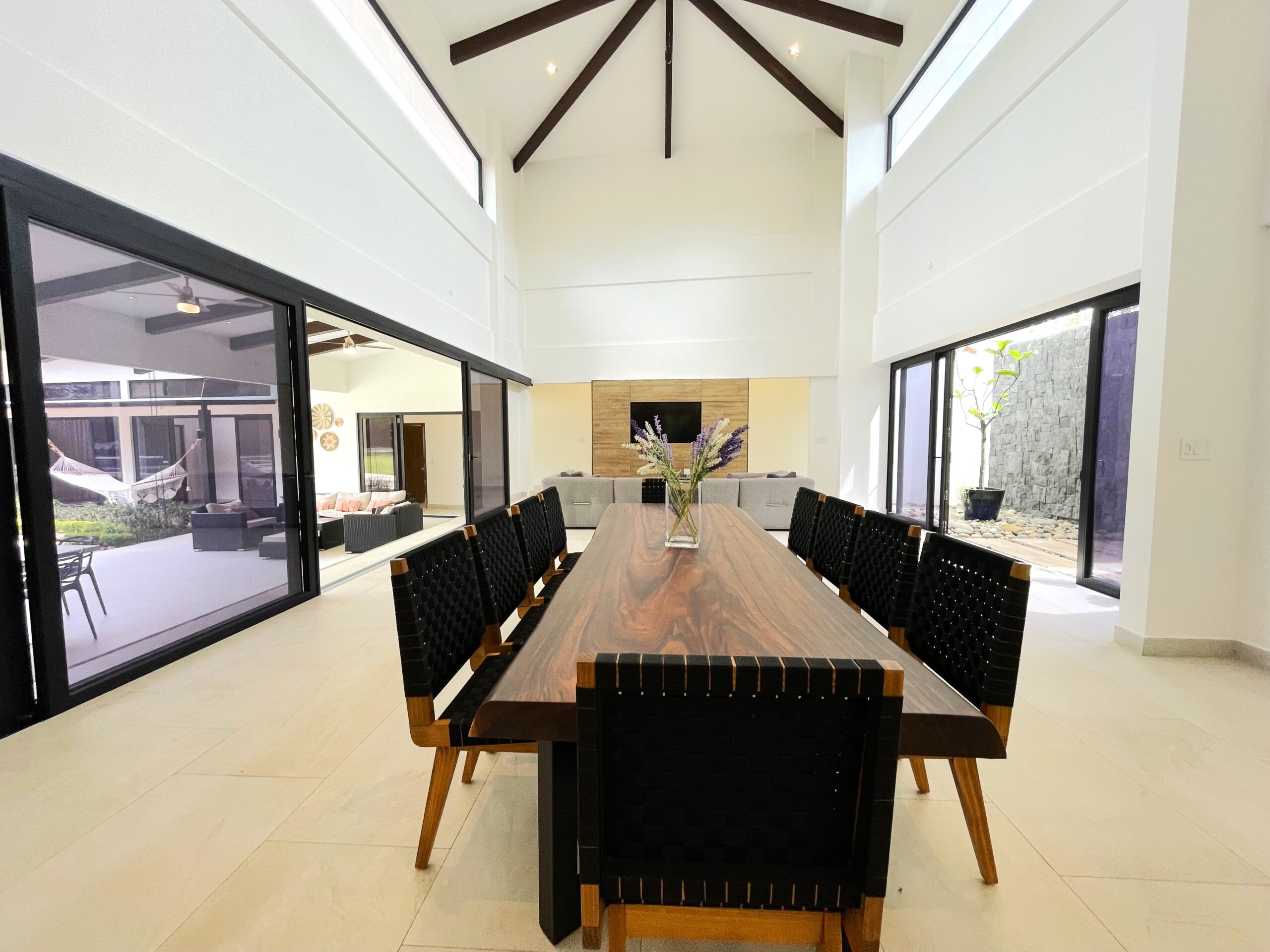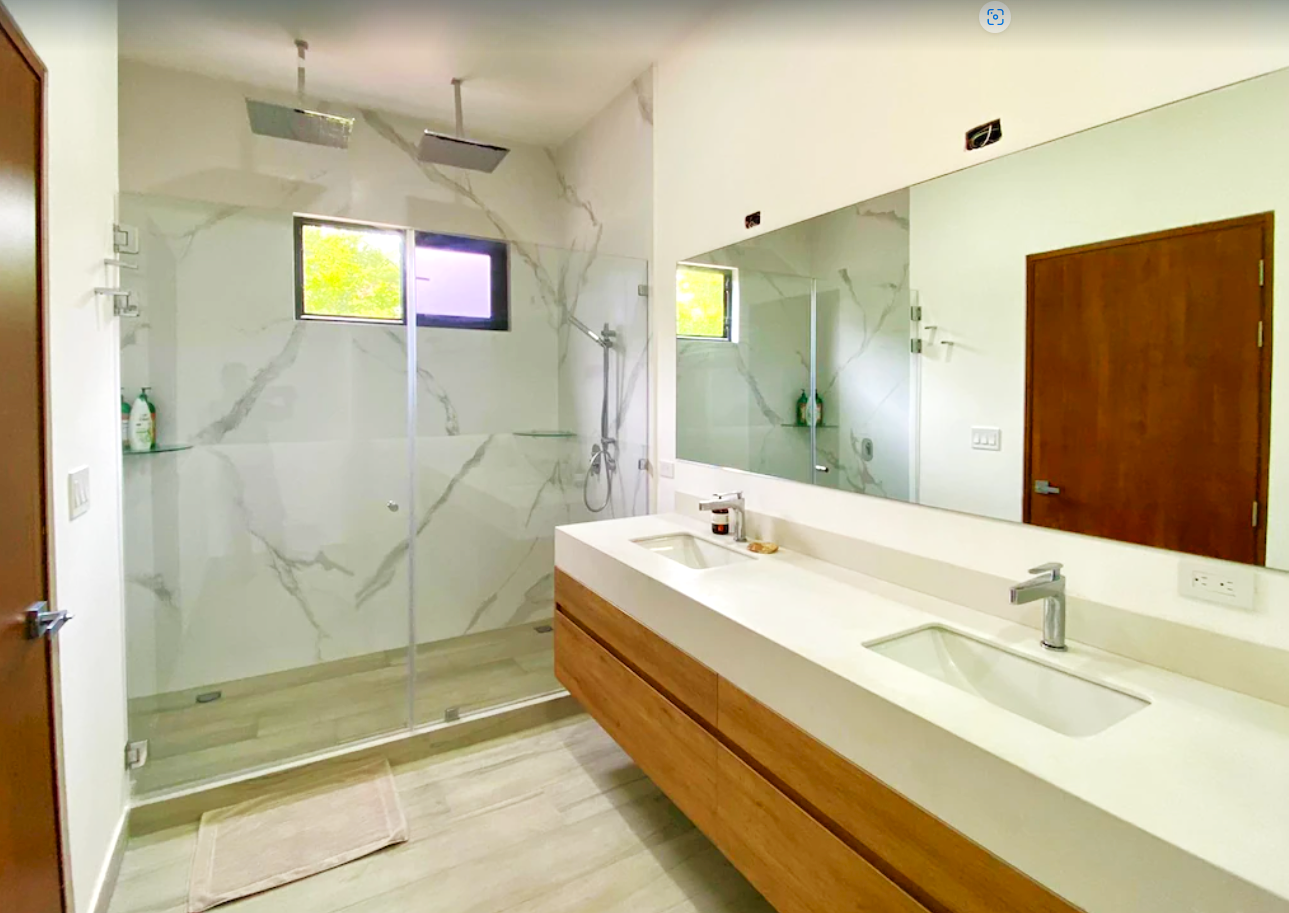 Casa Respiro, located in the luxurious beachfront community of Las Golondrinas in Hacienda Pinilla, is a true gem. This 4-bedroom, 4.5-bath home, along with a maid's quarters, stands out for its spacious design, high-quality finishes, and beautiful social areas and garden. Upon entering, you're greeted by an internal garden that brings a tropical feel, followed by a spacious living and dining room with high ceilings and plenty of natural light. The fully equipped chef's kitchen is designed to host large gatherings, featuring double refrigerators. The bedrooms include two with bunk beds and ensuite bathrooms, a master suite with a terrace, walk-in closet, double showers, and double vanity sinks, and another guest room with a private bathroom.
