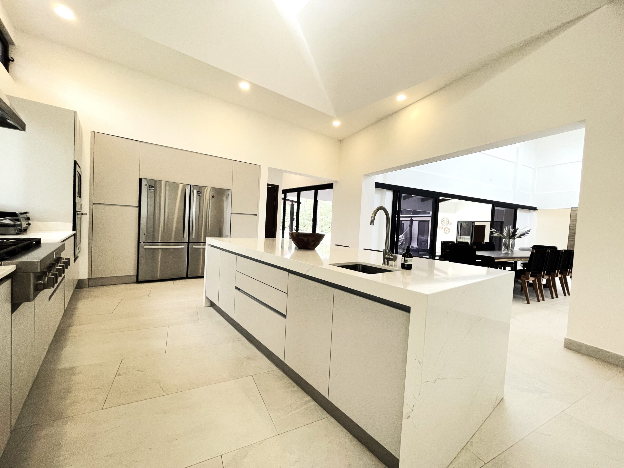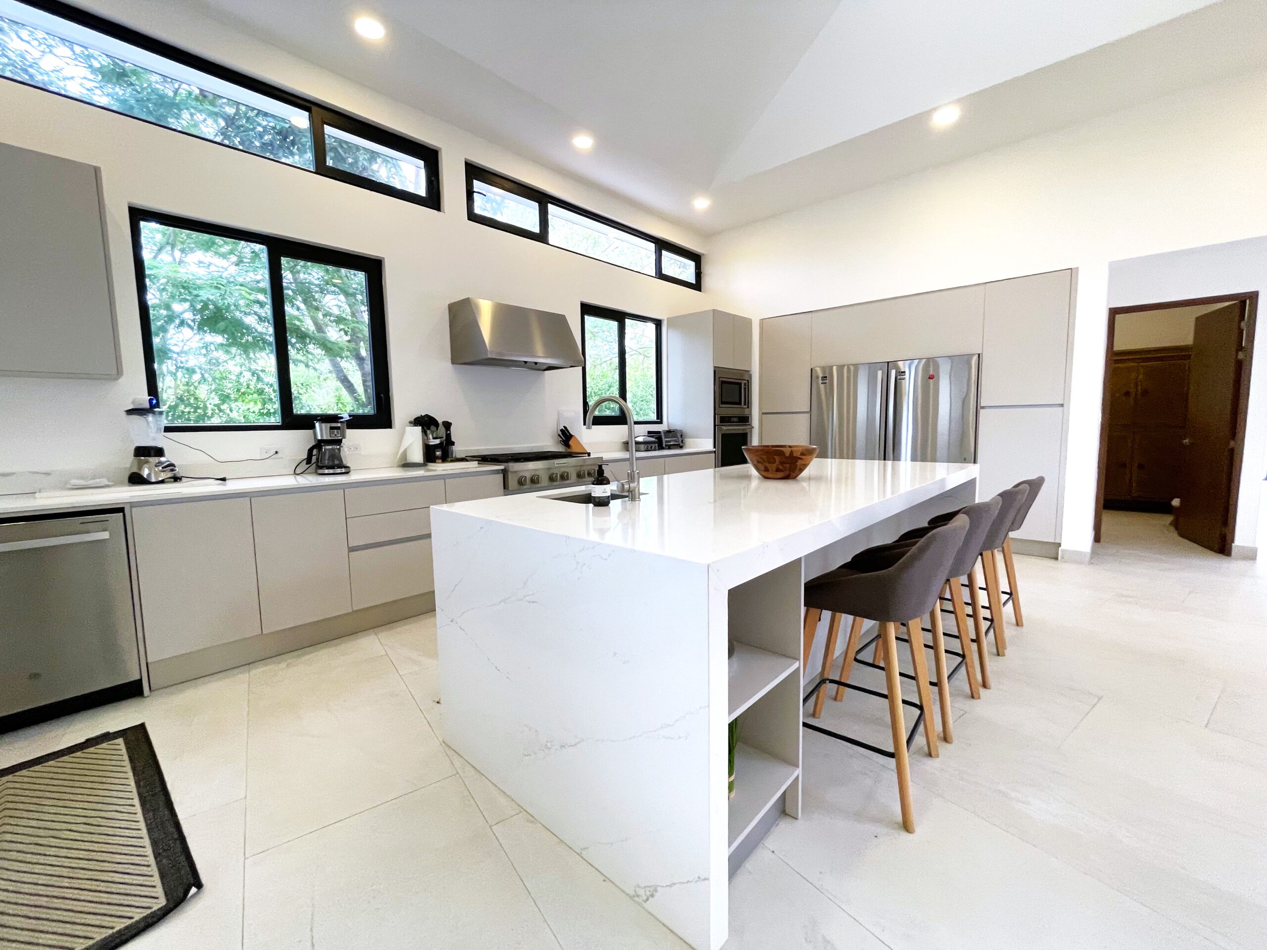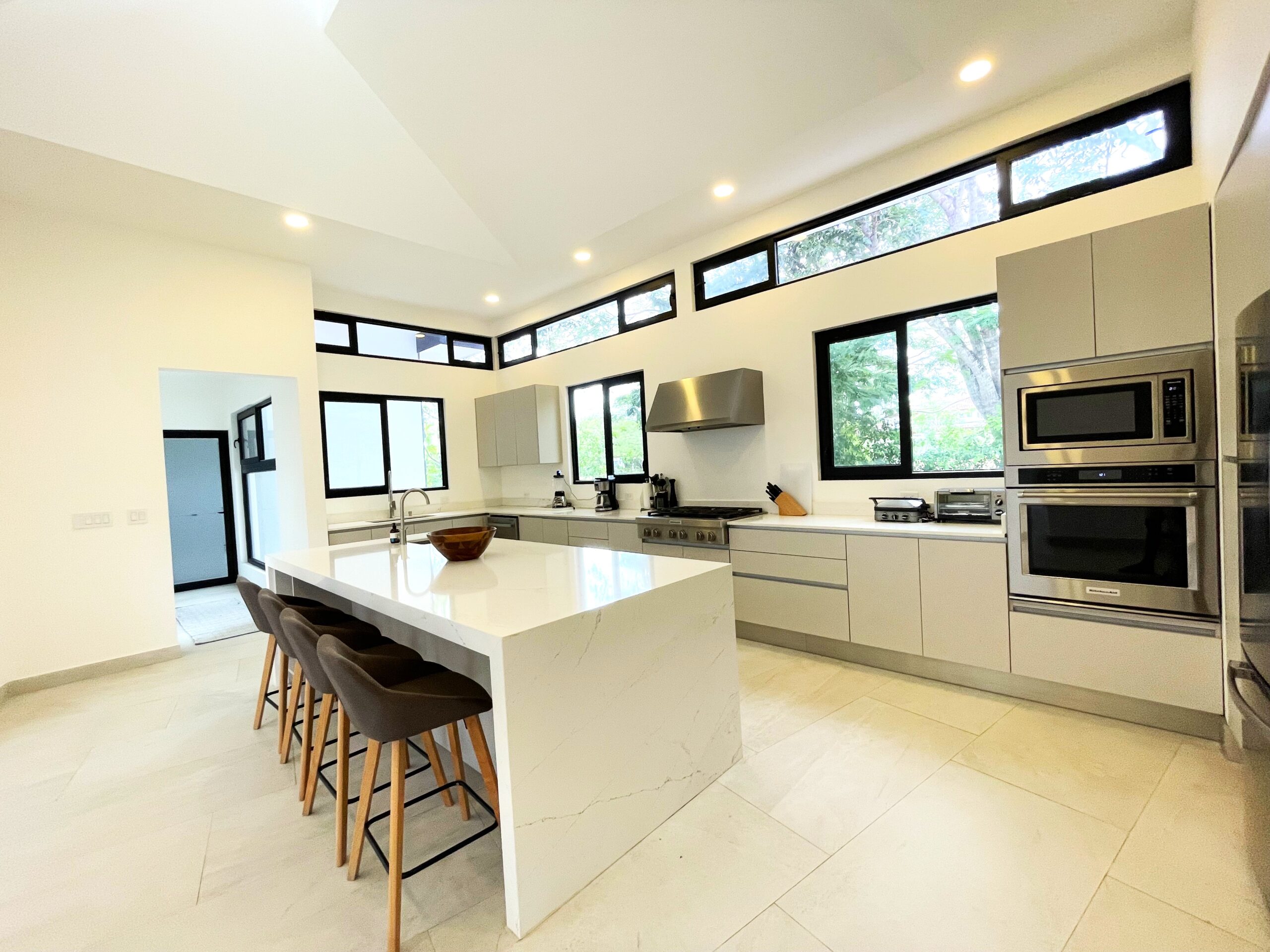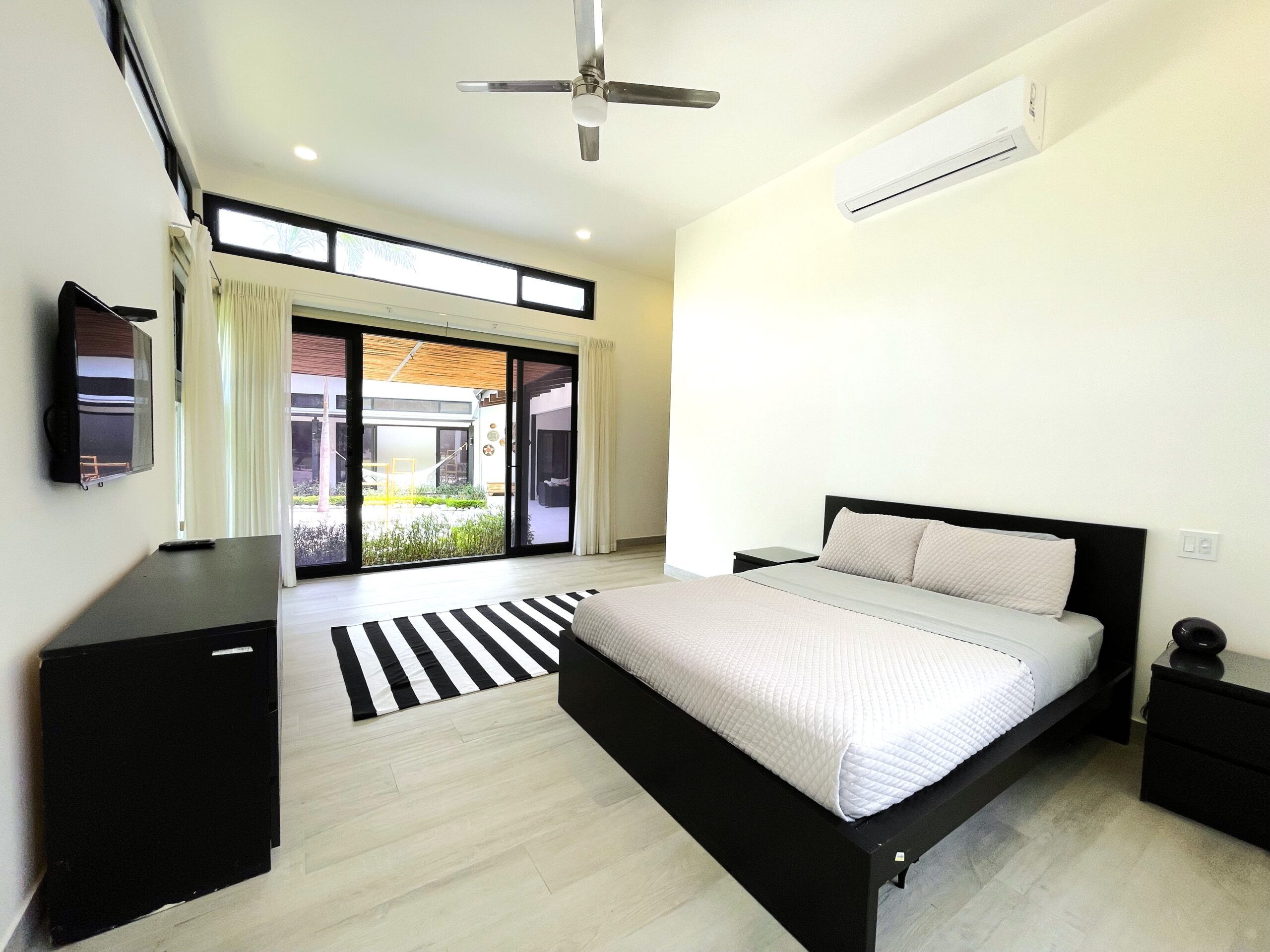 Casa Respiro, located in the luxurious beachfront community of Las Golondrinas in Hacienda Pinilla, is a true gem. This 4-bedroom, 4.5-bath home, along with a maid's quarters, stands out for its spacious design, high-quality finishes, and beautiful social areas and garden. Upon entering, you're greeted by an internal garden that brings a tropical feel, followed by a spacious living and dining room with high ceilings and plenty of natural light. The fully equipped chef's kitchen is designed to host large gatherings, featuring double refrigerators. The bedrooms include two with bunk beds and ensuite bathrooms, a master suite with a terrace, walk-in closet, double showers, and double vanity sinks, and another guest room with a private bathroom.