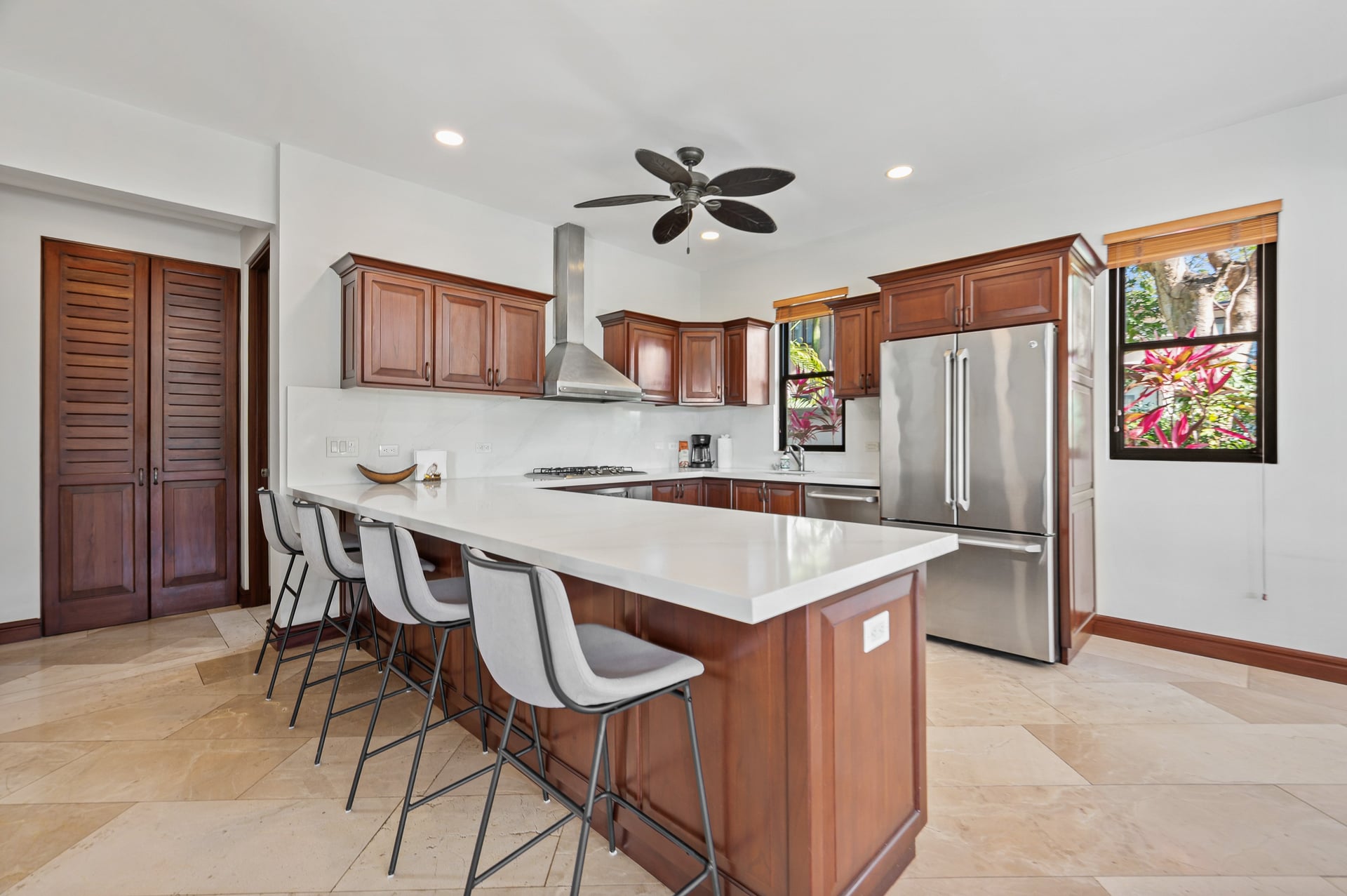 The open-concept layout seamlessly connects the living, dining, and kitchen areas, centered around a modern kitchen with a generous island, and flowing effortlessly toward covered terraces, a private swimming pool, and lush tropical gardens. These indoor-outdoor spaces are ideal for entertaining, relaxing, or simply enjoying the peaceful surroundings and warm ocean breezes.