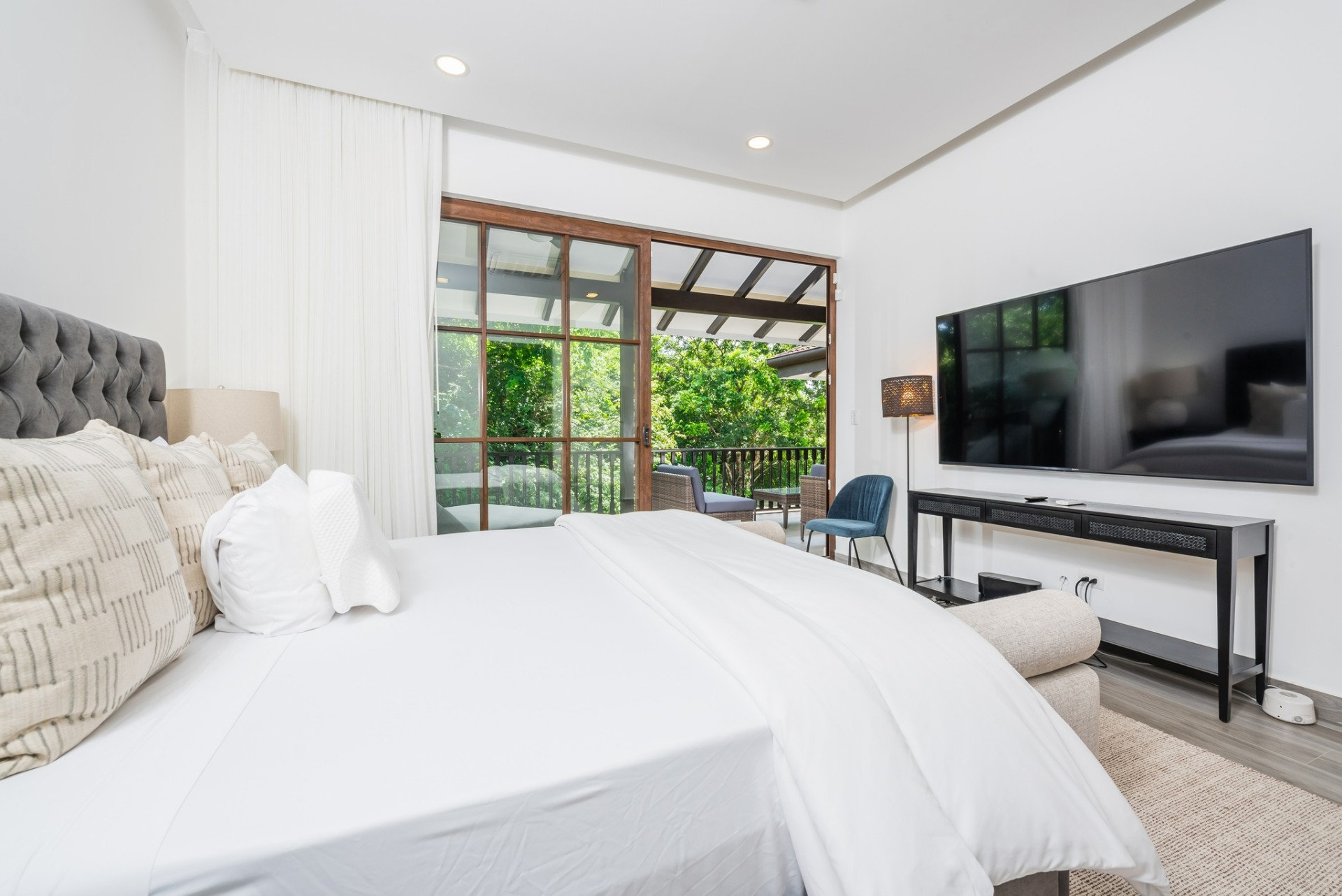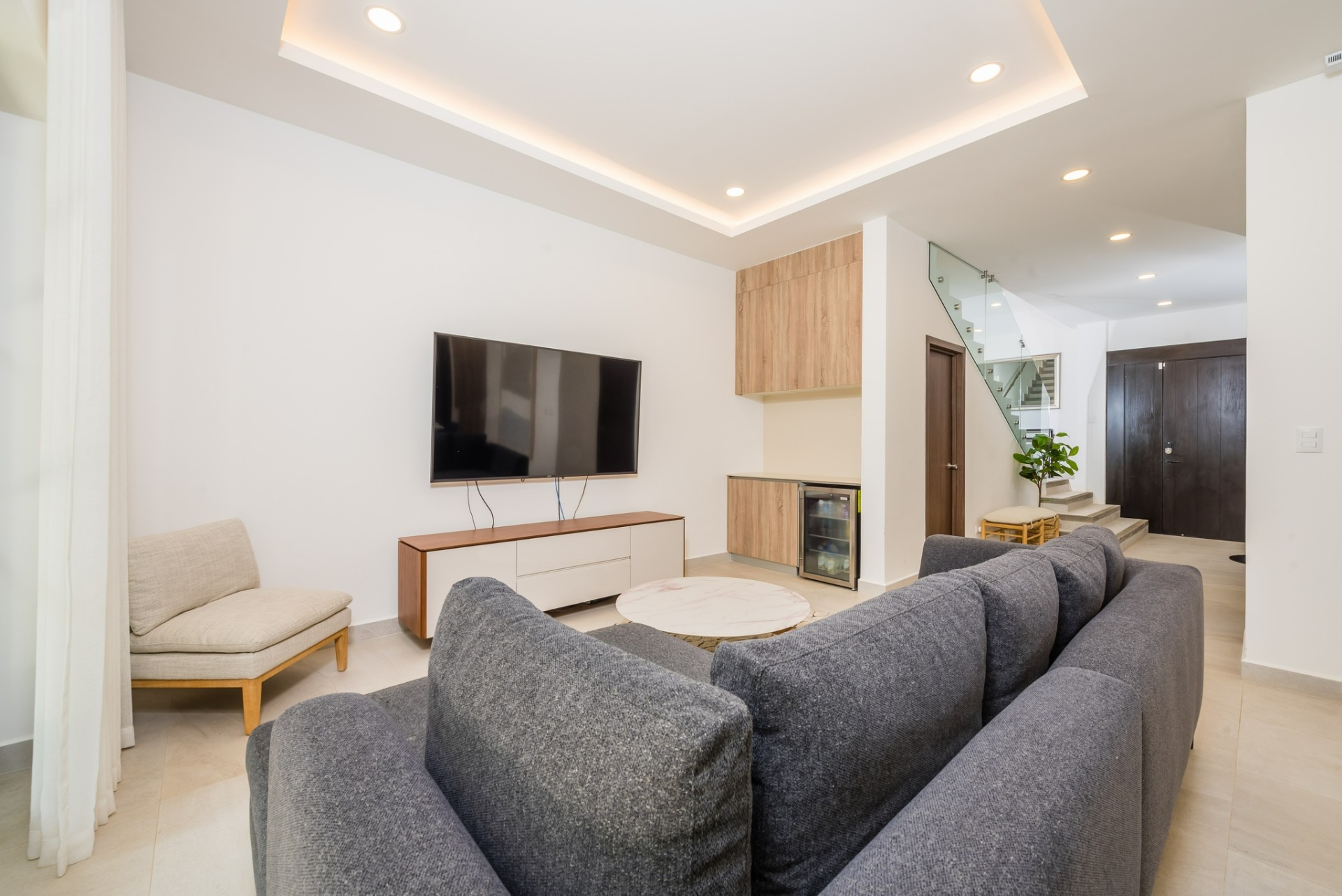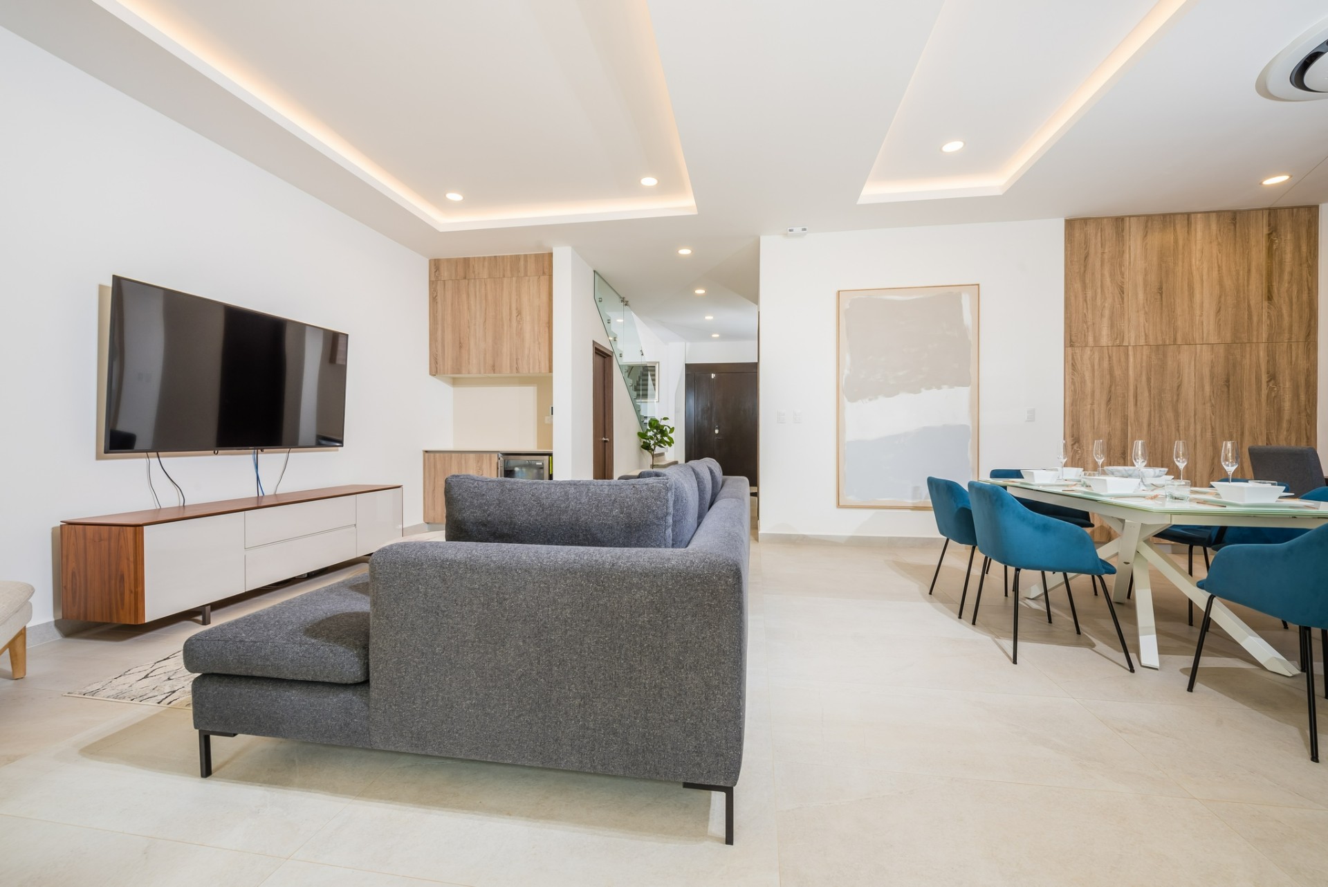 Inside, the home opens to a bright, open-concept living and dining area finished in a calm, neutral palette that enhances natural light throughout. Large sliding glass doors connect the interior seamlessly to the lush garden surroundings, allowing the outdoors to flow effortlessly into the living spaces. The dining area is thoughtfully arranged for hosting family and guests, while the adjacent living room offers a comfortable and welcoming space for everyday living. Recessed lighting and clean ceiling details add a refined, modern touch.
