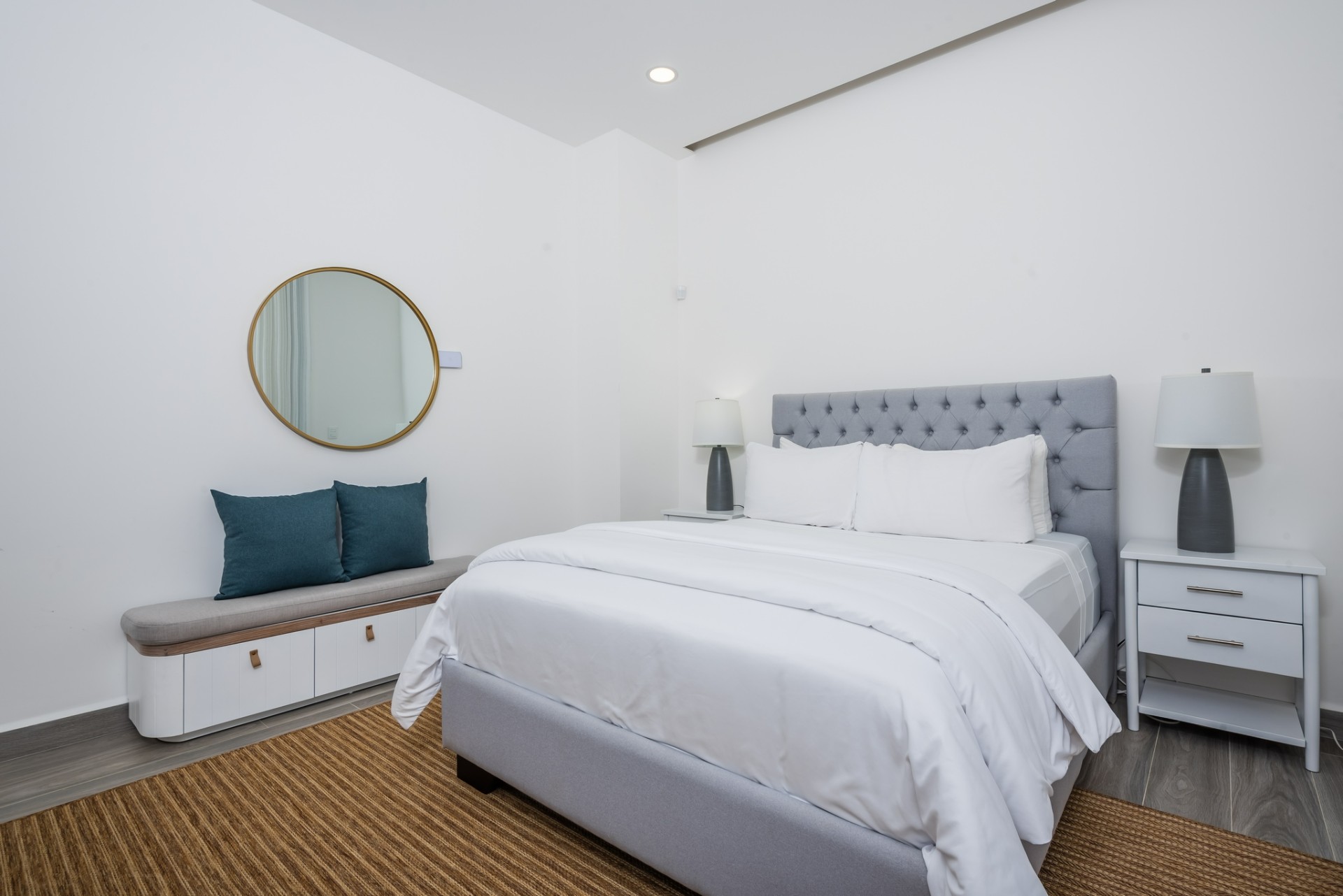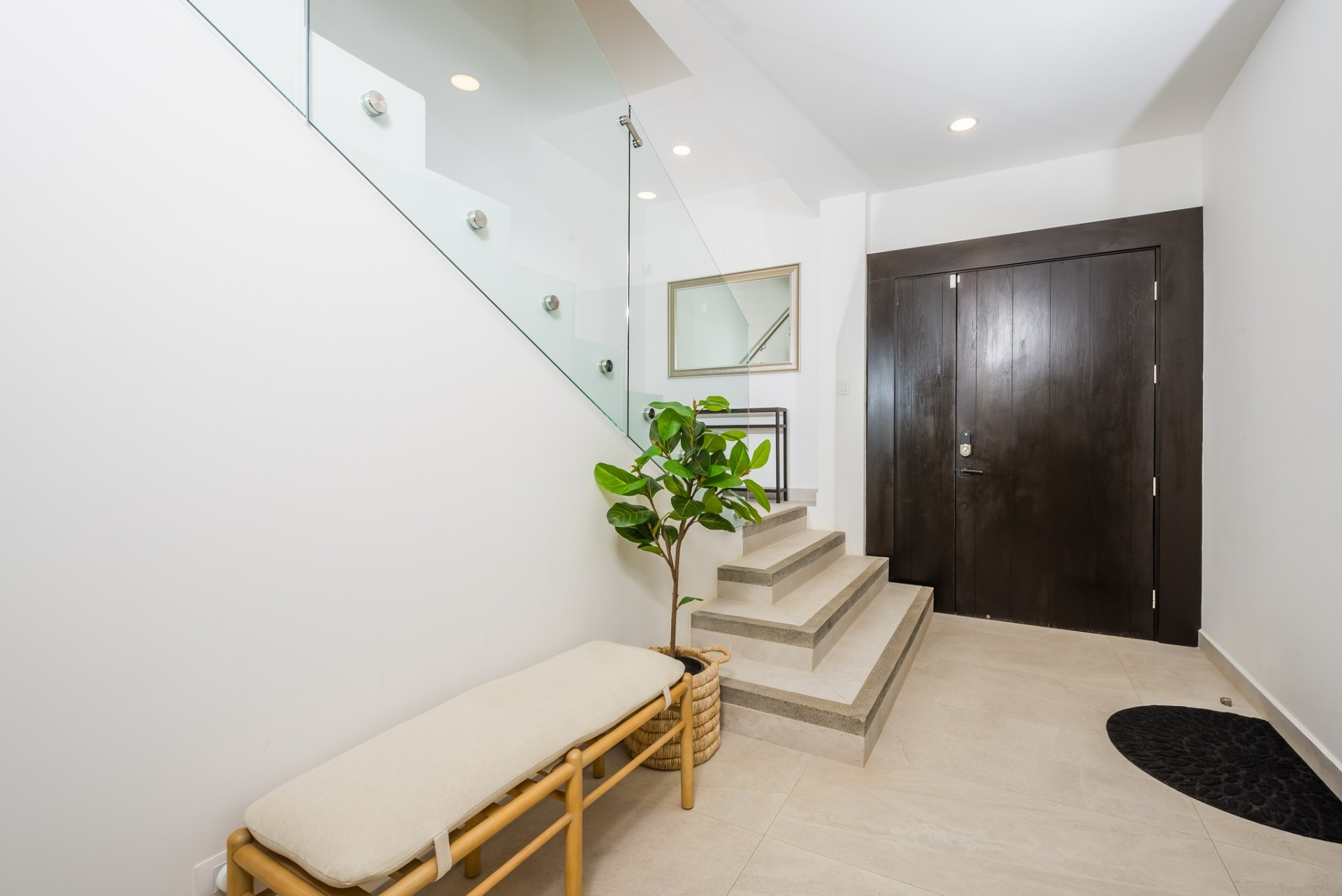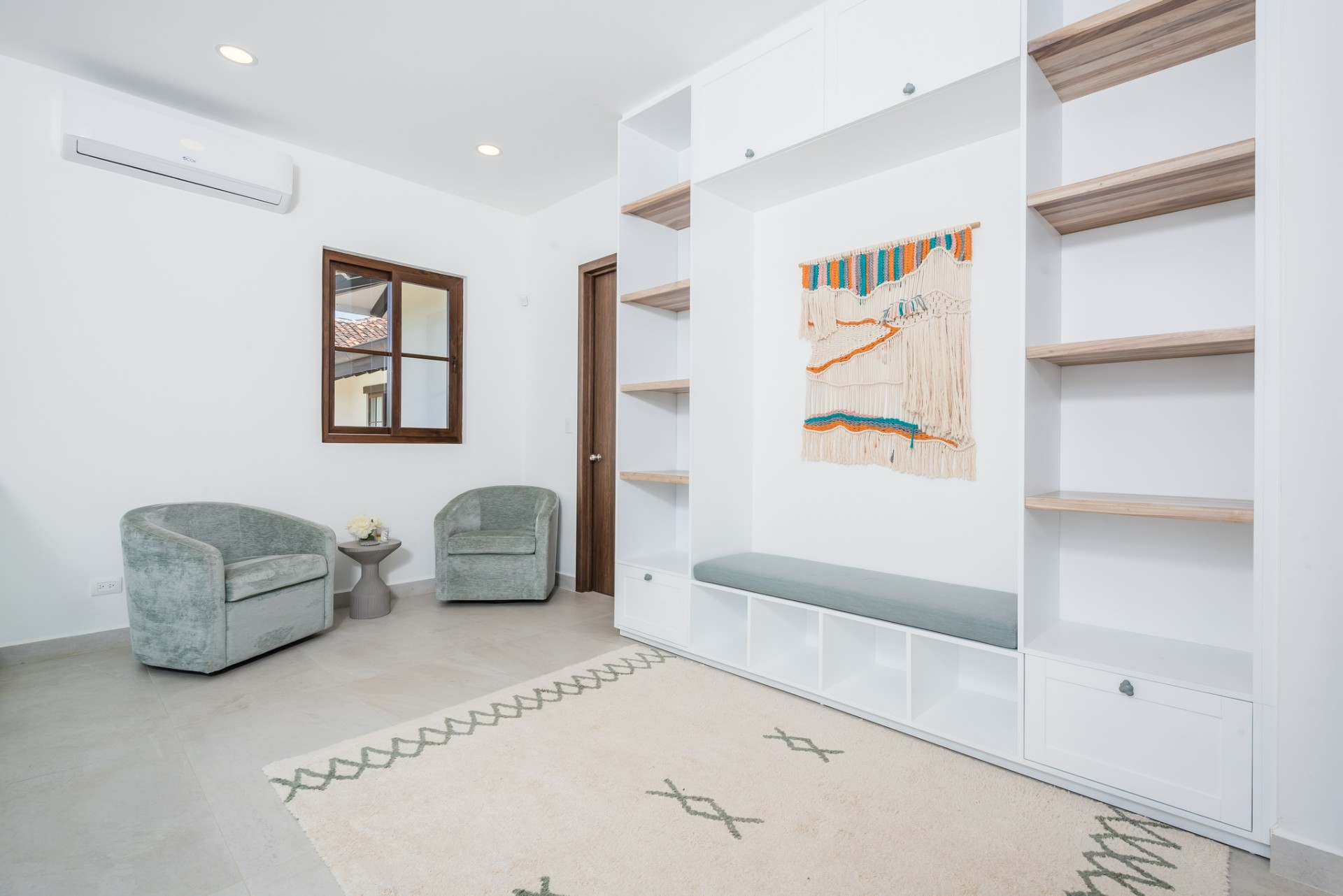 Inside, the home opens to a bright, open-concept living and dining area finished in a calm, neutral palette that enhances natural light throughout. Large sliding glass doors connect the interior seamlessly to the lush garden surroundings, allowing the outdoors to flow effortlessly into the living spaces. The dining area is thoughtfully arranged for hosting family and guests, while the adjacent living room offers a comfortable and welcoming space for everyday living. Recessed lighting and clean ceiling details add a refined, modern touch.