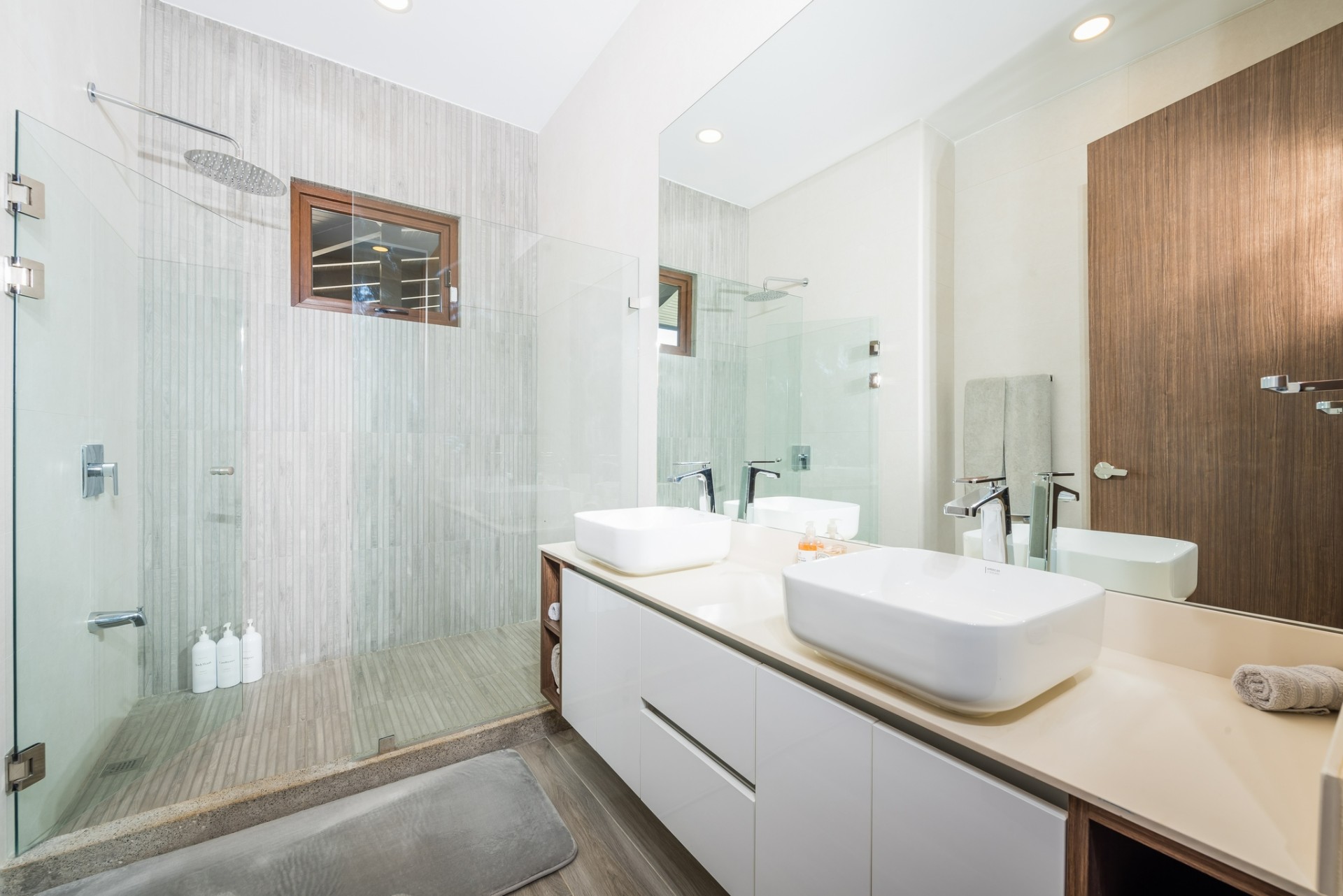 The residence features a striking exterior defined by clean white façades, rich dark wood accents, and expansive covered terraces on both levels. Wide roof overhangs and shaded outdoor living spaces highlight the home’s indoor–outdoor design, creating inviting areas for entertaining or relaxing in the warm coastal climate. Manicured landscaping, flowering plants, and mature trees frame the property, providing privacy and a serene tropical setting.