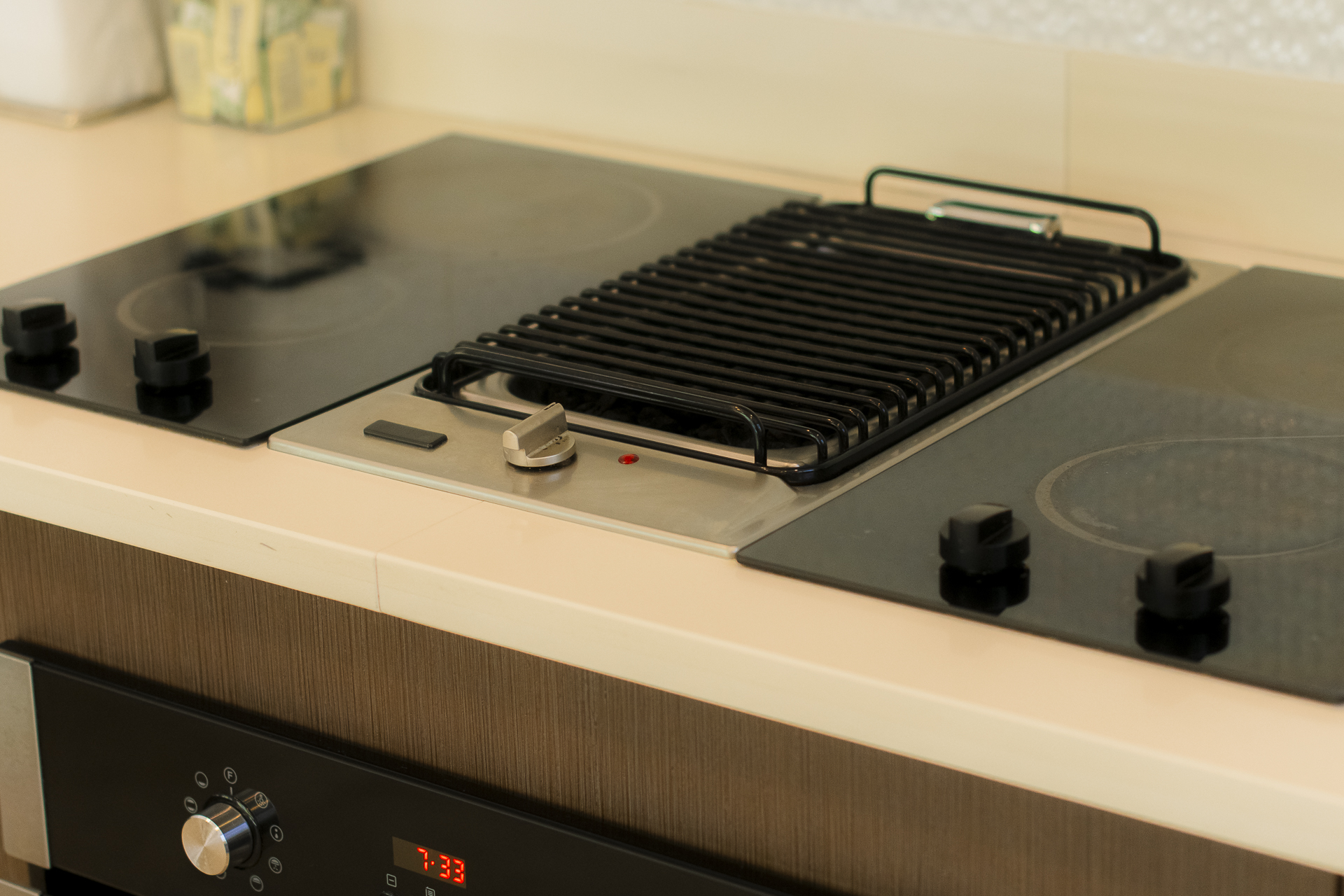 Quartz countertops, Electrolux fridge/freezer, indoor grill, bar seating for 6