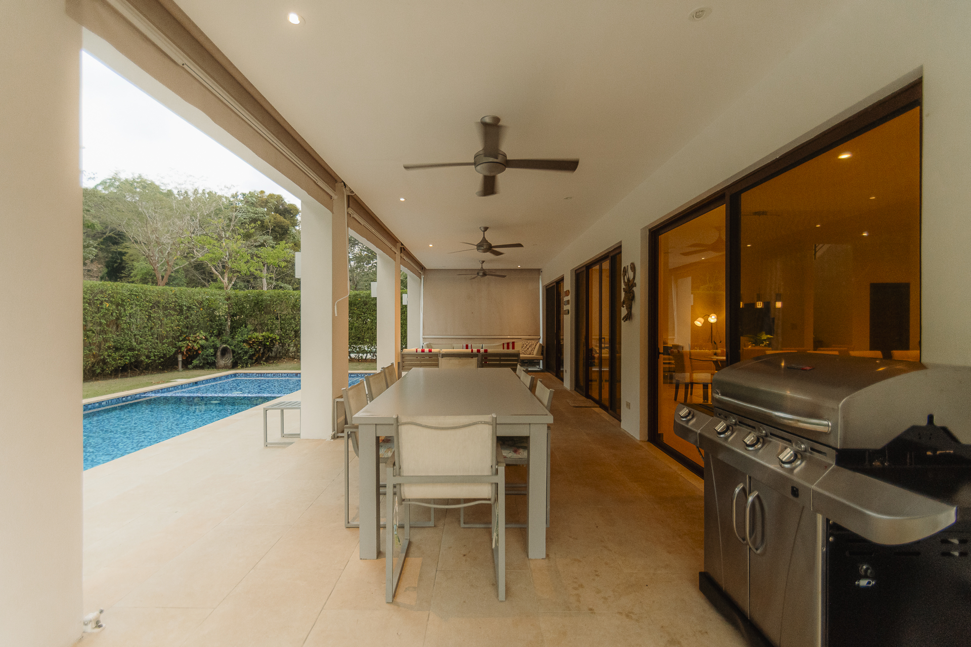 Covered lounge + dining area (seats 14+) with roll‑down privacy blinds