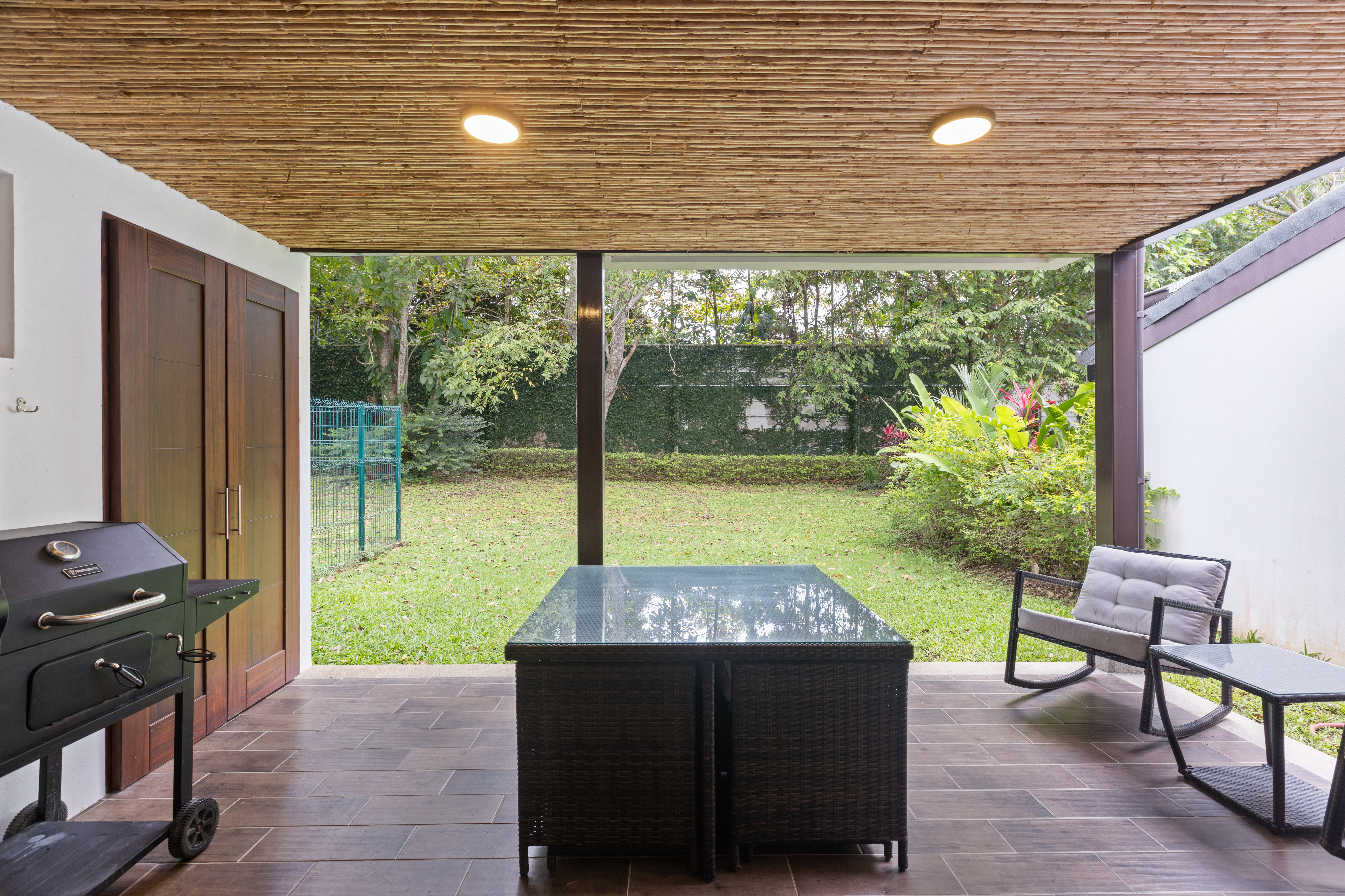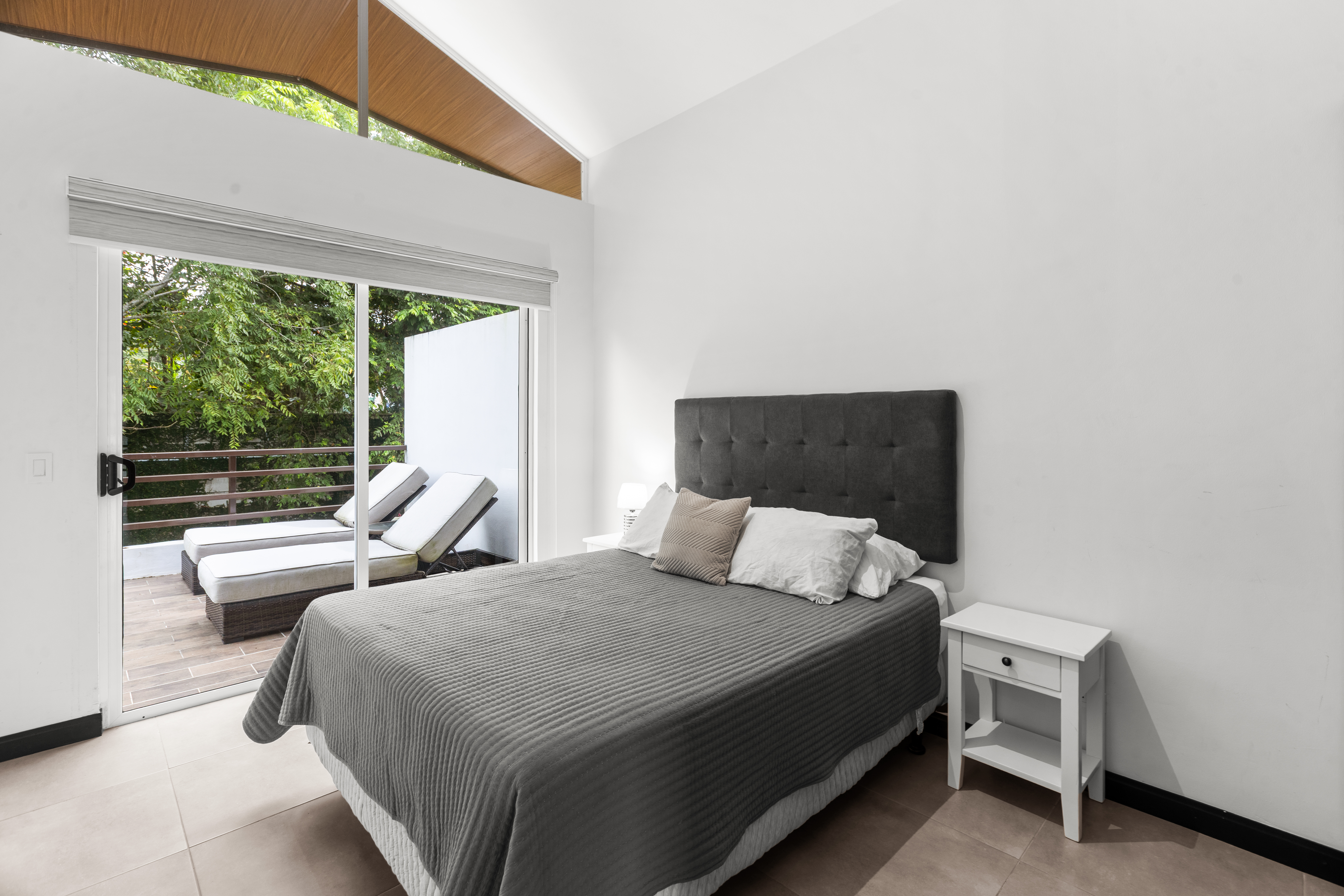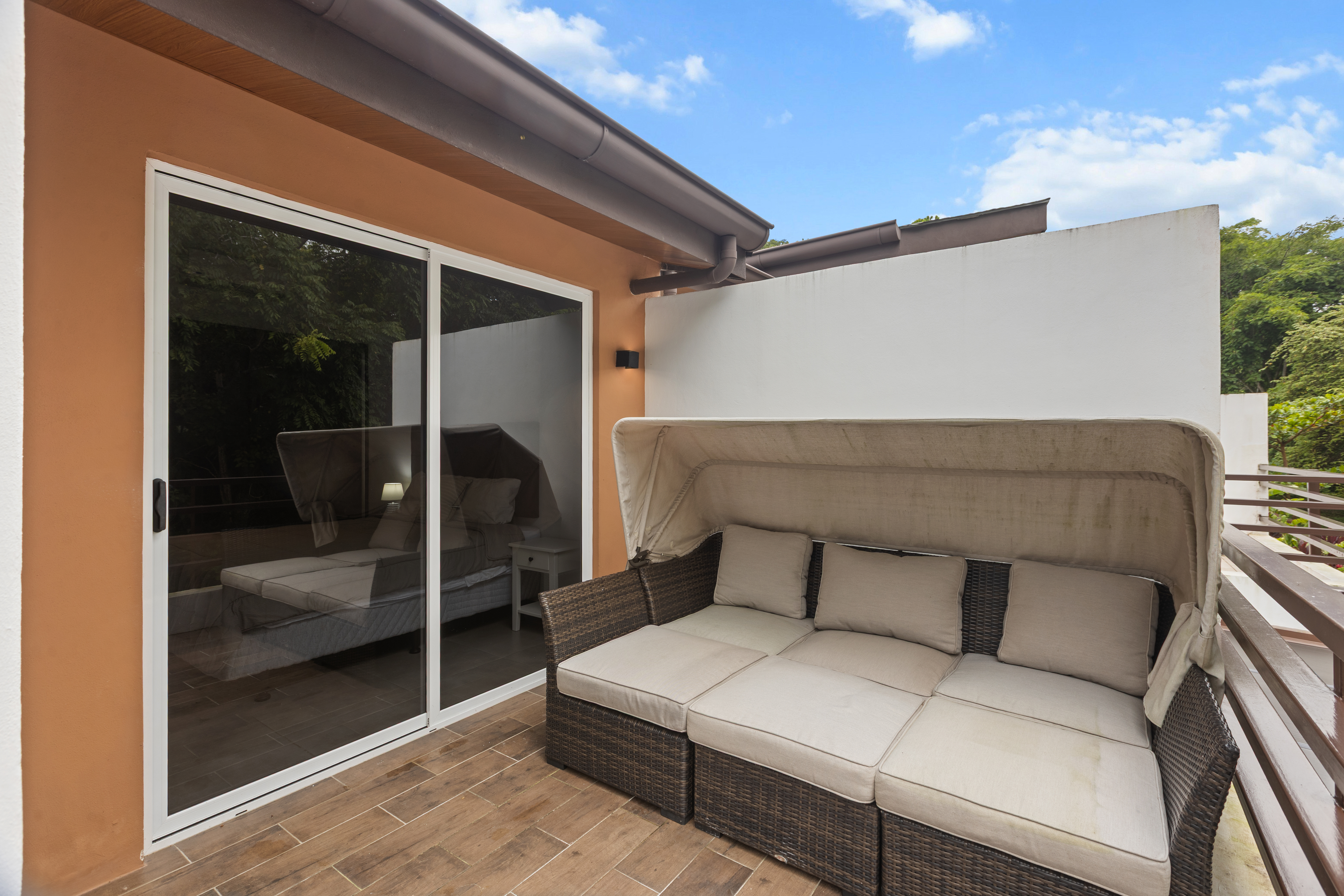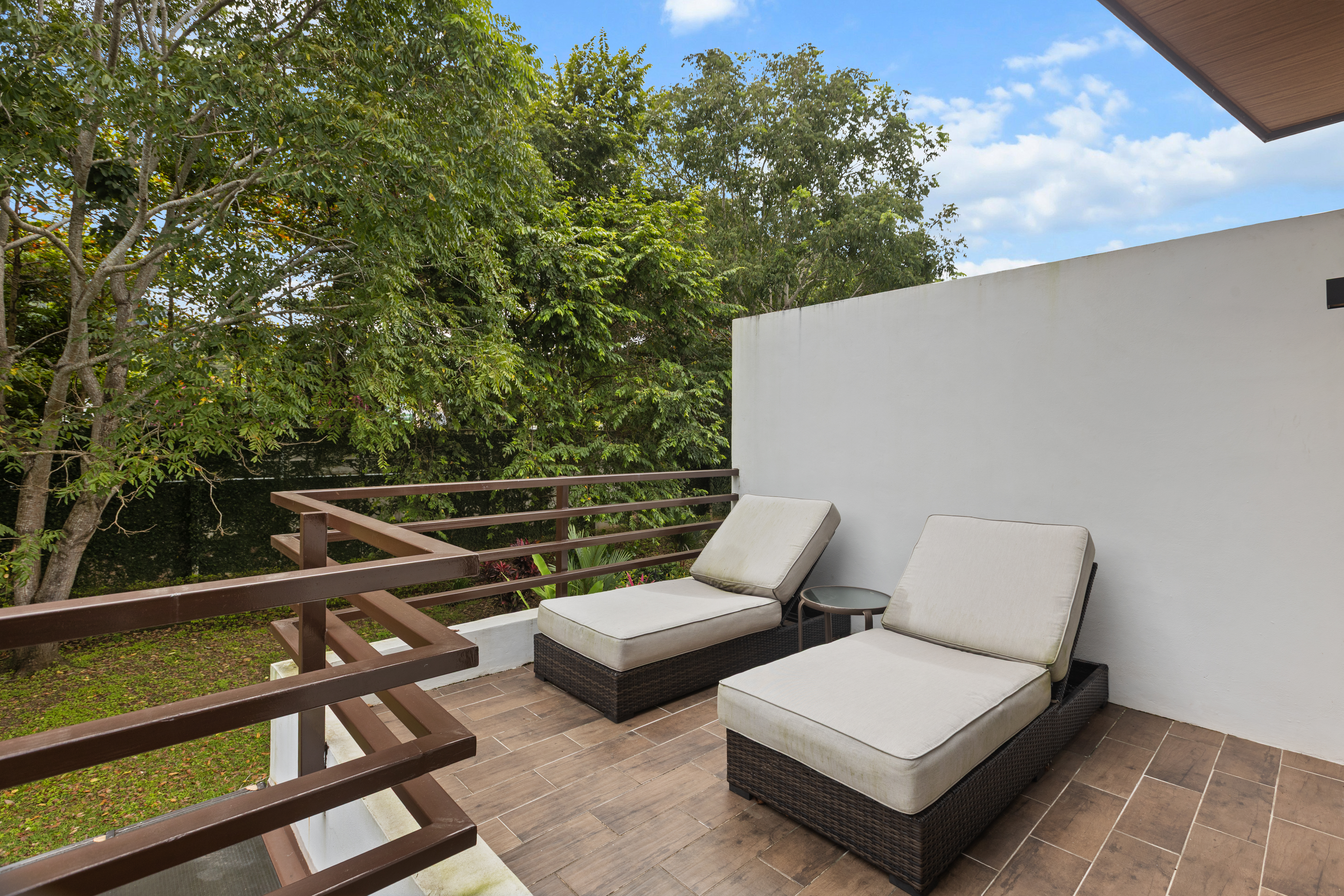 The home features two master bedrooms with ensuite bathrooms – one with a private balcony and the other on the ground floor with its own entrance, offering flexibility for multi-generational living, a large office, or multi-use space. The upstairs balcony is a highlight, outfitted with lounge chairs and surrounded by lush greenery, creating a tranquil retreat.