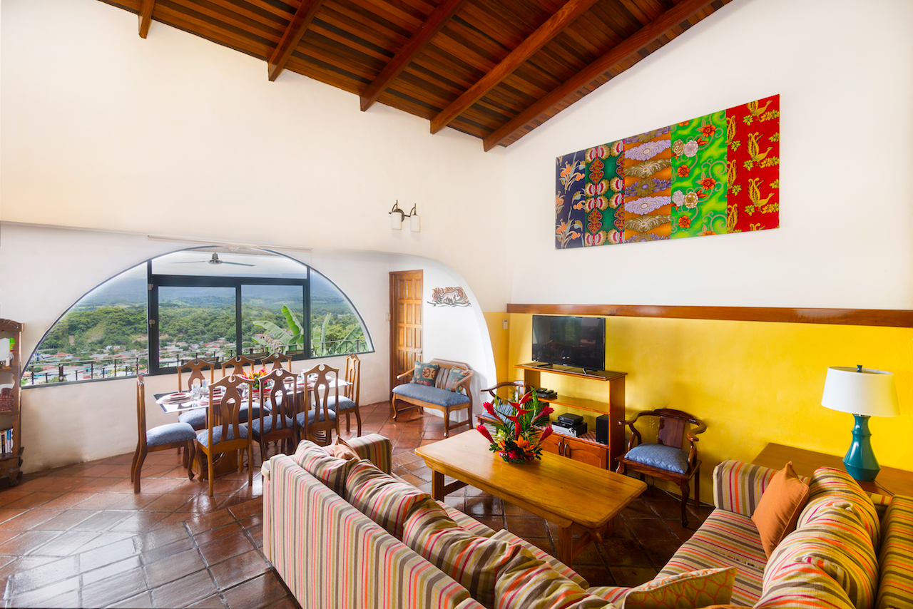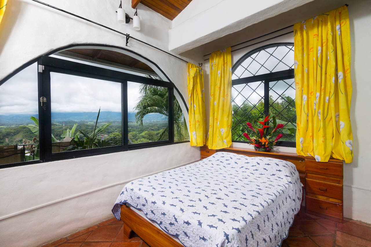 Casa Azul is conveniently located on the Manuel Antonio road about halfway between Quepos and Manuel Antonio. It is in a small development of lovely mediterranean style homes that blend a great location with amazing views and breezes. The main area is open and consists of the living, dining, and kitchen areas. There are many large Mediterranean style windows that provide a panoramic view. A door opens from the living area onto a full length balcony on the rear of the house. The views are amazing and go from breath taking mountain views to ocean and costal views that are hypnotizing.