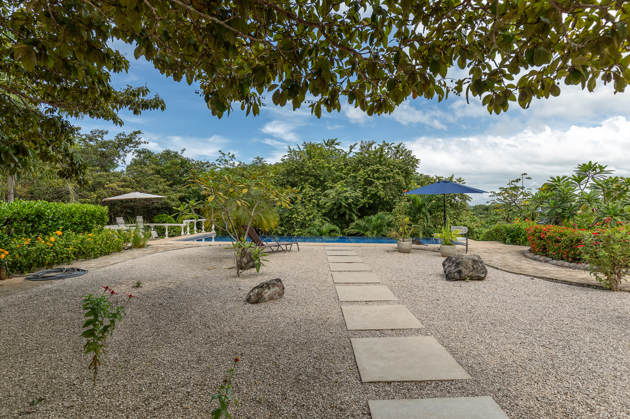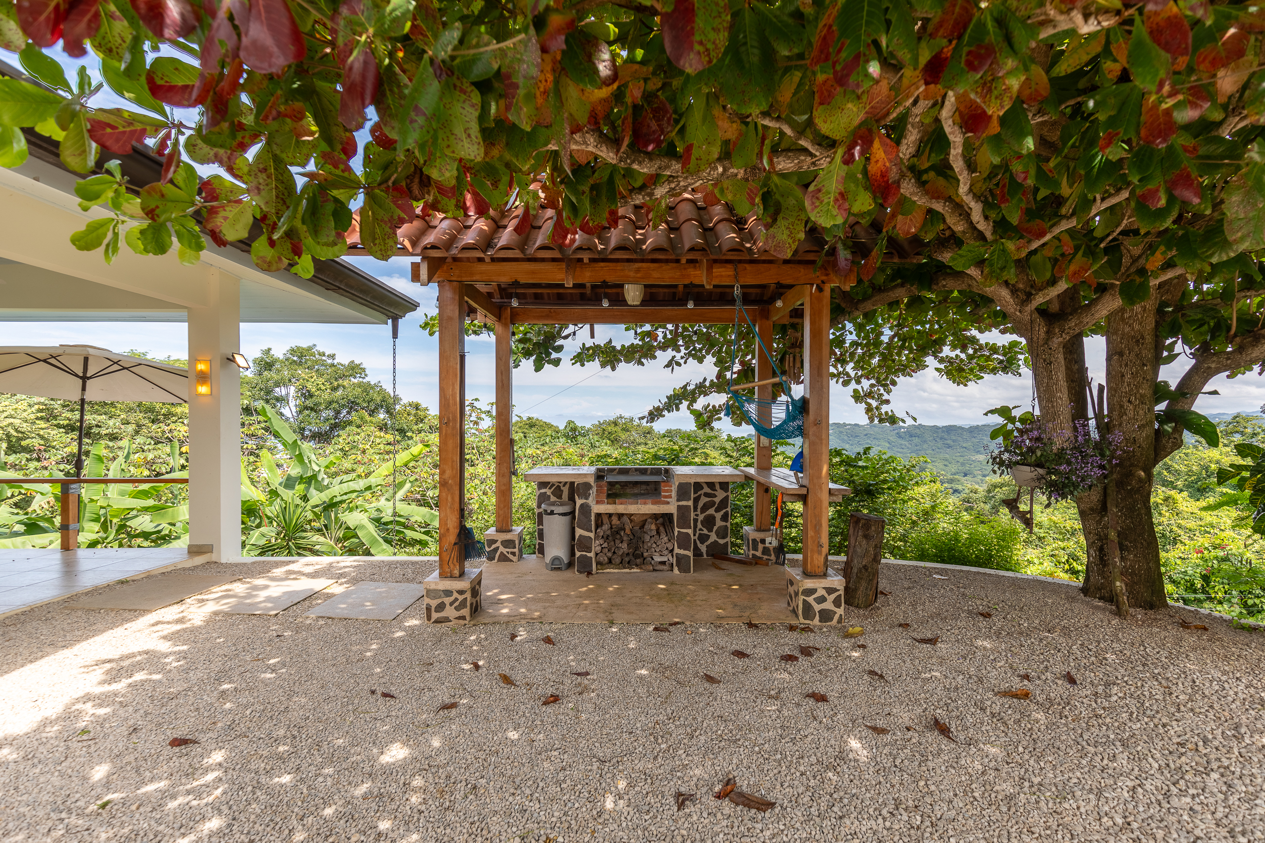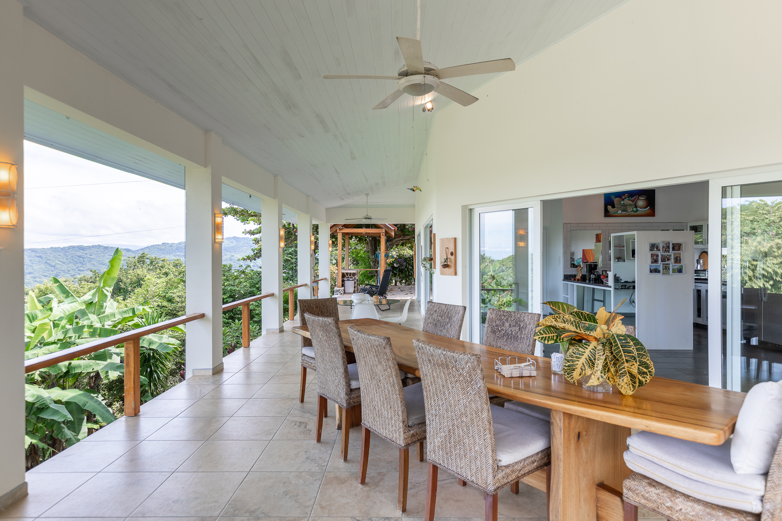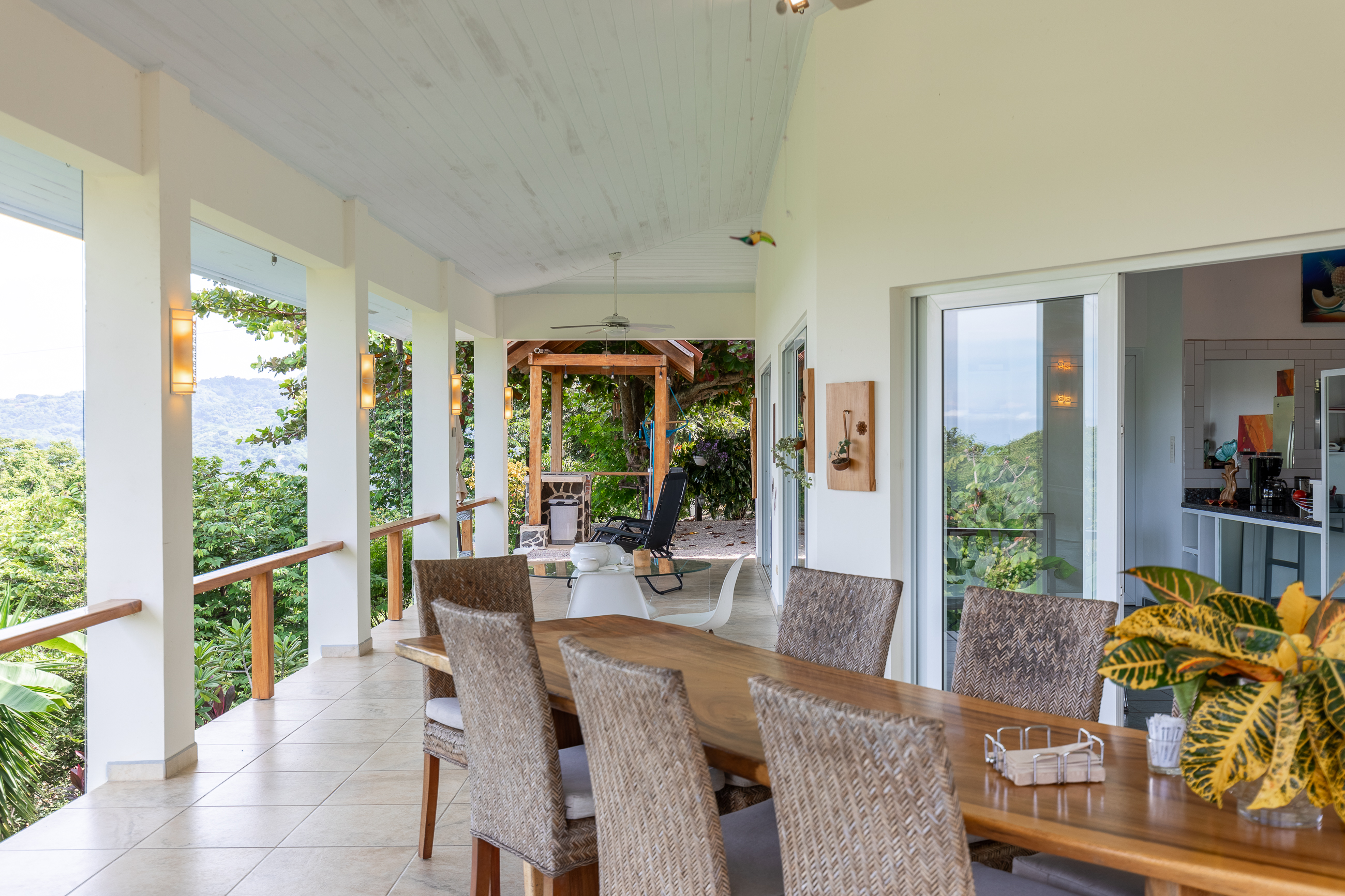 The house is divided into two structures; between them sits a pool, a beautifully manicured garden, and a sitting area with lots of native fruit trees attracting all sorts of local wildlife. The main house (structure #1) has a large patio with a spectacular view, a spacious kitchen and sitting area, and two bedrooms. The main room has its own private bath, and the guest room has a shared bath.