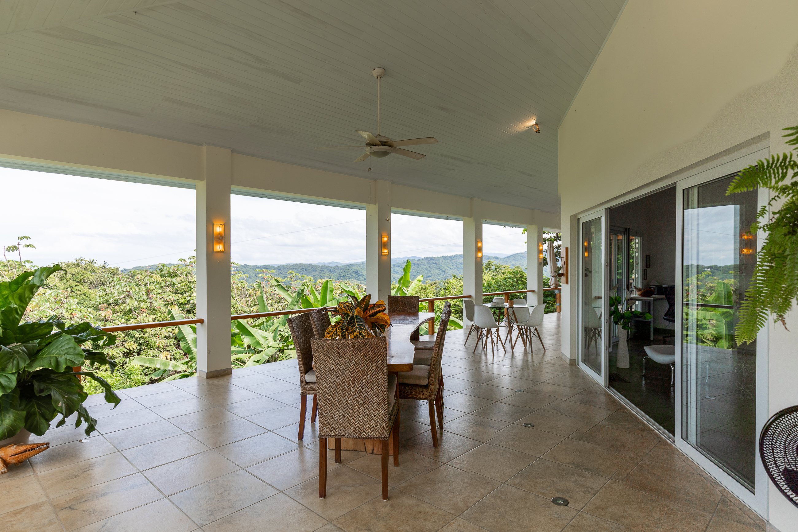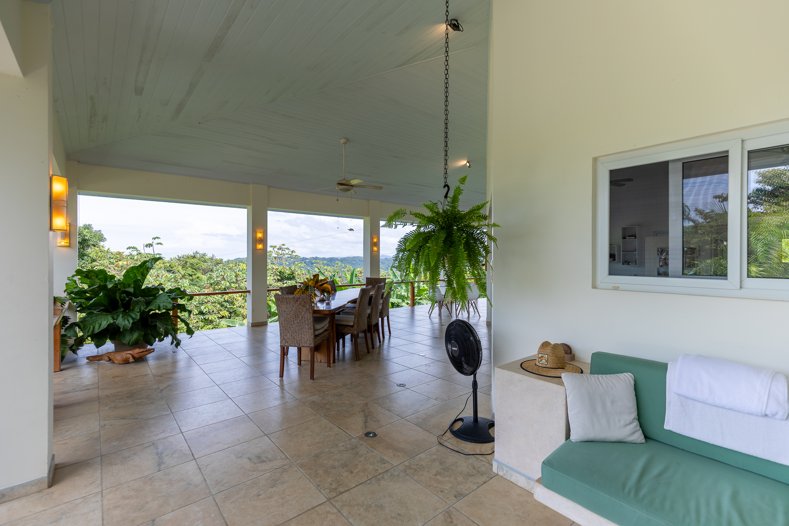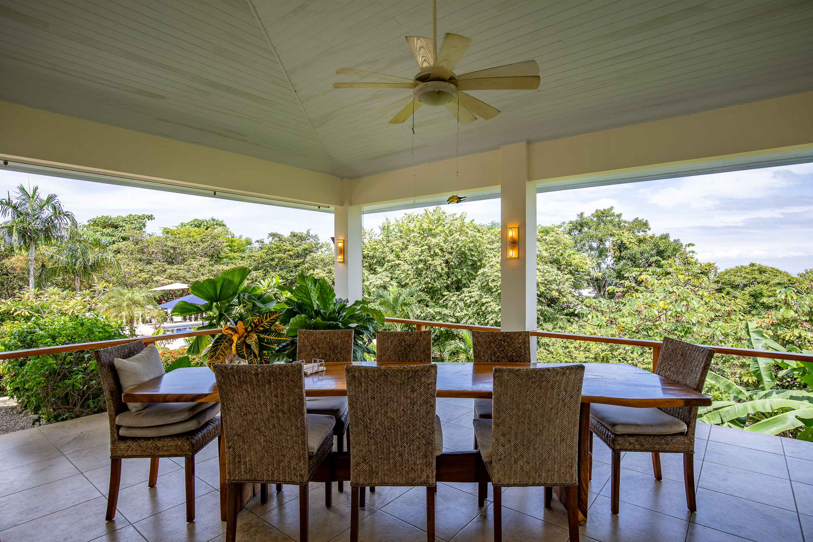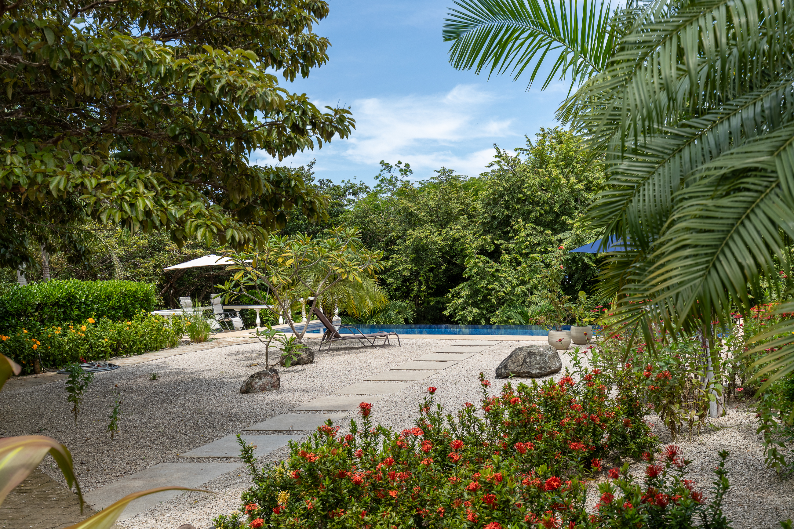 The house is divided into two structures; between them sits a pool, a beautifully manicured garden, and a sitting area with lots of native fruit trees attracting all sorts of local wildlife. The main house (structure #1) has a large patio with a spectacular view, a spacious kitchen and sitting area, and two bedrooms. The main room has its own private bath, and the guest room has a shared bath.
