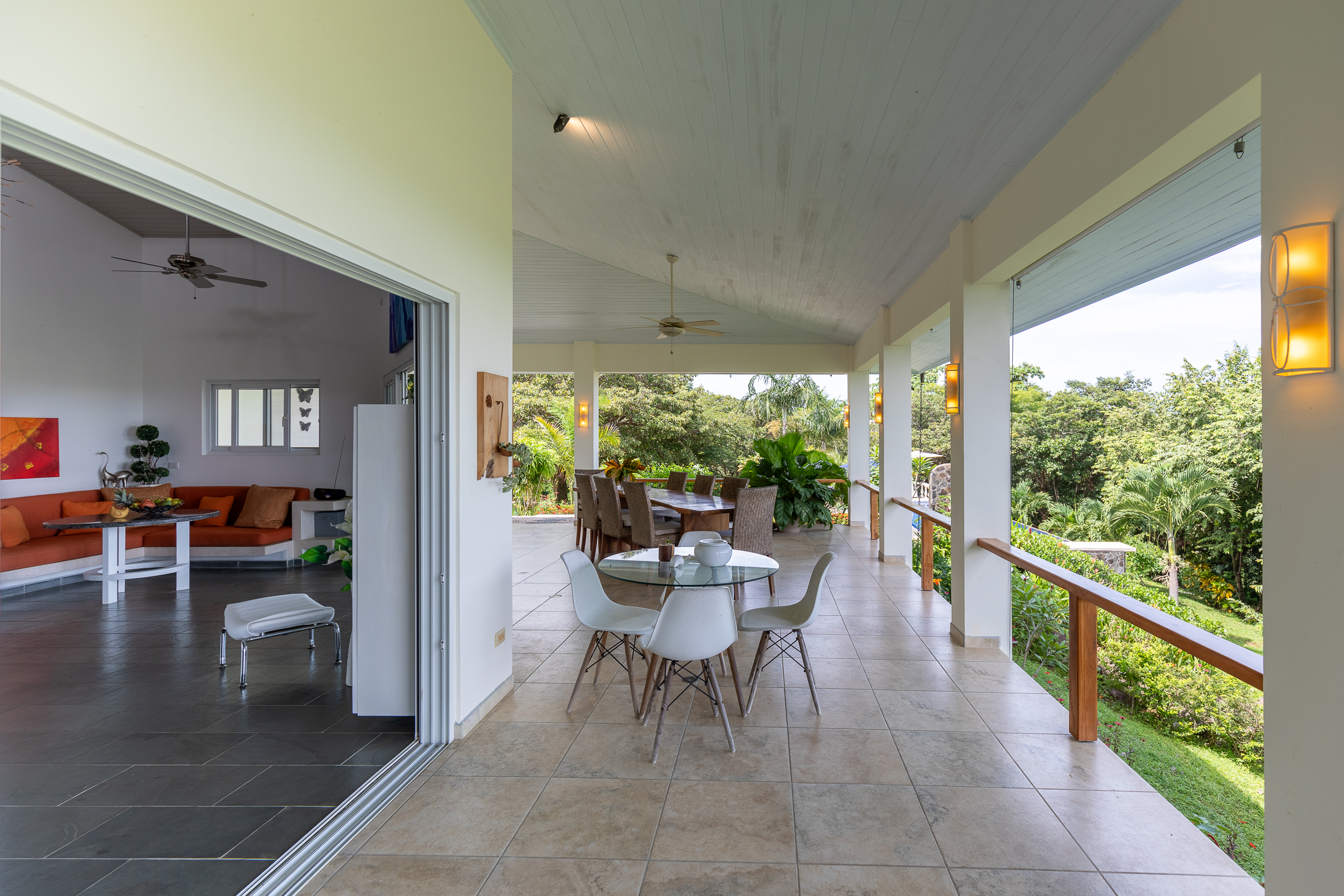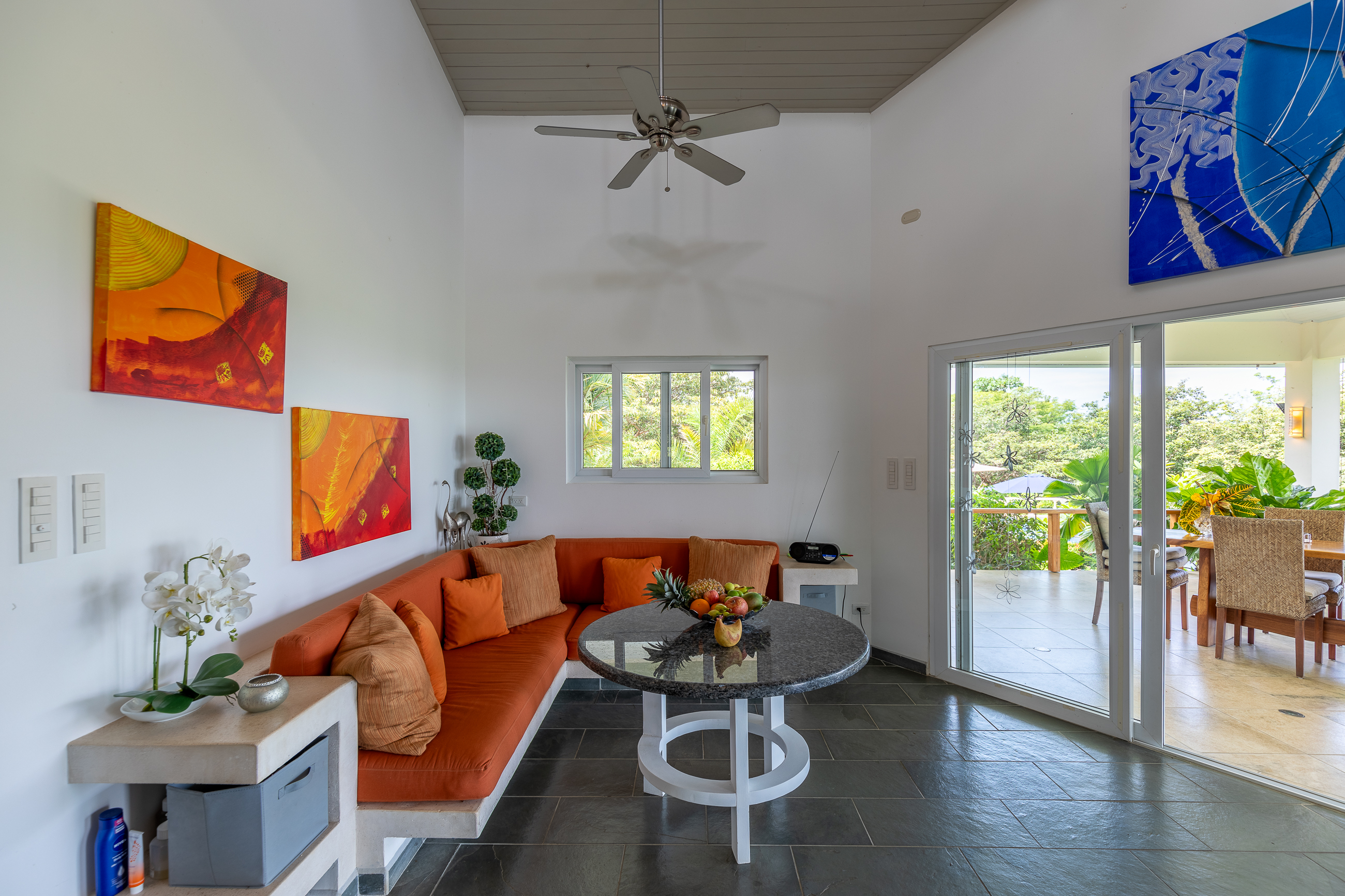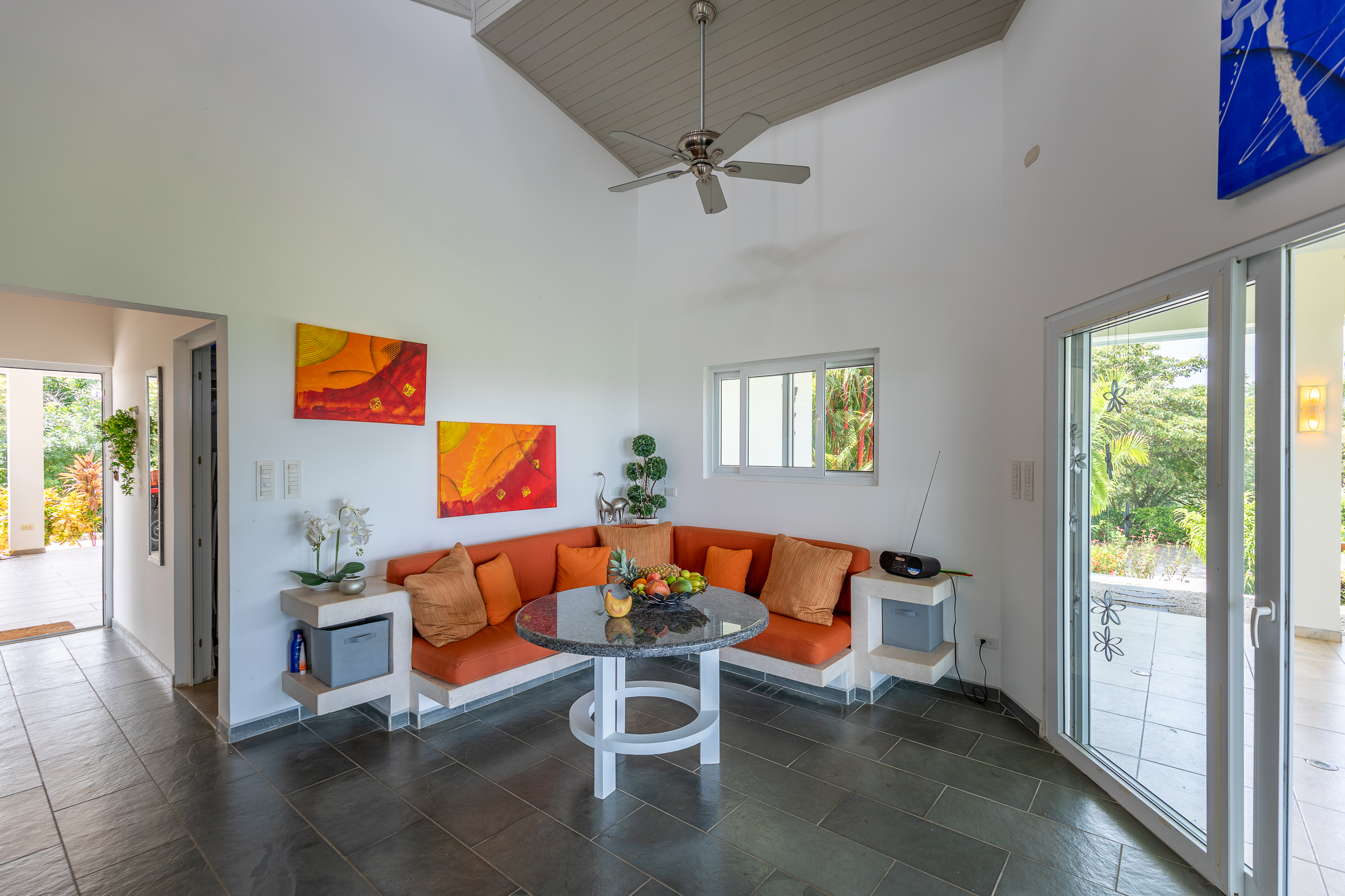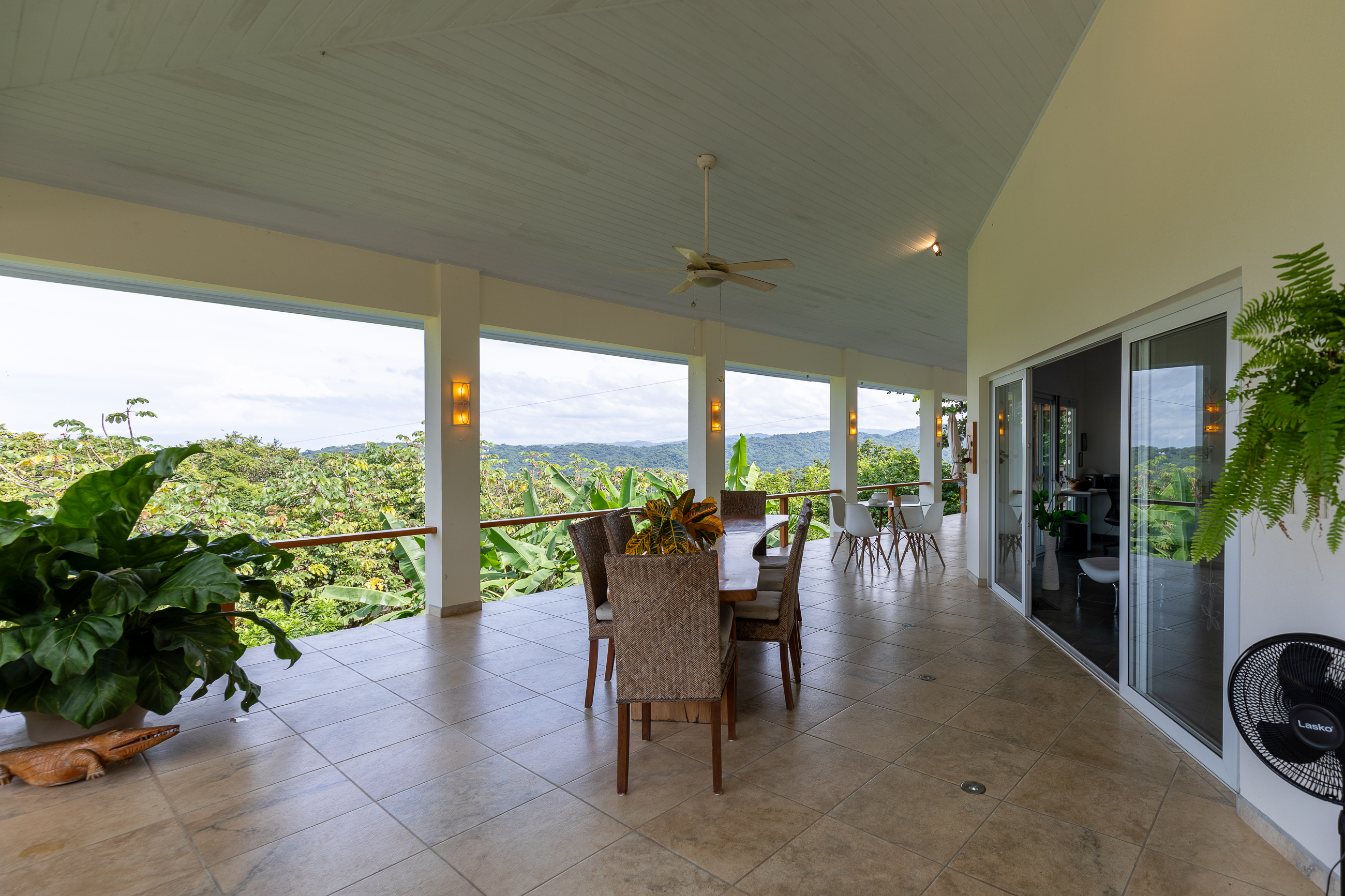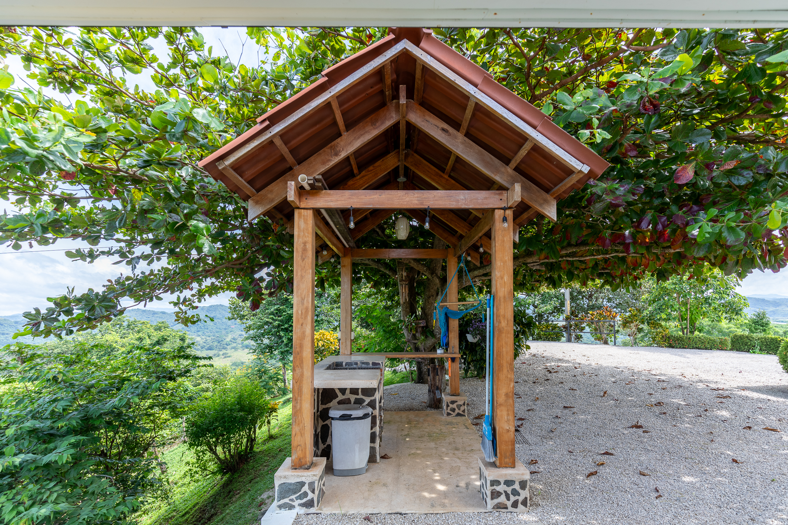 The house is divided into two structures; between them sits a pool, a beautifully manicured garden, and a sitting area with lots of native fruit trees attracting all sorts of local wildlife. The main house (structure #1) has a large patio with a spectacular view, a spacious kitchen and sitting area, and two bedrooms. The main room has its own private bath, and the guest room has a shared bath.