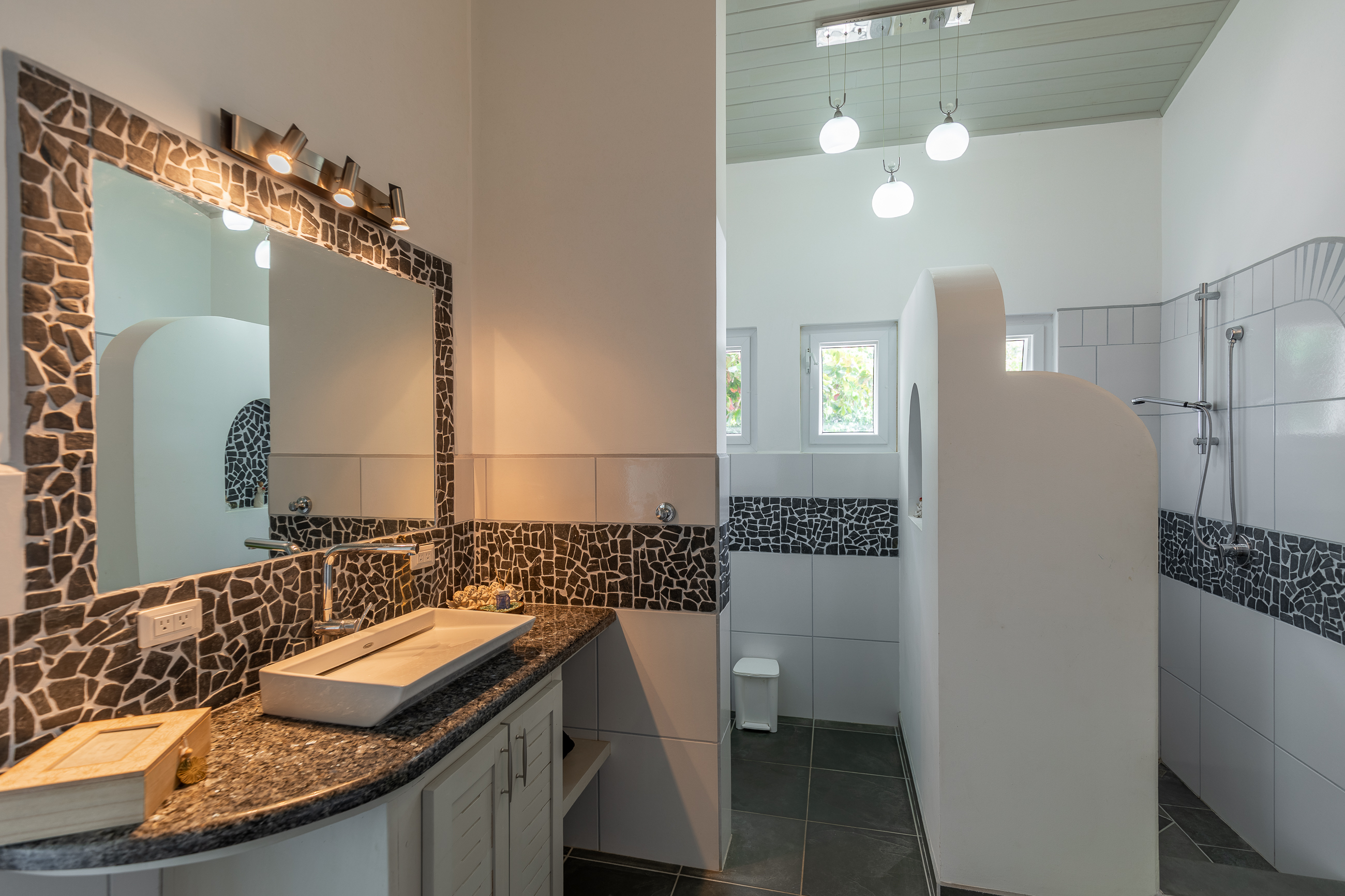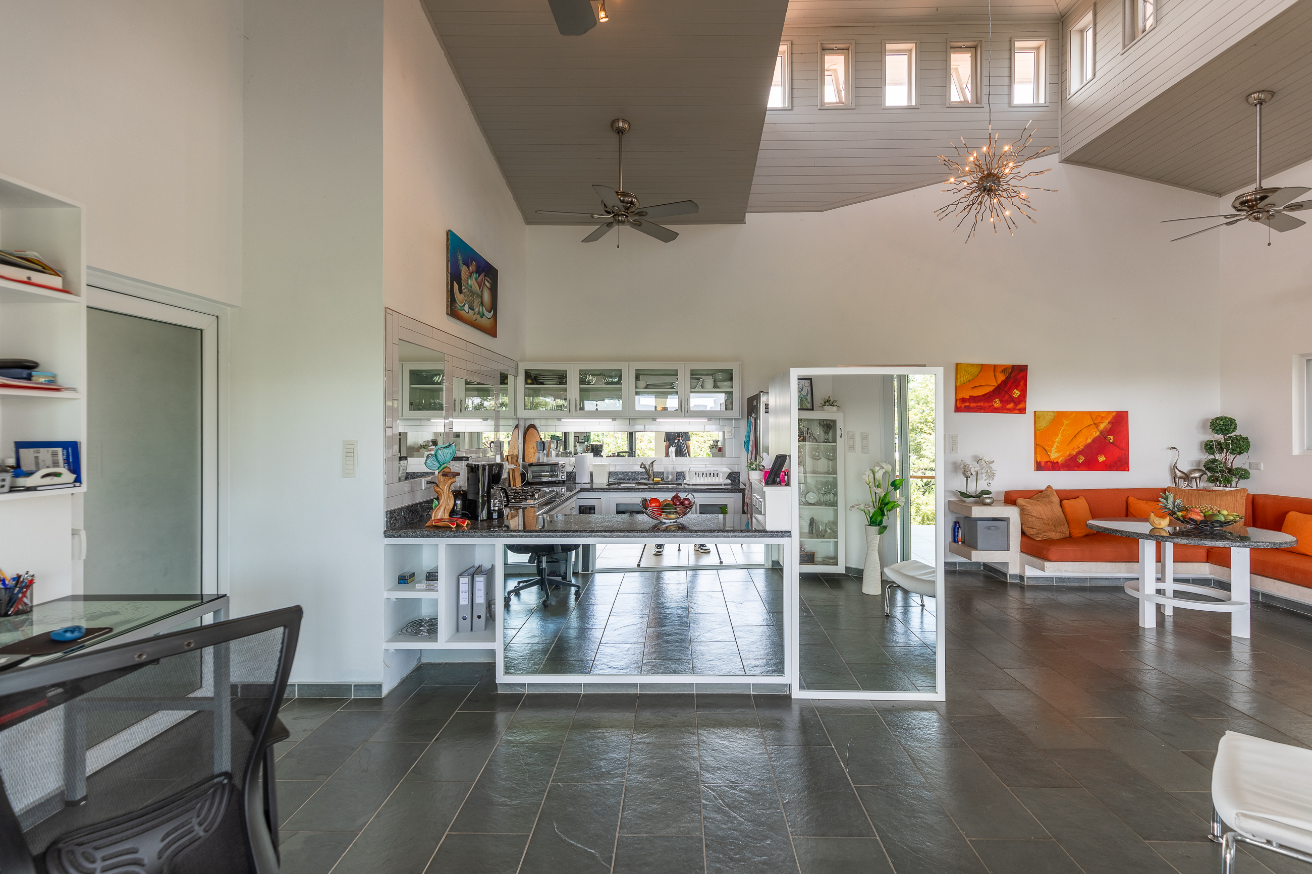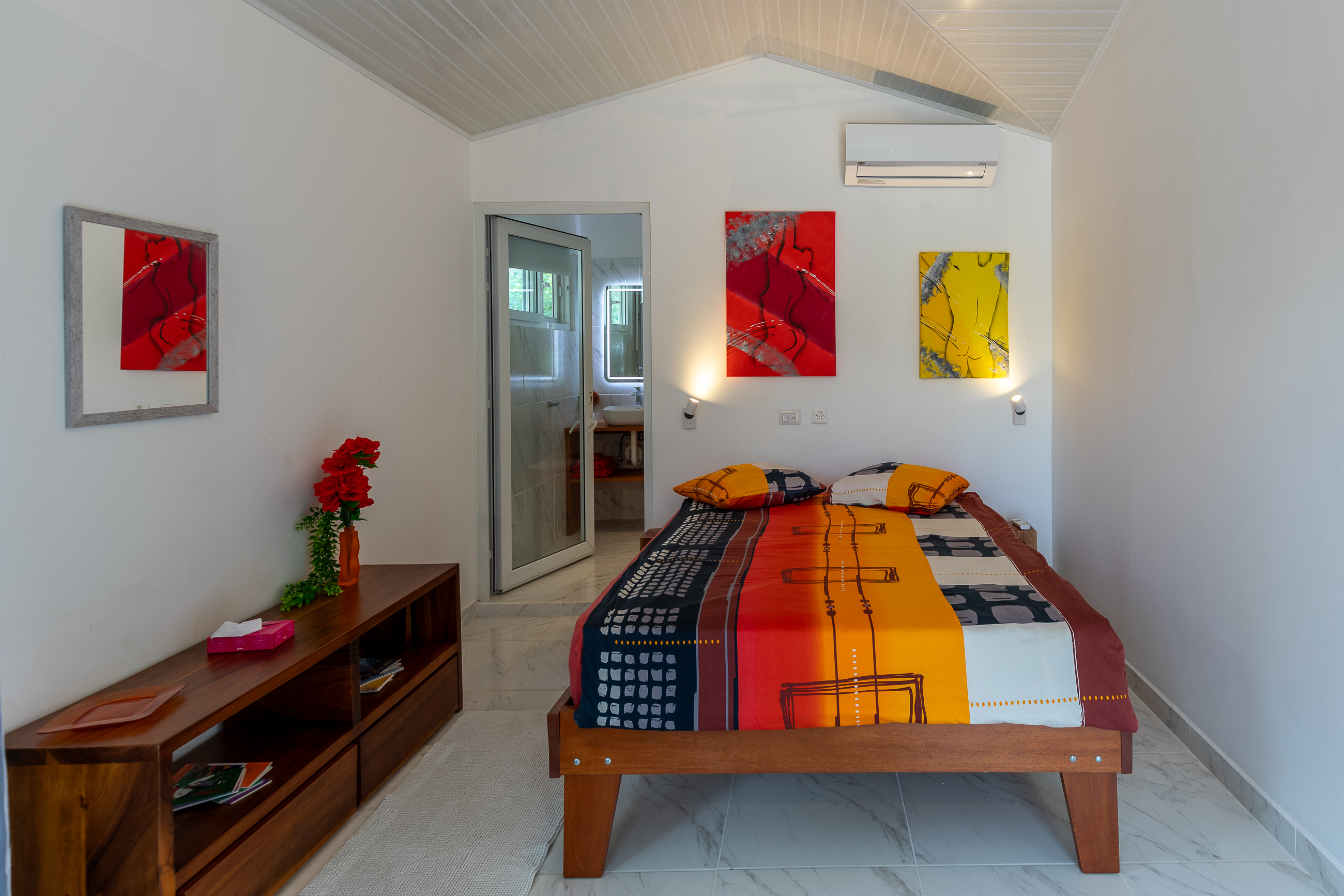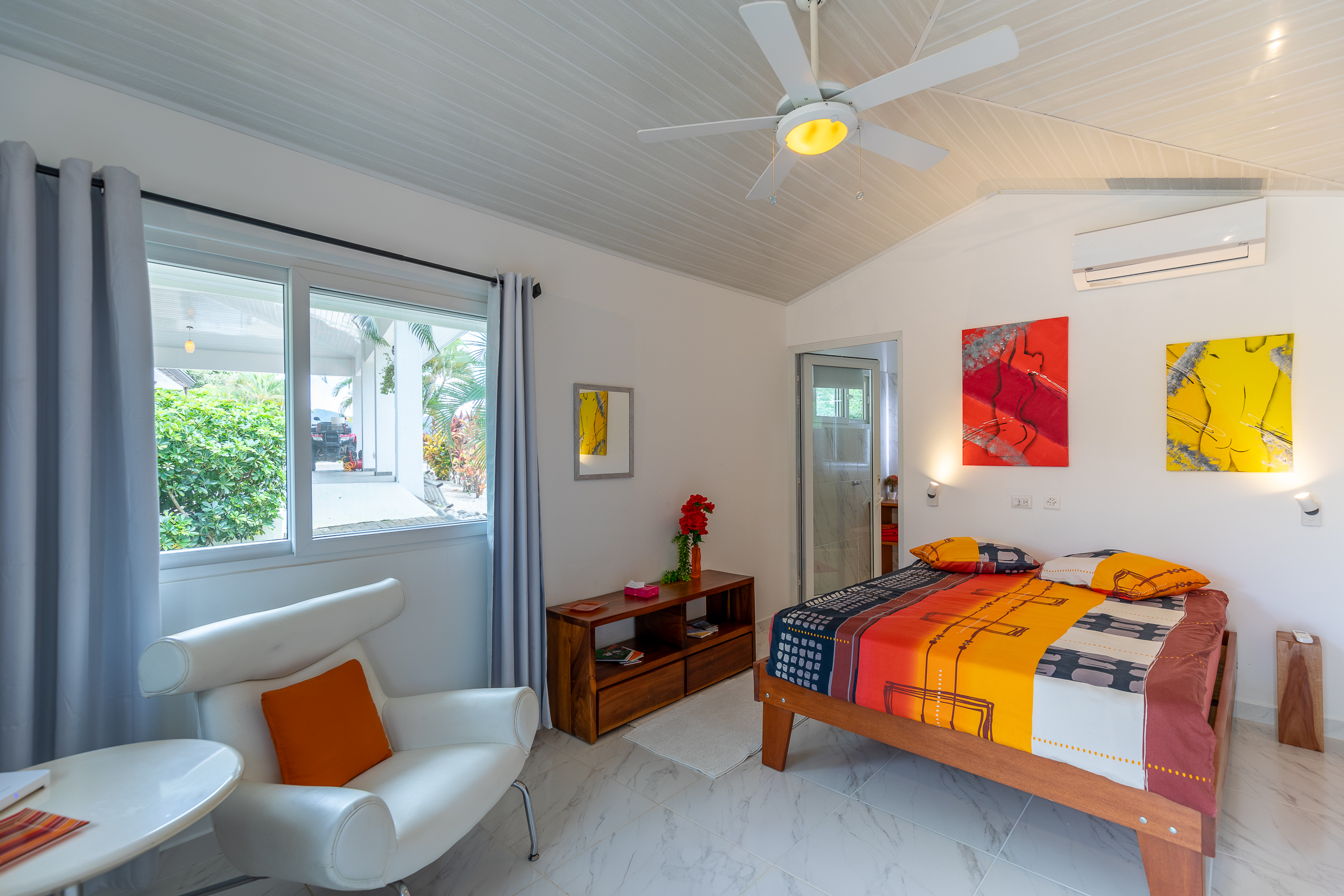 The house is divided into two structures; between them sits a pool, a beautifully manicured garden, and a sitting area with lots of native fruit trees attracting all sorts of local wildlife. The main house (structure #1) has a large patio with a spectacular view, a spacious kitchen and sitting area, and two bedrooms. The main room has its own private bath, and the guest room has a shared bath.