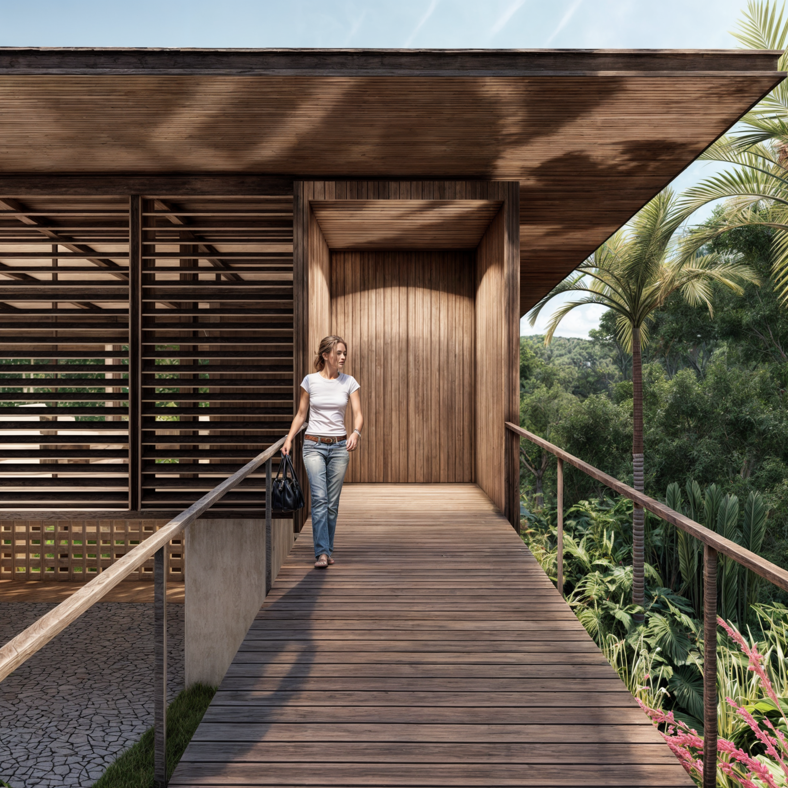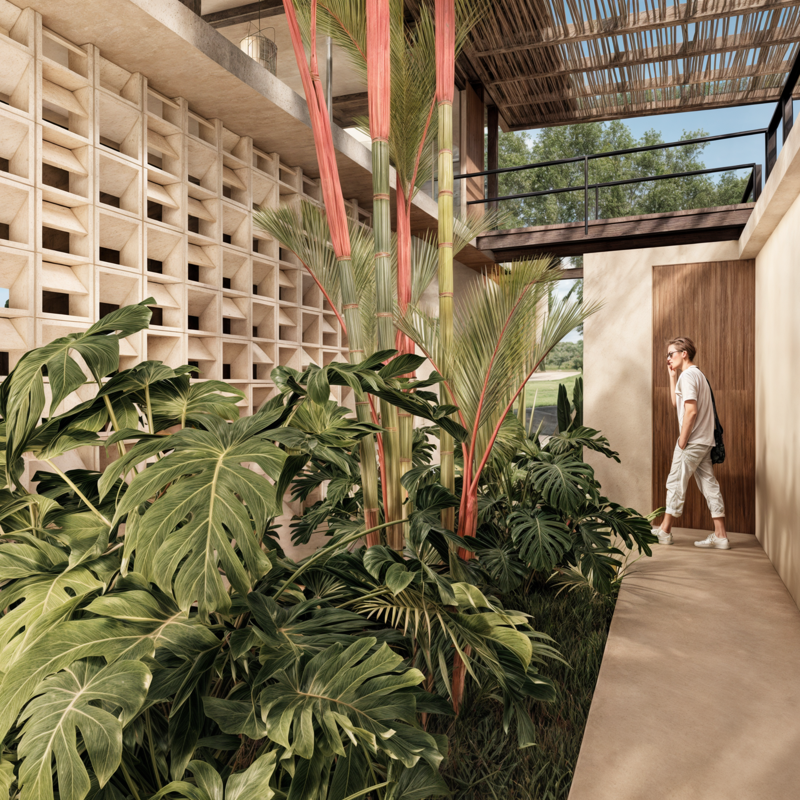 Water conservation is a cornerstone of Jardín Eterno. Rain gardens filter and recycle water onsite, while outdoor walkways and circulation areas connect residents with nature, reducing energy usage.