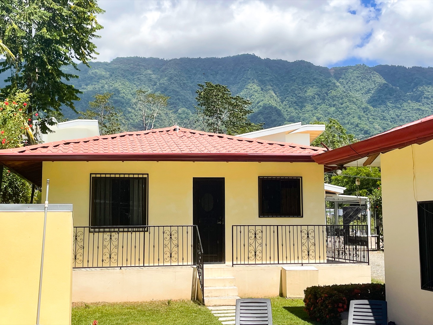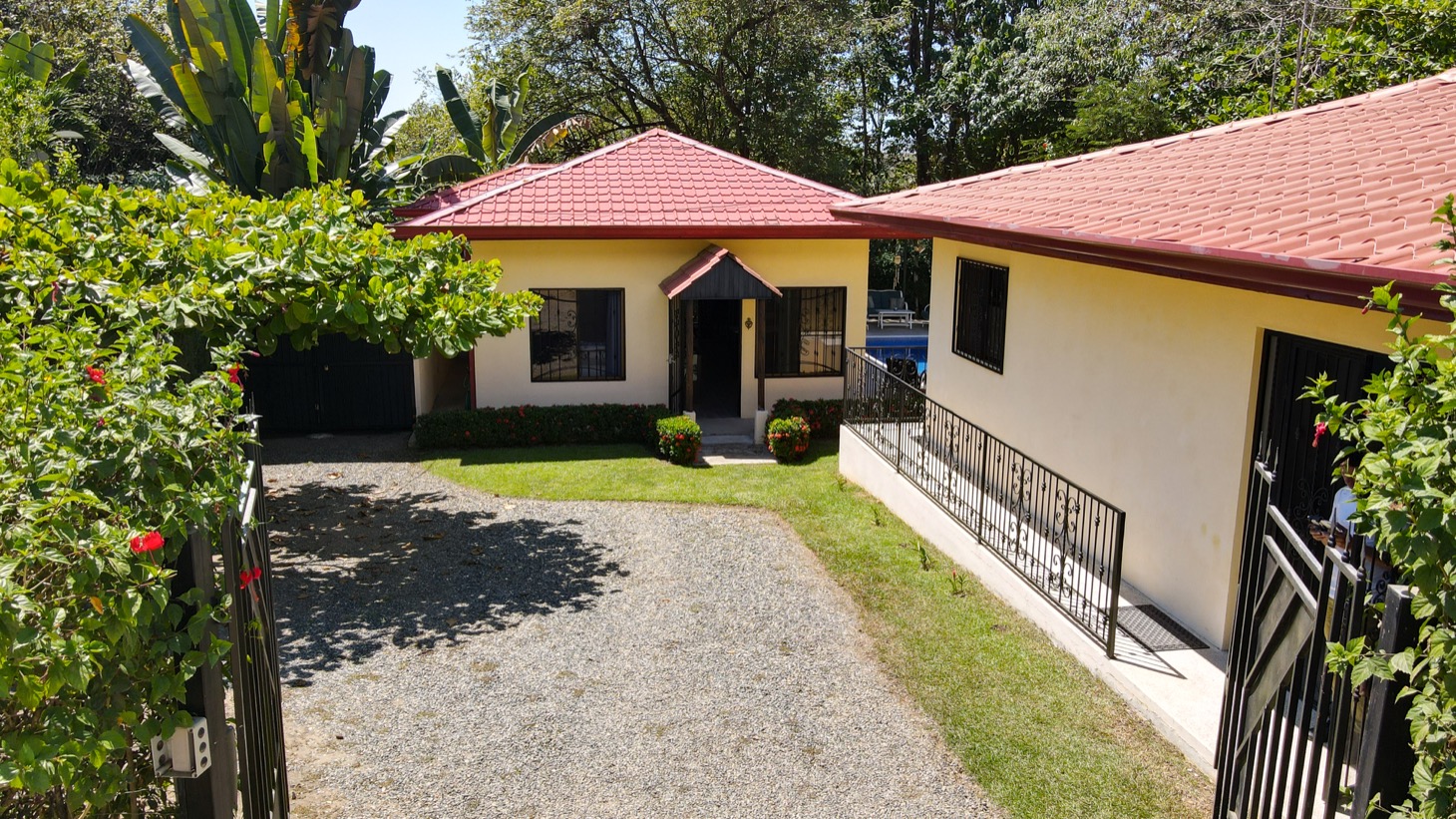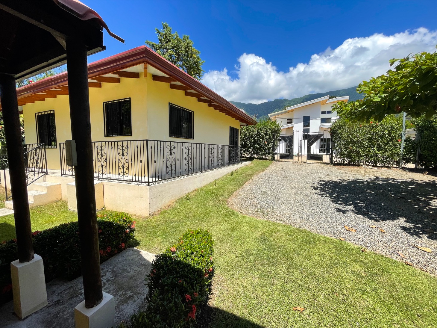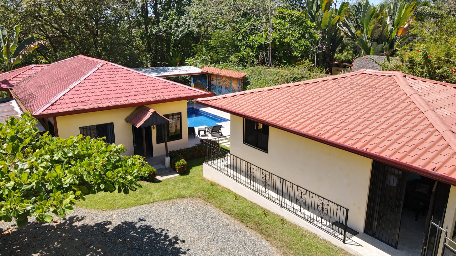 Sitting in the best location for families and travelers in the town of Ojochal are two lovely mountain view homes on one property. This is an ideal place for people who want the option of walking their dogs on flat roads, or walking to stores, restaurants, schools, and services in the area. Calle Buganvilla is a 30-minute walk to the nearest beach — Playa Tortuga — and it is two-wheel drive access to this property on paved roads nearly the entire way.