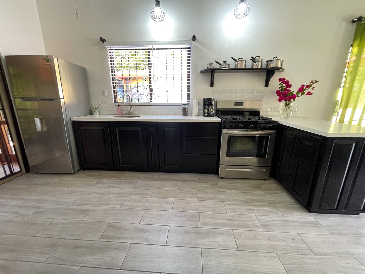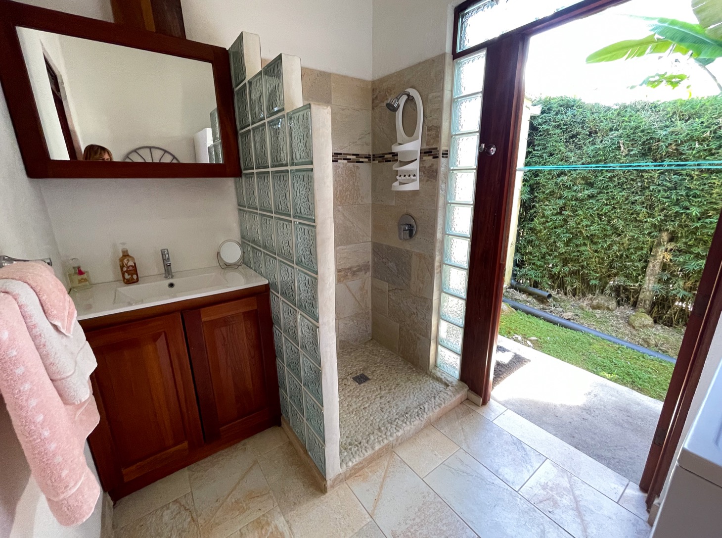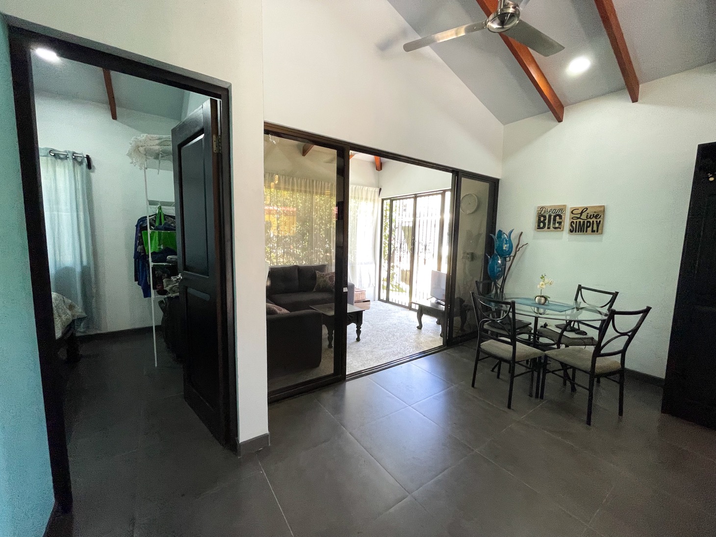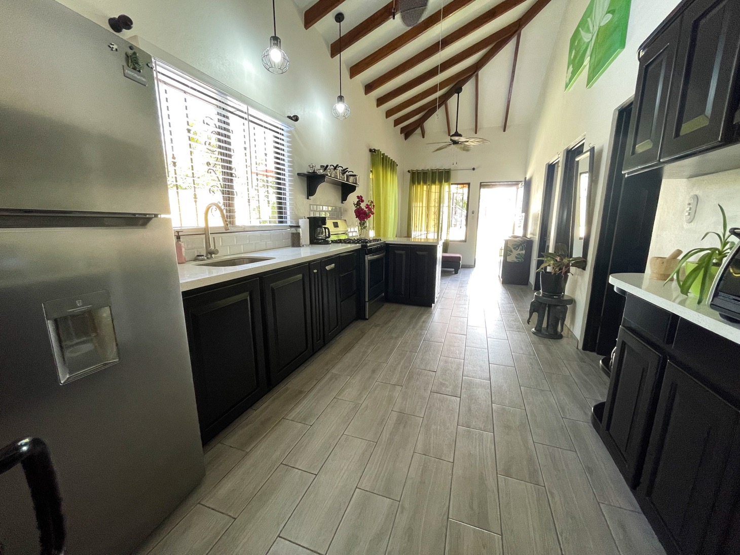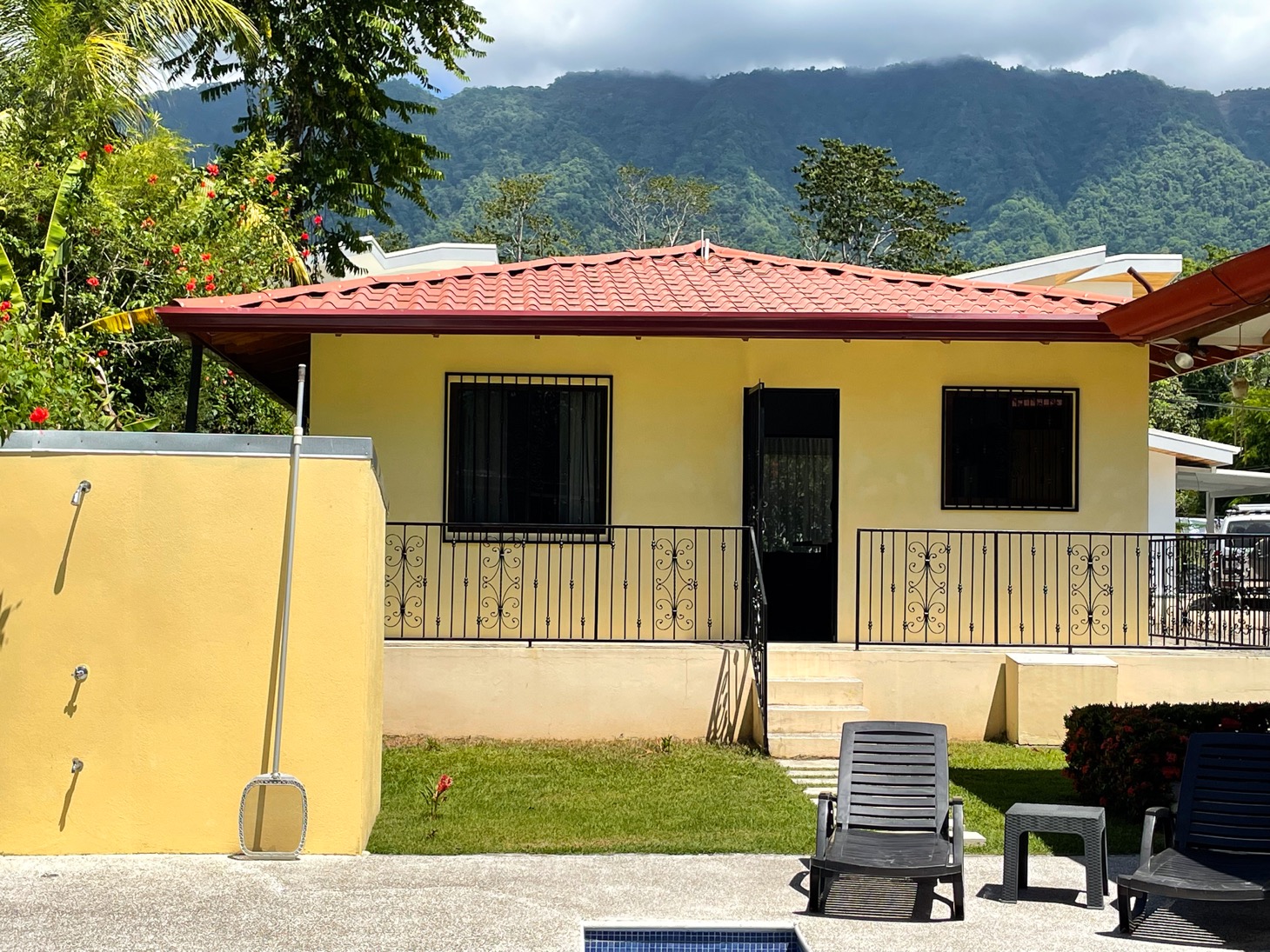 Sitting in the best location for families and travelers in the town of Ojochal are two lovely mountain view homes on one property. This is an ideal place for people who want the option of walking their dogs on flat roads, or walking to stores, restaurants, schools, and services in the area. Calle Buganvilla is a 30-minute walk to the nearest beach — Playa Tortuga — and it is two-wheel drive access to this property on paved roads nearly the entire way.