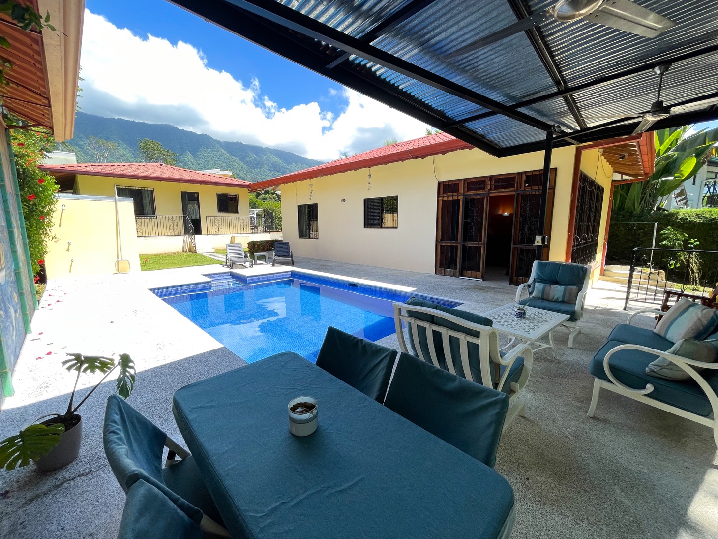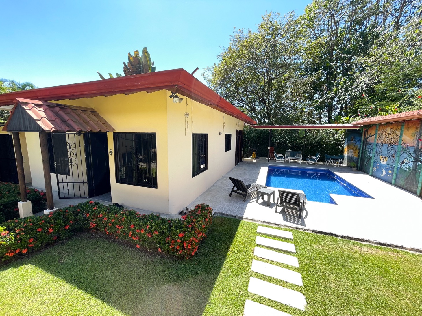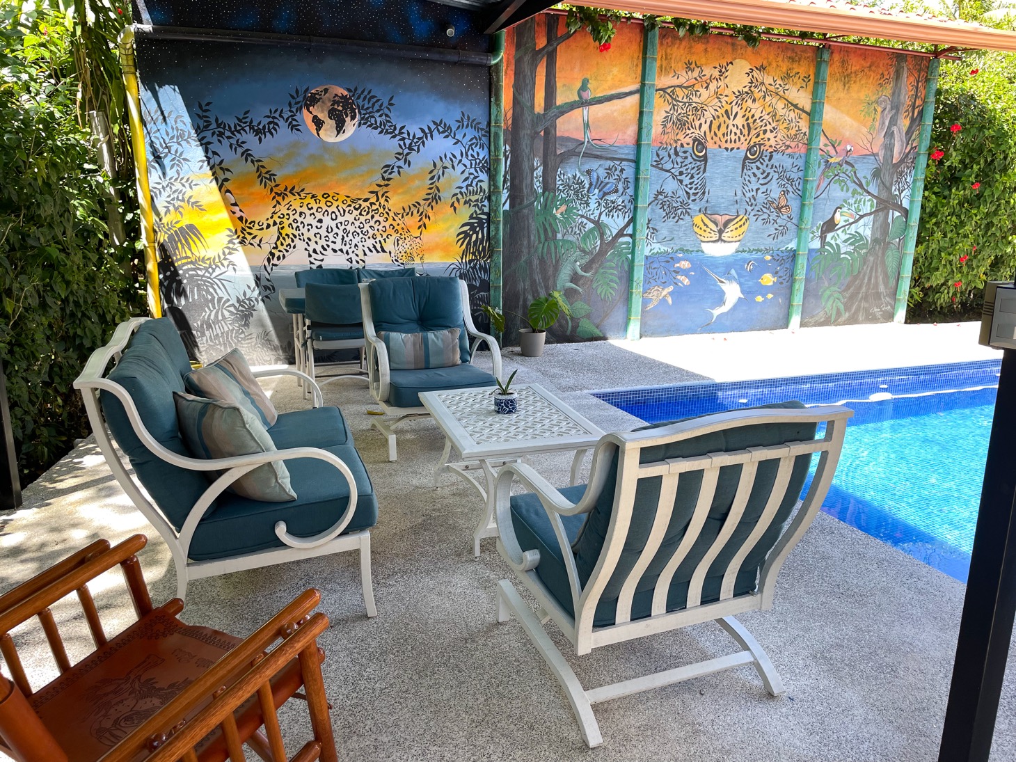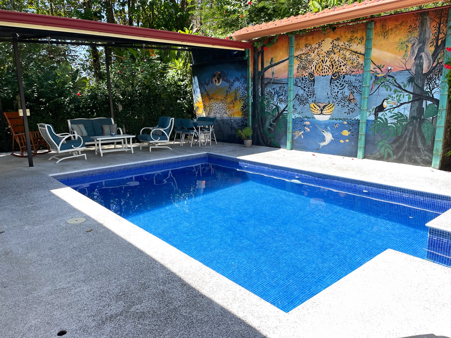 The layout of each of these homes is perfect for traveling families to share one property or for the owner to have the option to rent or host guests. Everything in these homes feels ample for housing multiple people in a comfortable setting. The newly-installed tiled pool is well-shaded and large enough to have a number of people enjoy it at once. And the surrounding terrace has comfortable seating for at least ten people, with a gorgeous, jungle-themed mural overlooking the scene.