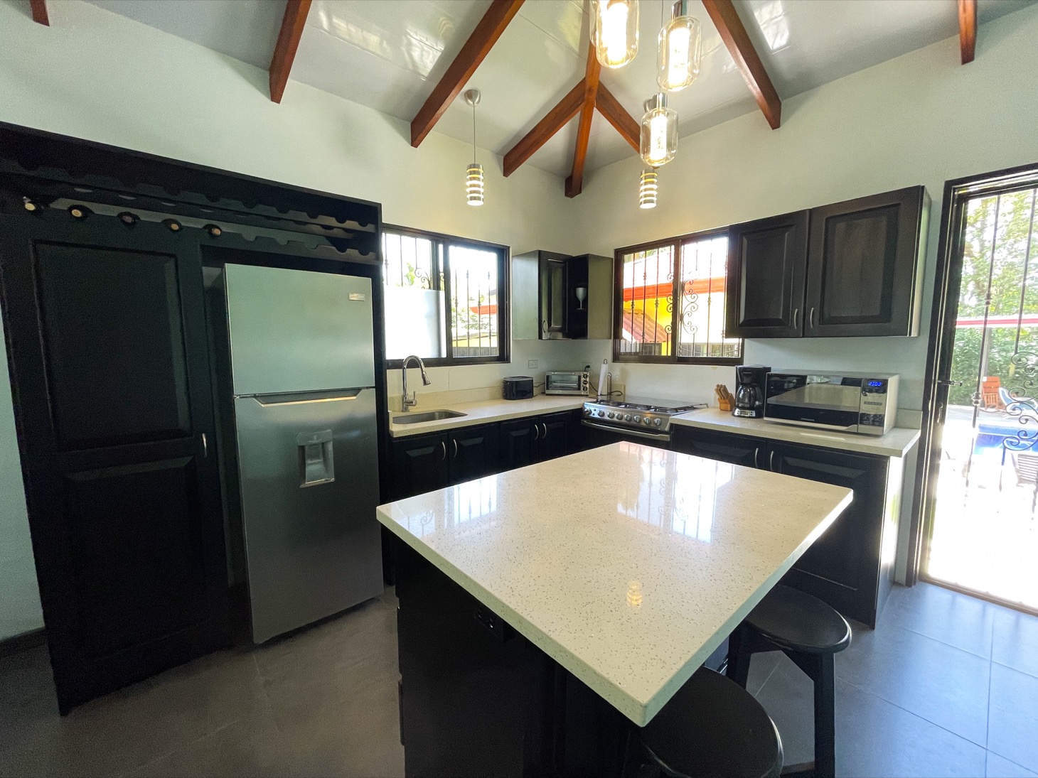 The homes are joined by a pool and shaded courtyard, each featuring a two-bedroom layout. Between the spacious bedrooms in both homes is a generous bathroom. The main house has a second full bathroom with laundry facilities next to the shaded terrace. Both homes have lots of comfortable sitting areas as well as well laid-out kitchens that were newly remodeled with quartz countertops and lots of beautiful hardwood cabinetry.