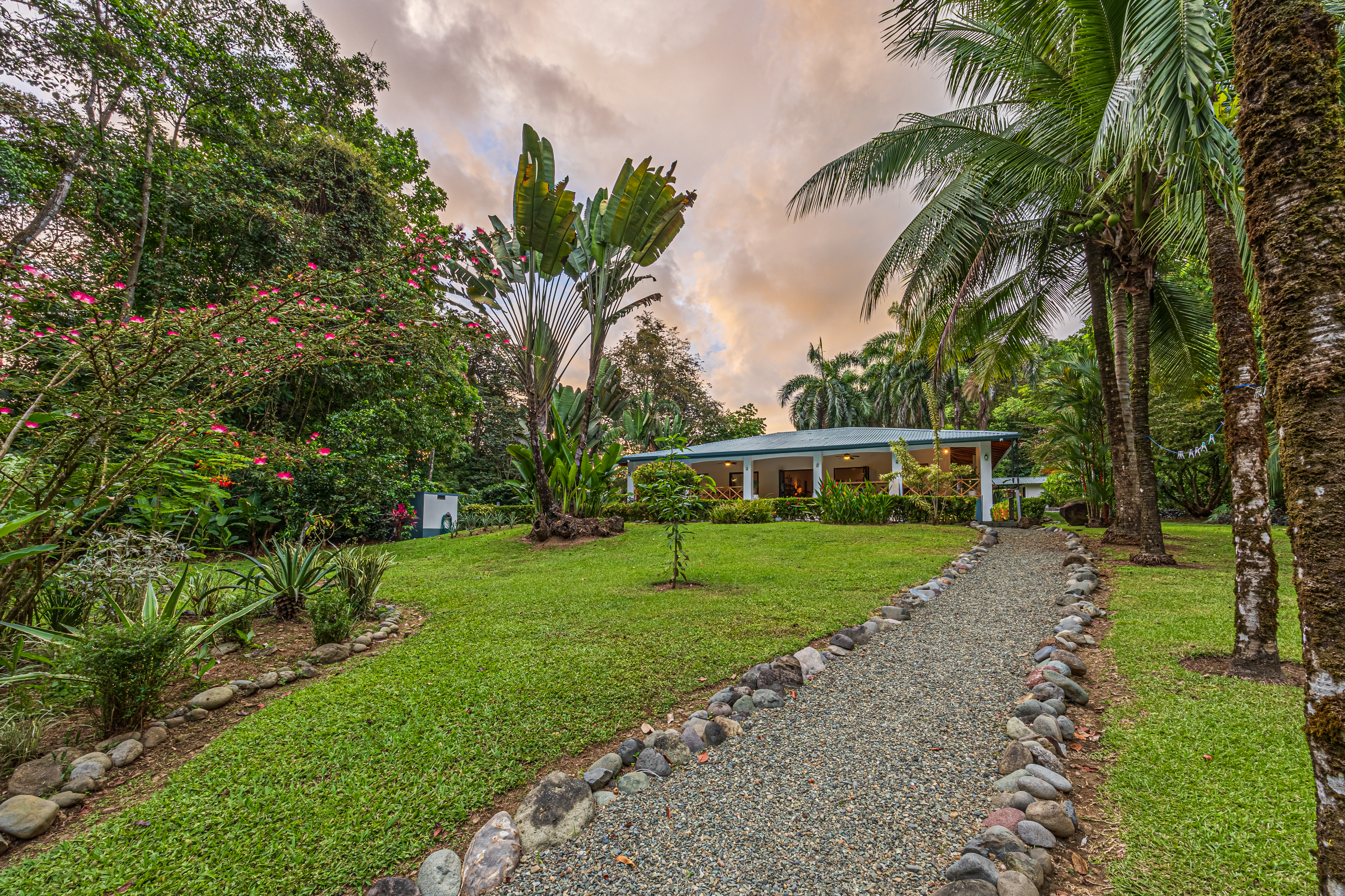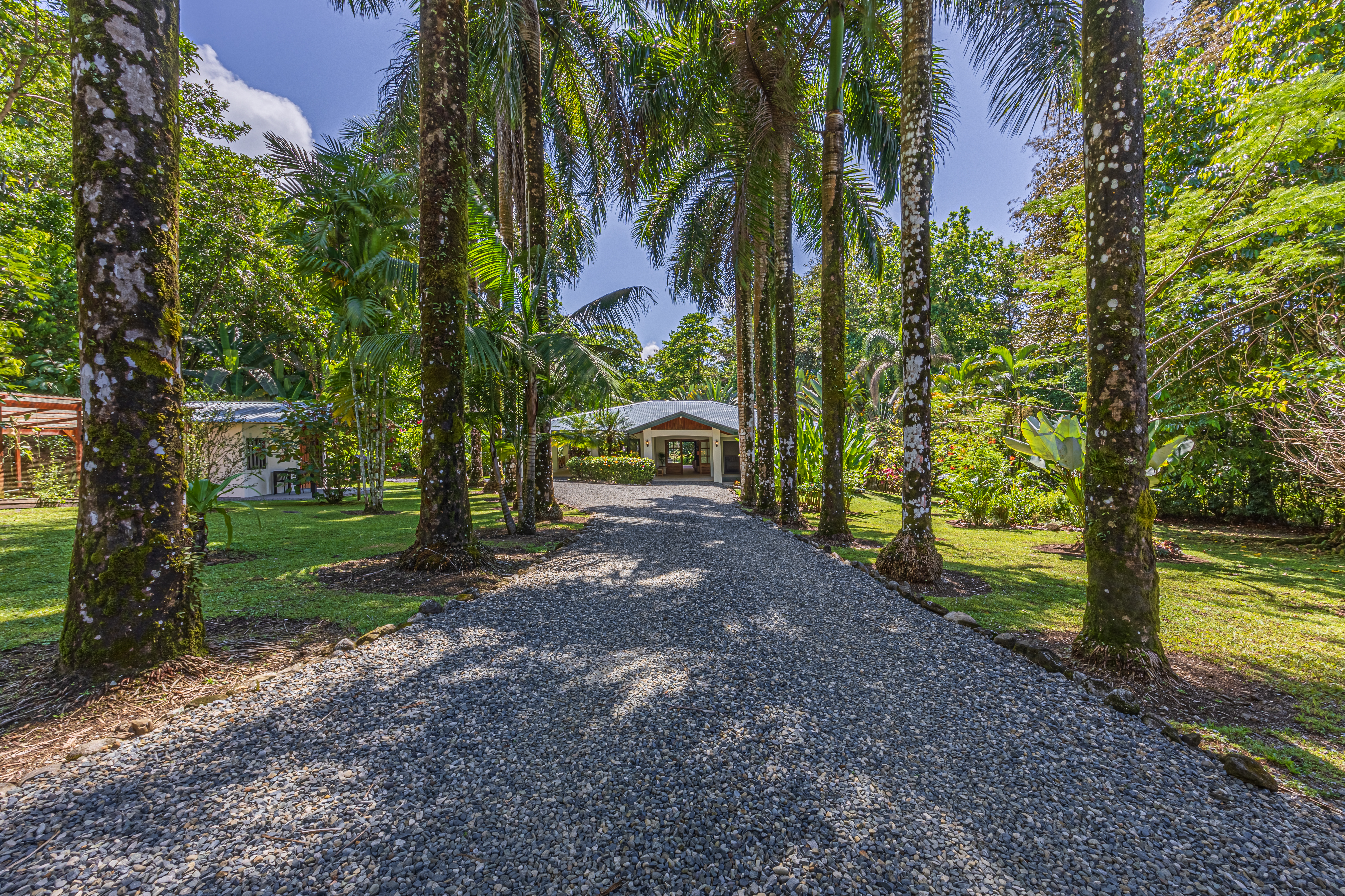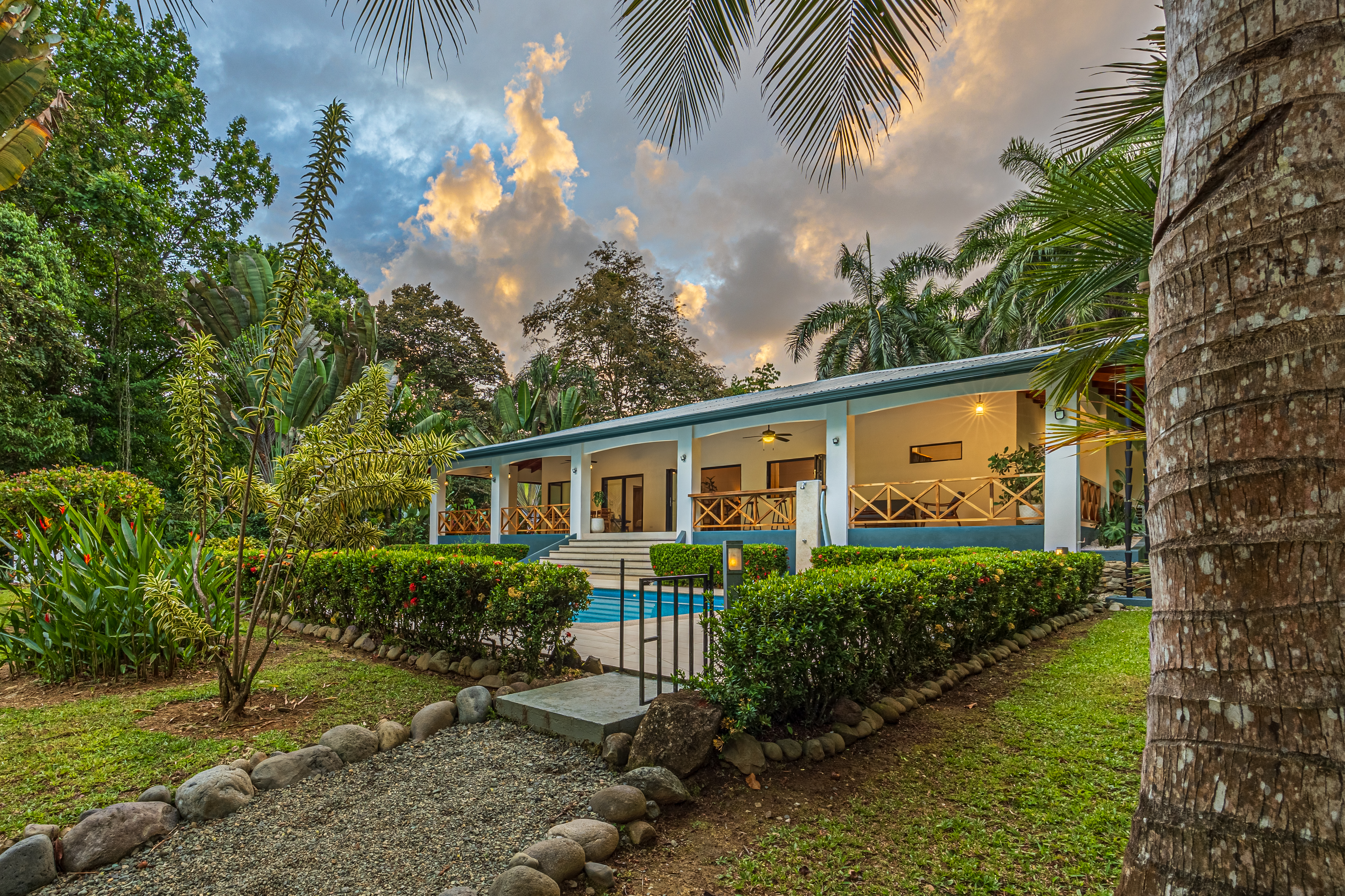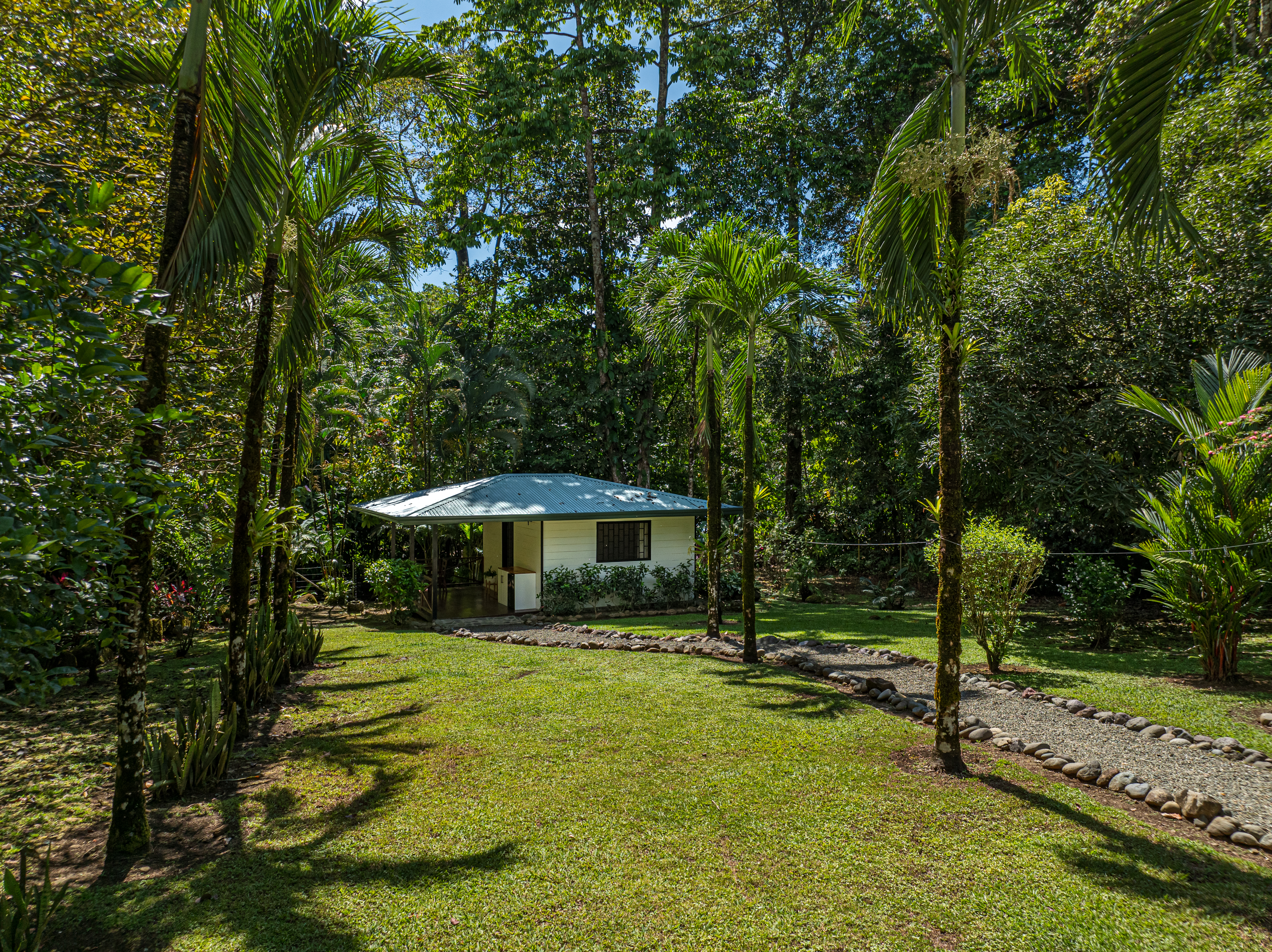A giant, iconic palm tree-lined entrance (Casa Palmera) welcomes you into this fully fenced property, surrounded by lush jungle and bordering the Rio Balso. The organically maintained gardens are abundant with fruit trees, herbs, and a thriving Mariola beehive—all cultivated without sprays. A shade house provides the perfect space for nurturing plants and growing fresh produce.