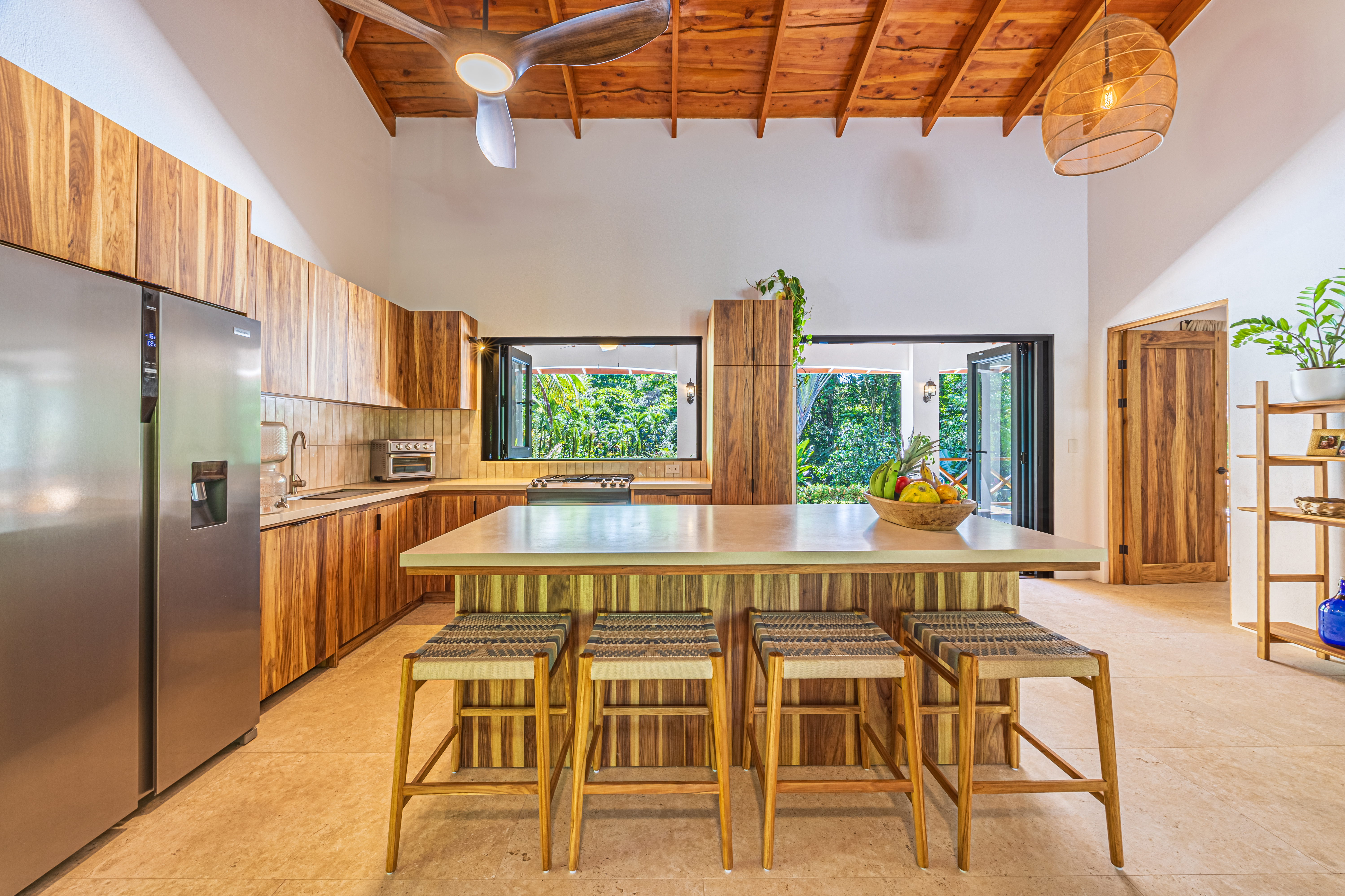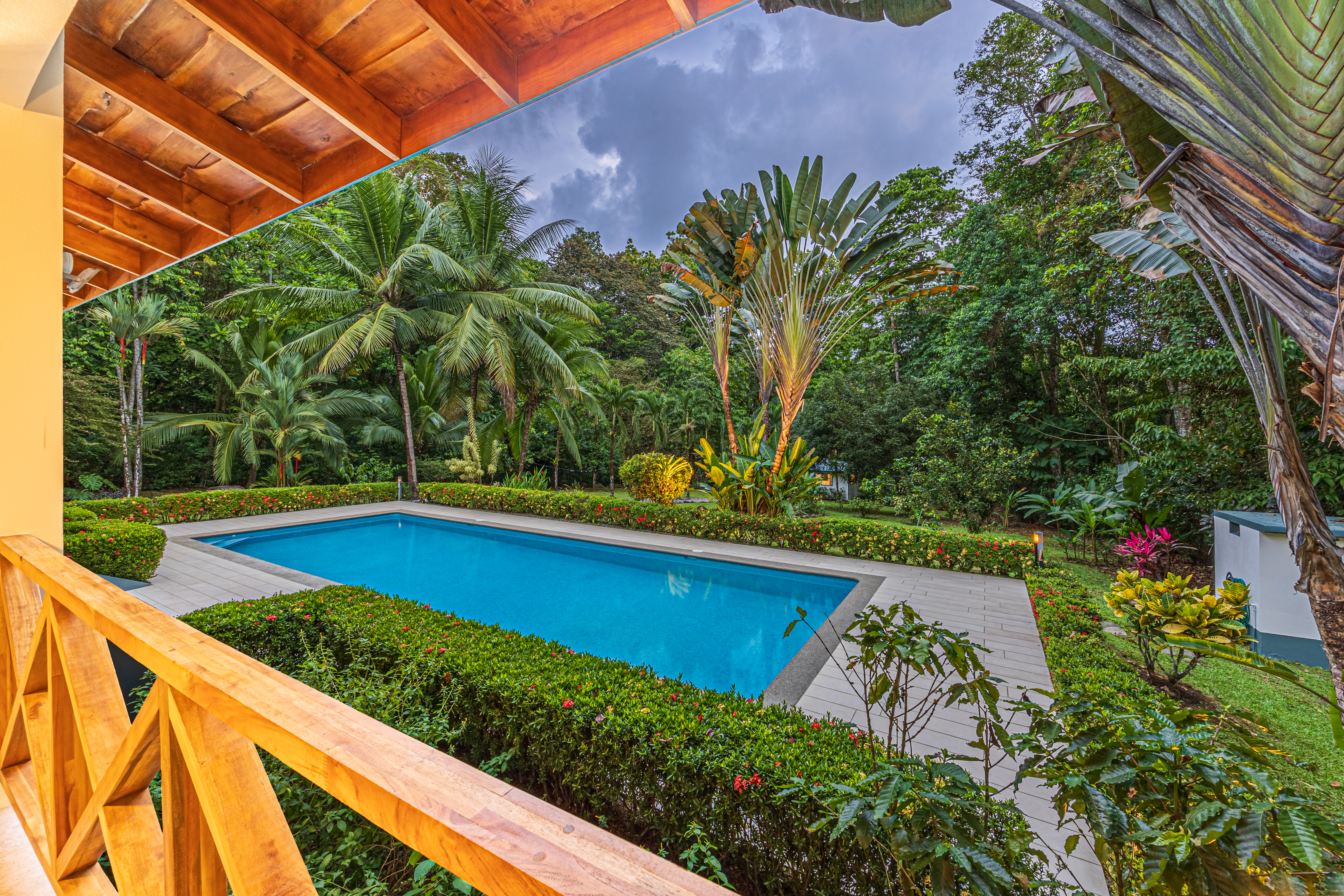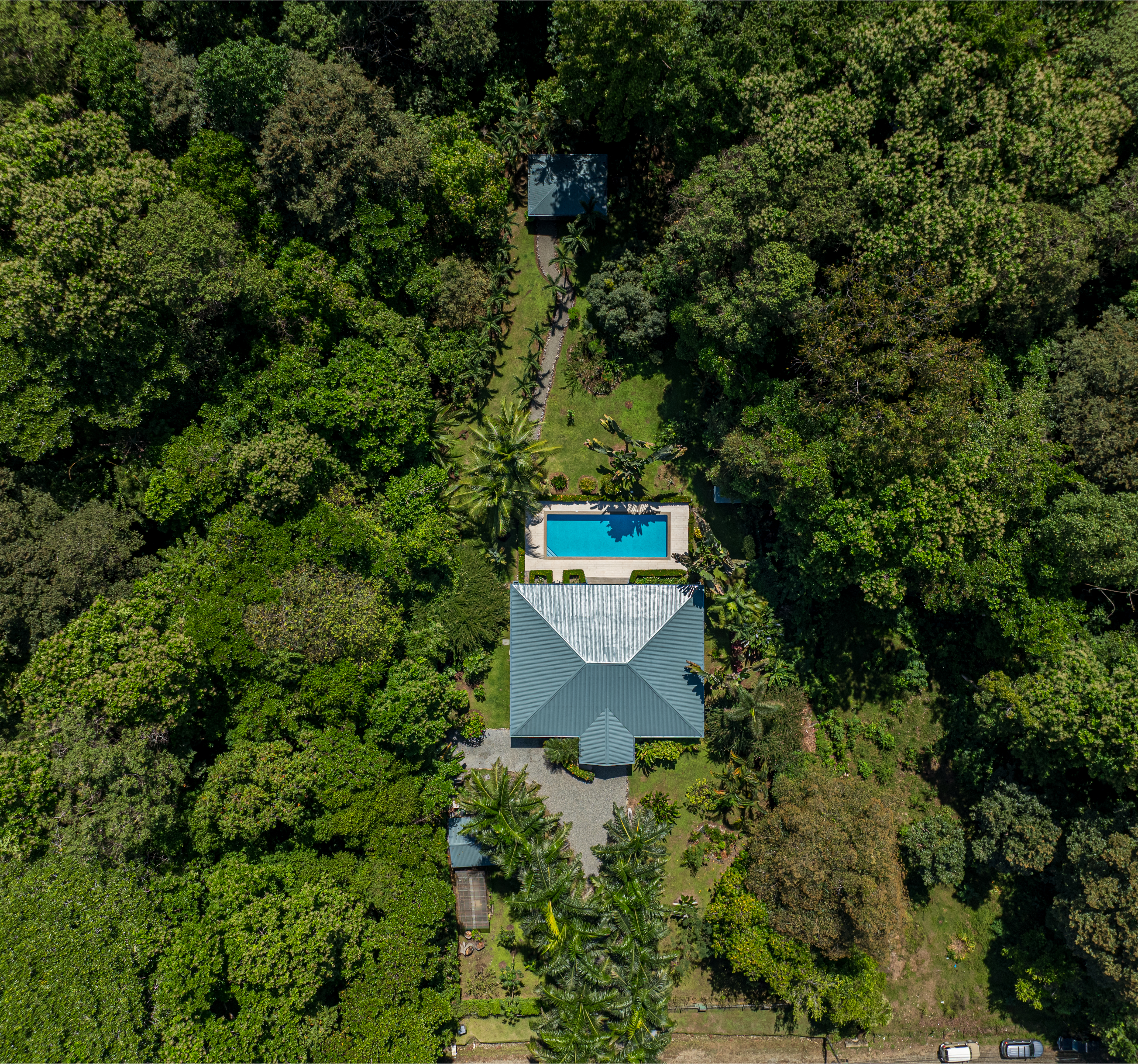 A giant, iconic palm tree-lined entrance (Casa Palmera) welcomes you into this fully fenced property, surrounded by lush jungle and bordering the Rio Balso. The organically maintained gardens are abundant with fruit trees, herbs, and a thriving Mariola beehive—all cultivated without sprays. A shade house provides the perfect space for nurturing plants and growing fresh produce.