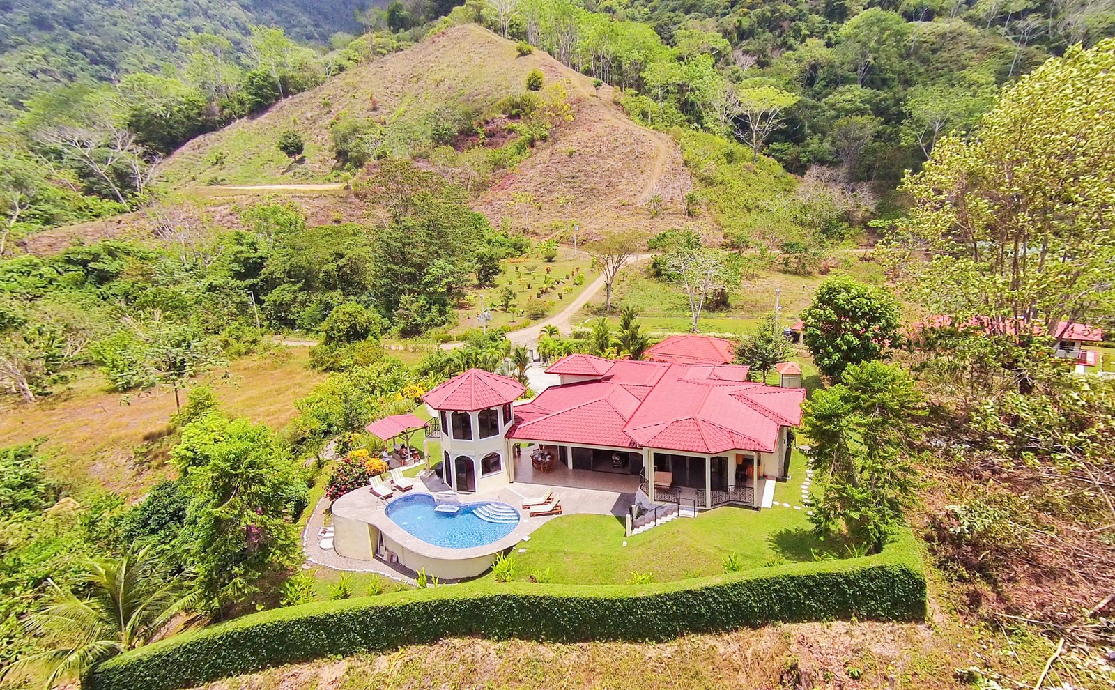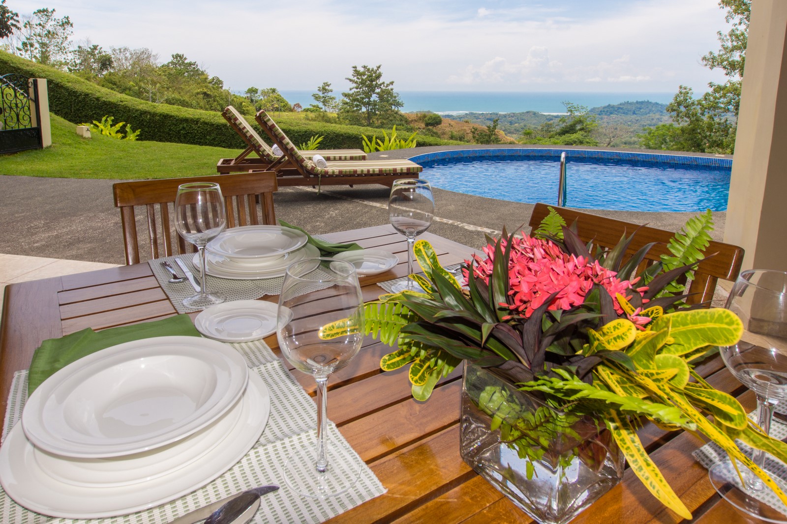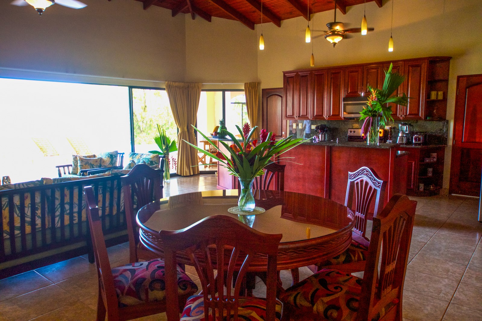 If you need to unwind or are searching for peace and tranquility, this property is right for you. Stay home and prepare your simple or gourmet meals in the main kitchen or if you prefer to be outdoors, an additional full kitchen is available in the octagonal rancho just off the large covered terrace by the pool. Dine indoors at the beautiful round hand-carved hardwood table, or outdoors at the teak wood table with seating for eight.