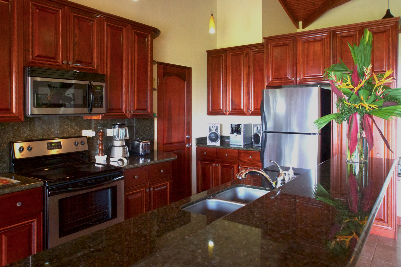 This tastefully decorated, meticulously maintained four-bedroom, four-and-a-half bathroom modern luxury villa features top-quality custom-built solid wood cabinetry and furniture, high vaulted wood ceilings, and an open concept kitchen/dining/living room design.