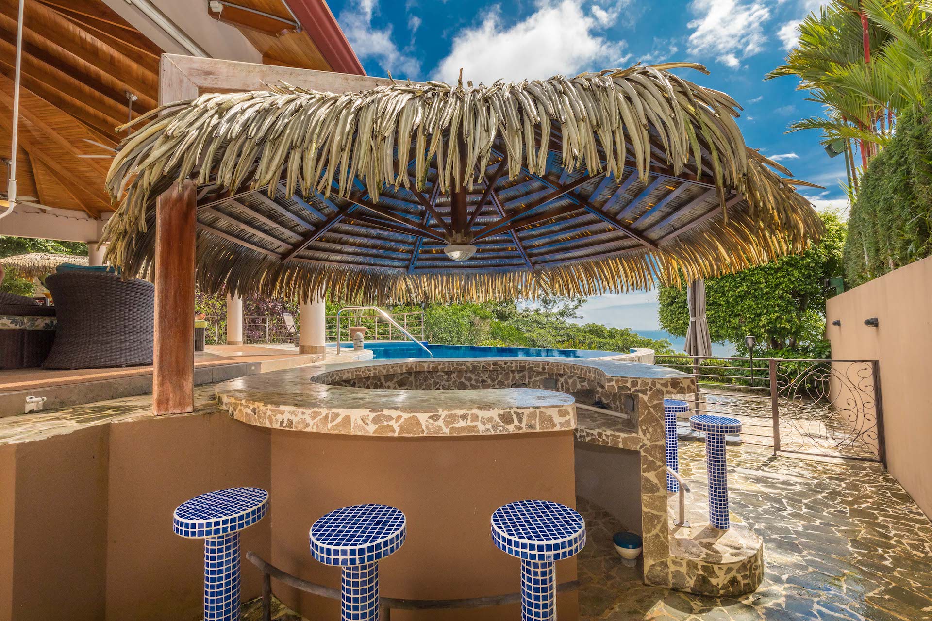 a living room with sofas and chairs, a lounge area, a covered BBQ area, and a fantastic bar…swim-up from the pool,