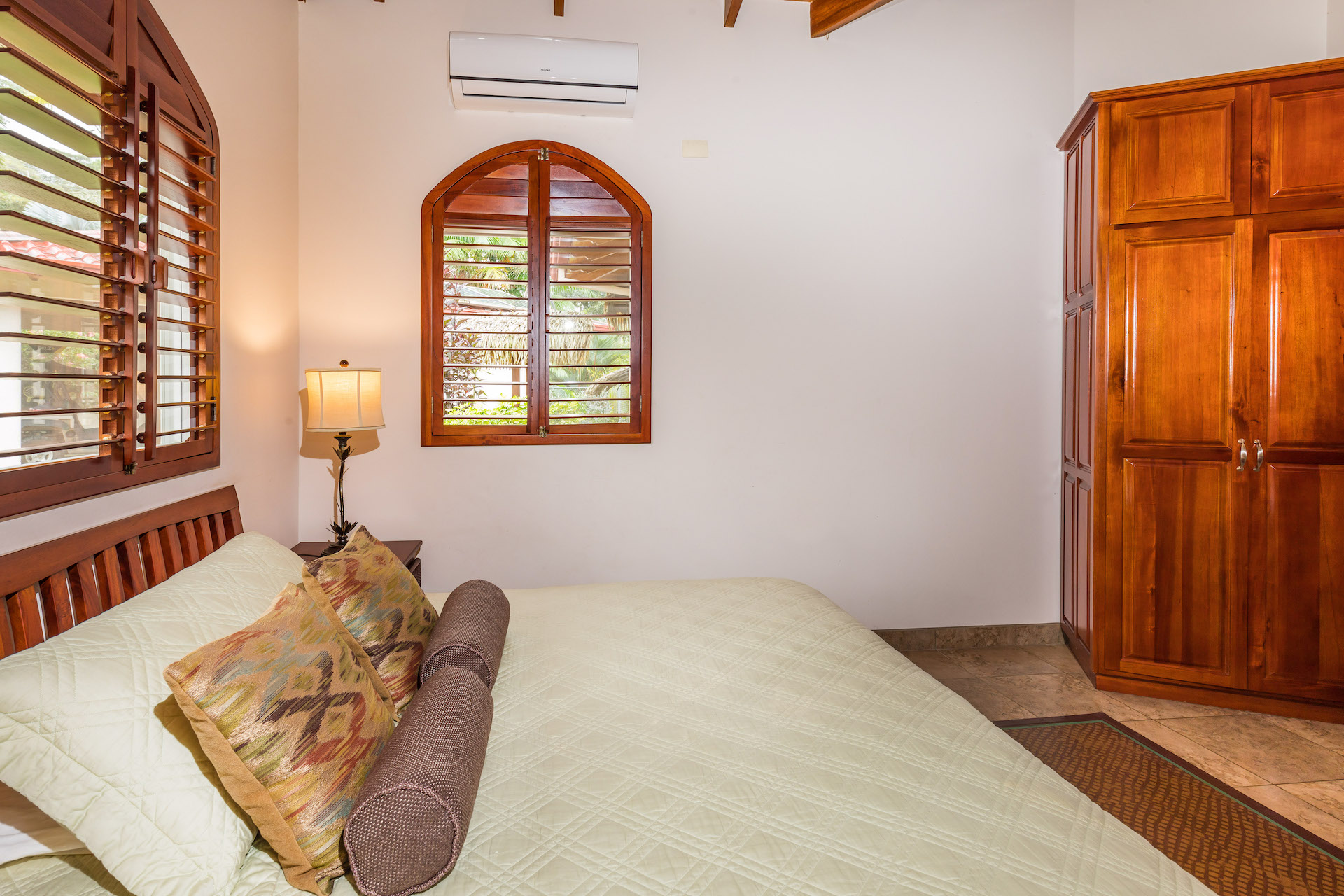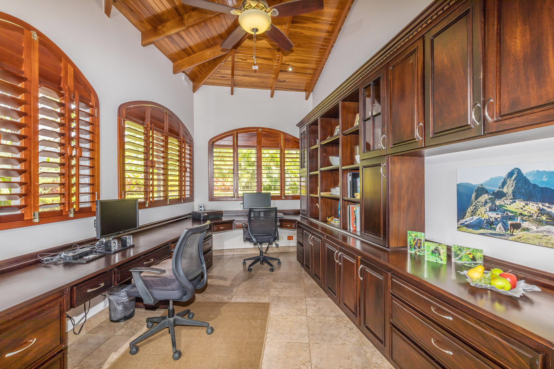 The large guest suite has a king-size bedroom with a private bathroom and walk-in shower with patio access through another Pella door which has built-in shades. The fourth bedroom, with a queen-size sofa bed, is across from the large guest suite and can be used as a guest sitting room with television.