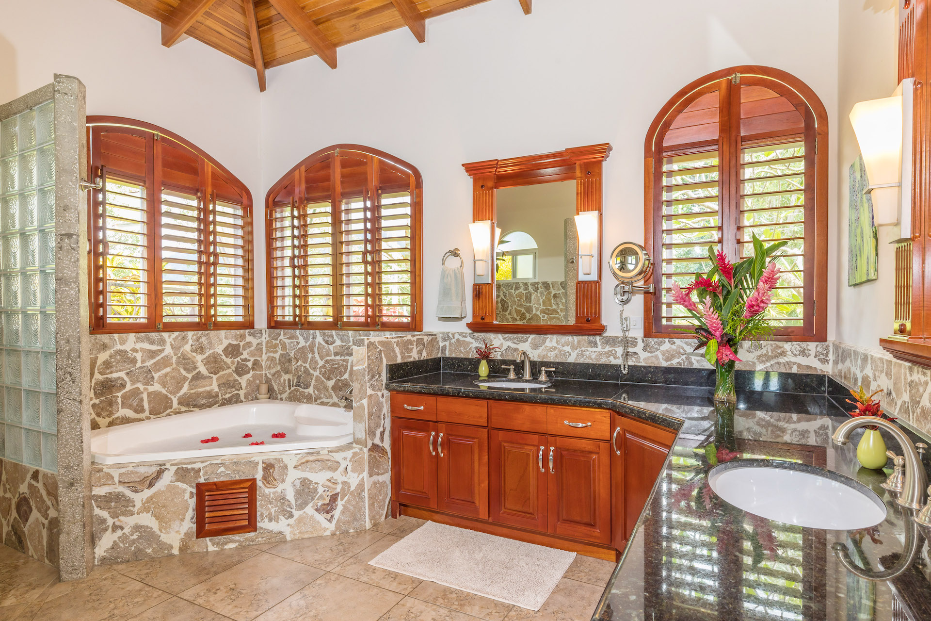 Upon entrance to this open-concept home, you will see the GREAT ROOM with its towering 2-story, soaring ceiling complete with an impressive 8-foot diameter ceiling fan, and a floor to ceiling river-rock wall which emphasizes utter spaciousness. Scanning across the room you can’t help but see a wall of windows - extra-large windows/patio sliding doors which bring in not only the spectacular ocean views but the spectacular outdoor living and dining areas.