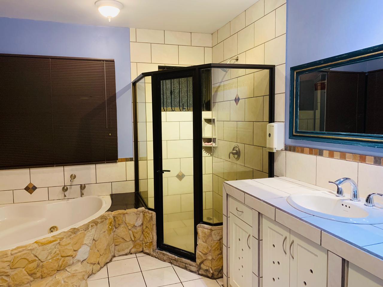 The main floor of the home consists of: Master bedroom with en suite bathroom with jacuzzi tub and separate shower, walk-in closet, and tiled covered patio; 1 large guest bedroom with en suite bathroom and separate exit; and 2 smaller guest bedrooms with closets.