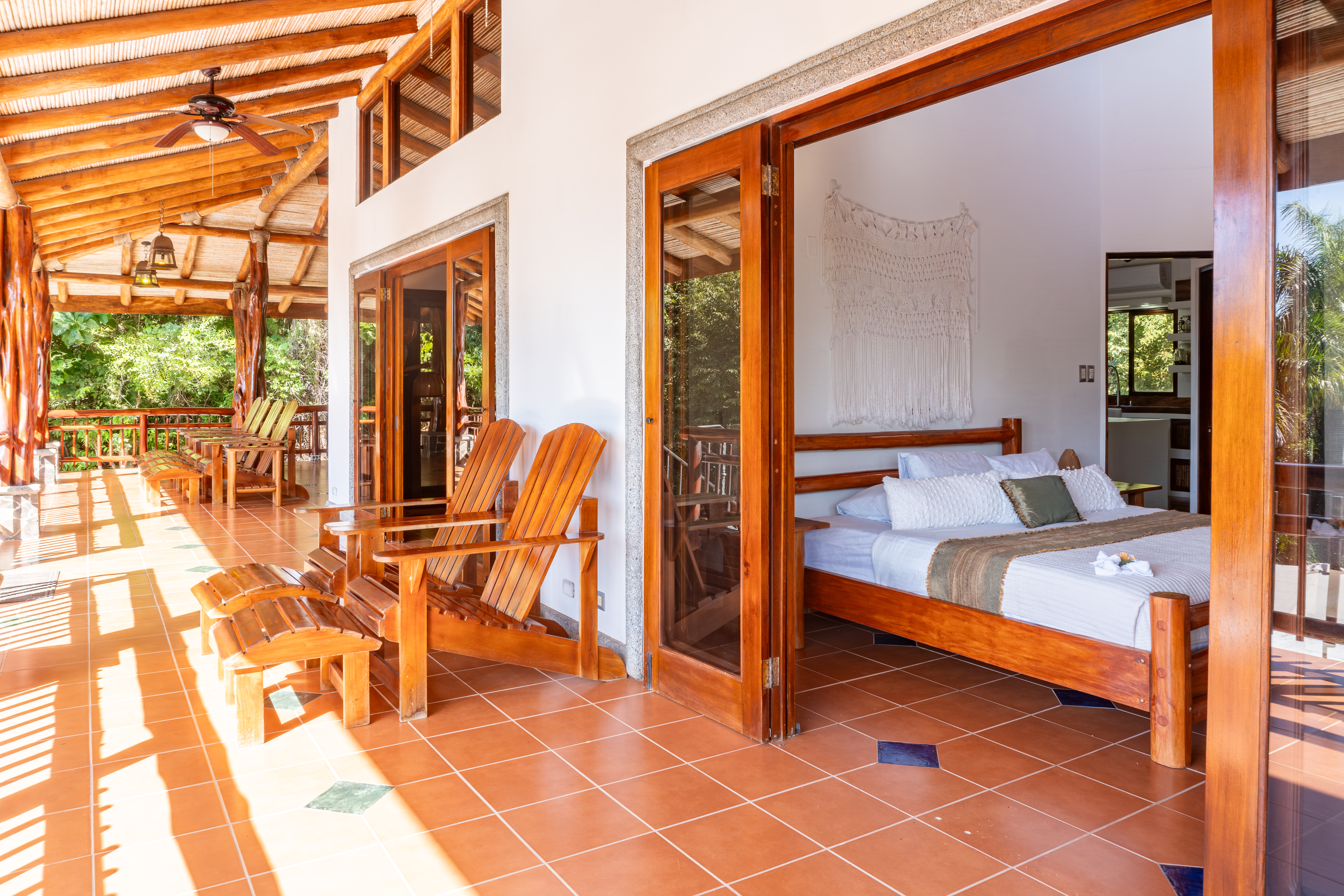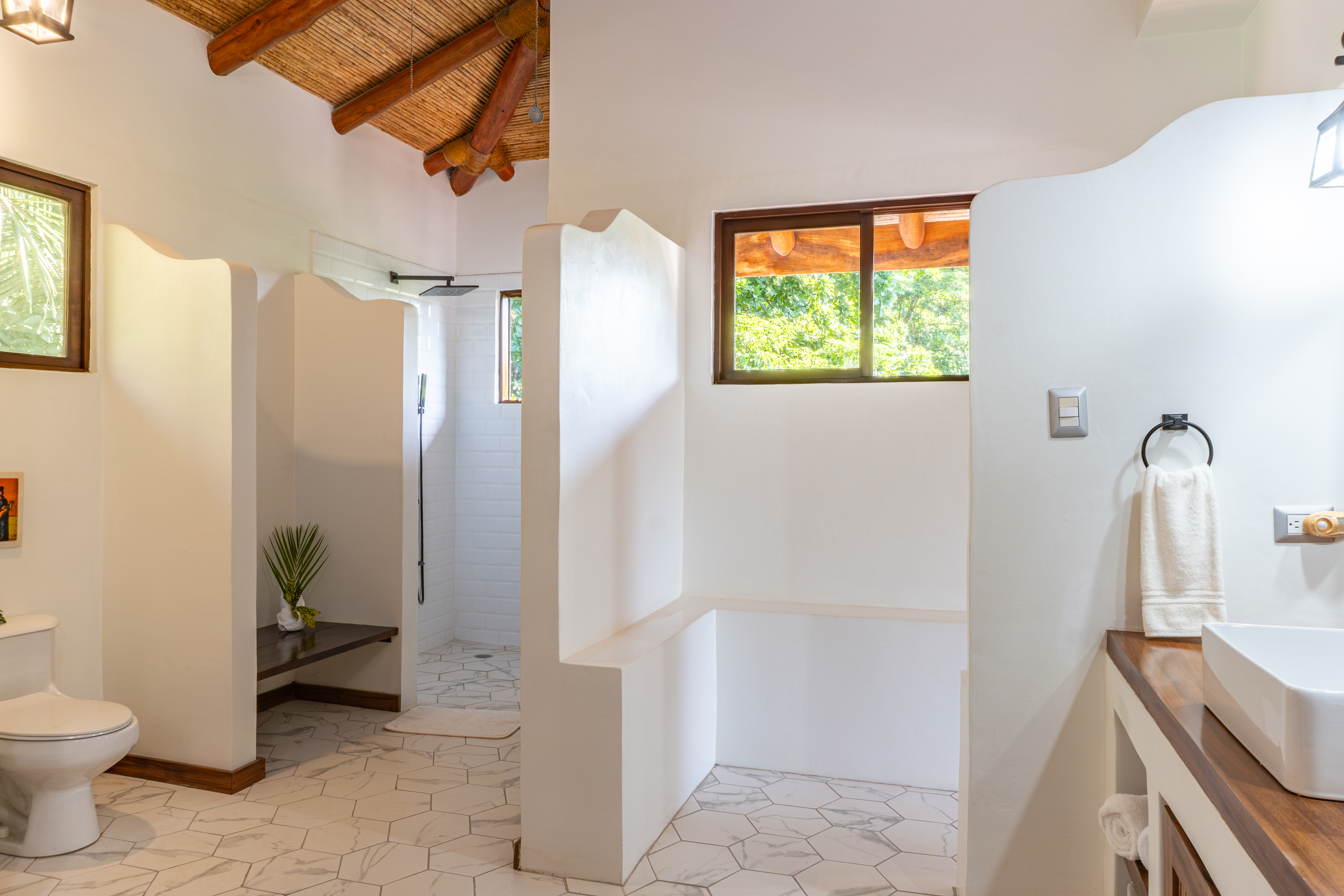 On the entry level, with lofty 3.35 m (11 ft) ceilings, the layout opens from an inviting entry to a second master bedroom with a large en-suite bathroom. Two additional bedrooms are served by a secondary bathroom; both renovated baths include polished concrete and Guanacaste-wood vanities and framed mirrors. Every bedroom is equipped with air conditioning, ample hardwood closets crafted from local species, newly installed high-quality blinds, and glass French doors that open directly onto the private infinity pool, terrace and gardens.
