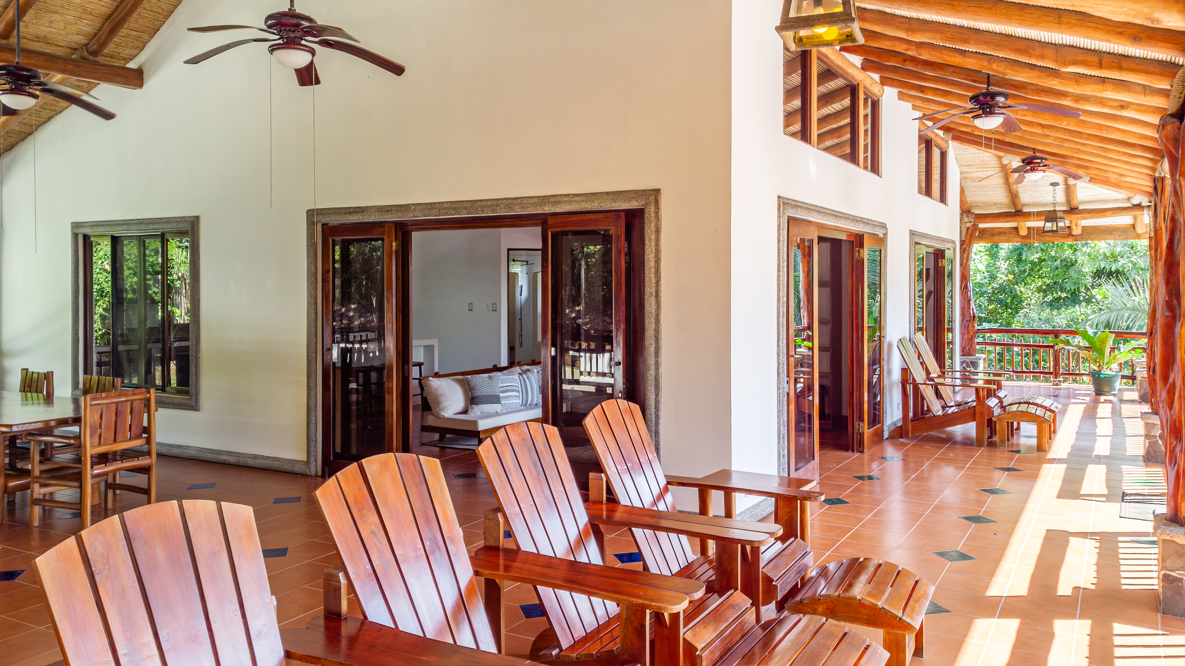 Ascending to the upper level, dramatic 4.57–6.10 m (15–20 ft) ceilings define the principal living area and open onto a broad covered terrace appointed with locally sourced Teak and Guanacaste custom furniture, including an impressive single-piece dining table. The terrace frames sweeping jungle vistas with ocean glimpses beyond, providing a sublime stage for both quiet mornings and elegant entertaining.
