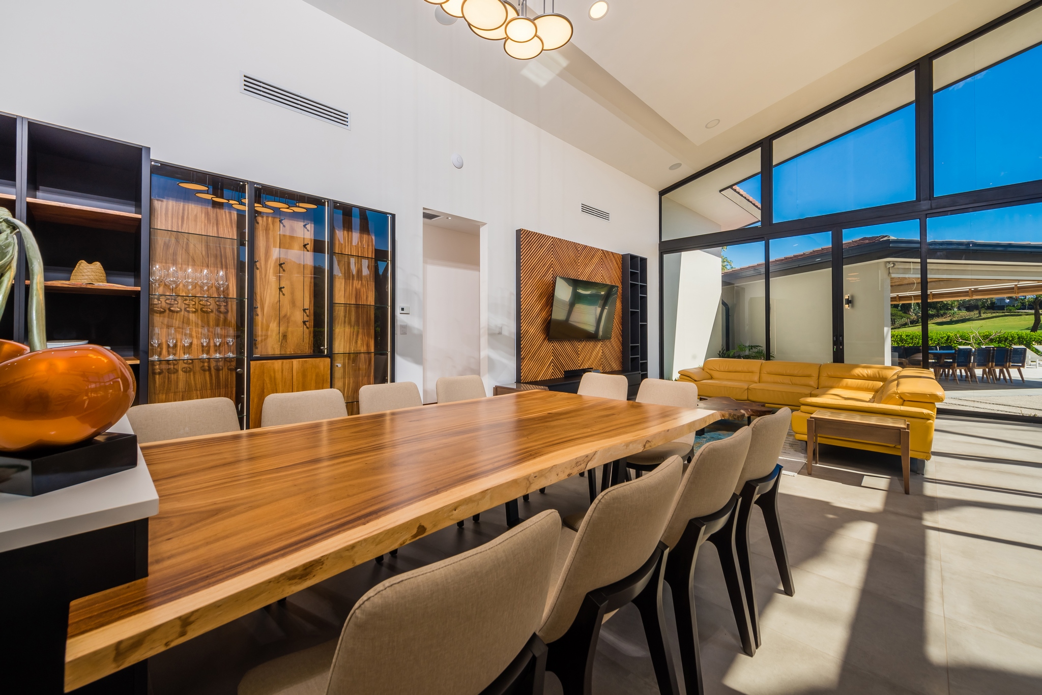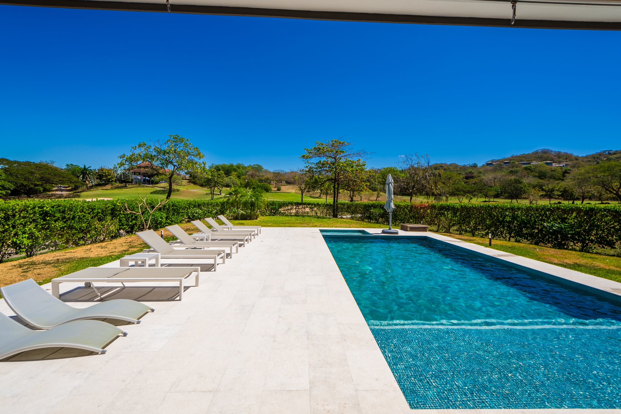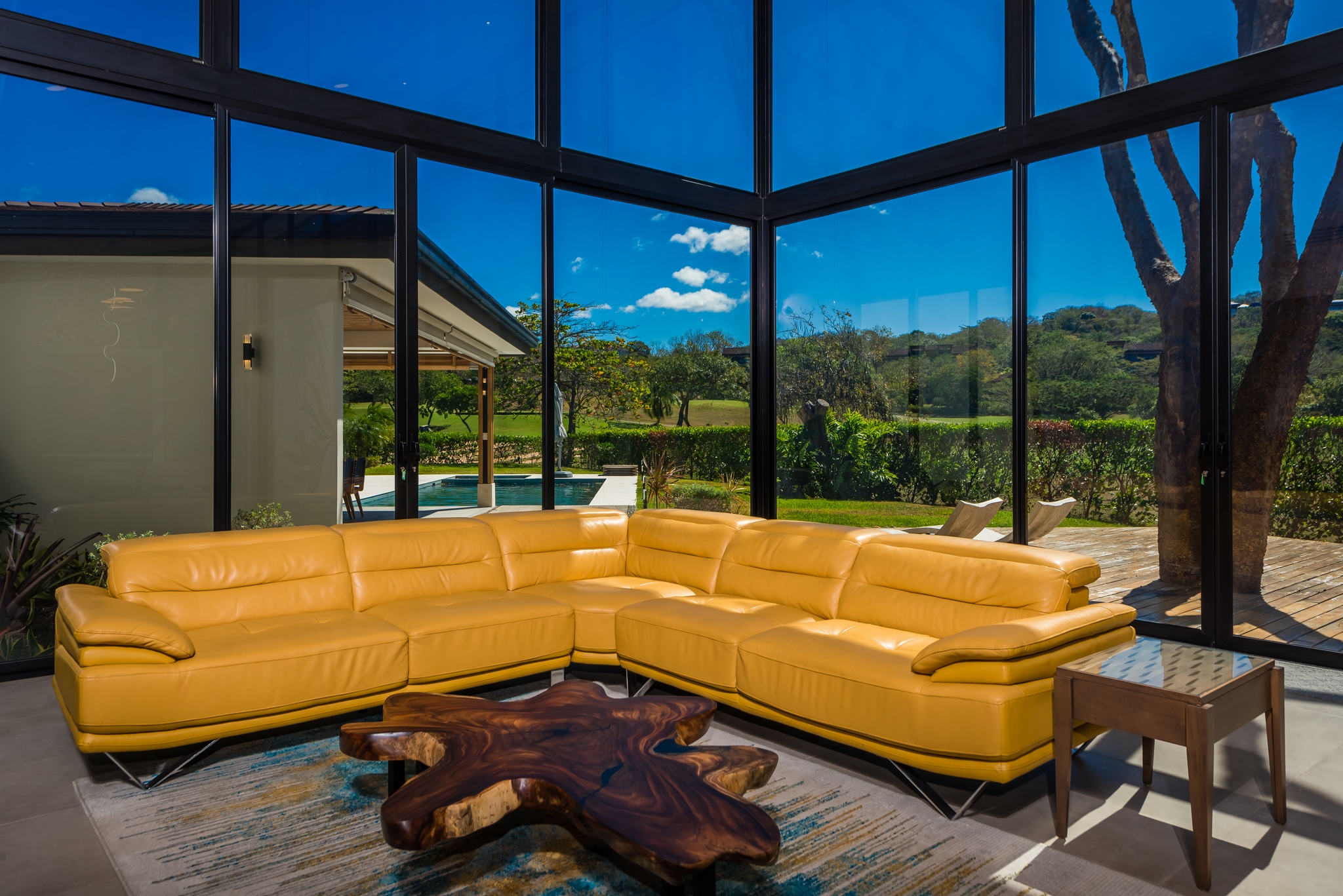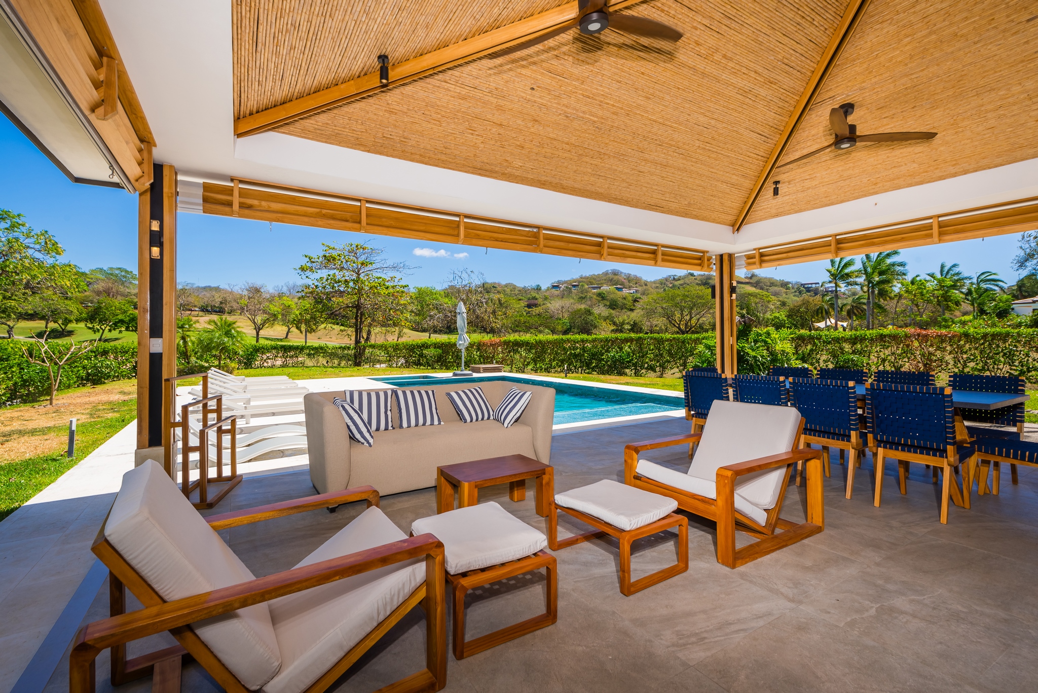 ✔️ Indoor spaces open to stunning views of mountains, gardens, and pool