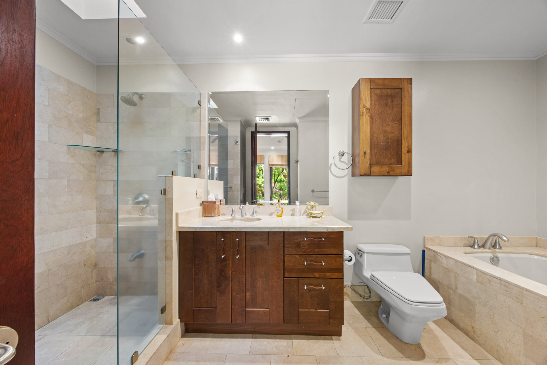 Each of the four bedrooms includes its own bathroom, providing privacy and comfort for all. The primary suite features a large bathroom with a jacuzzi tub, a skylight shower, a walk-in closet, and a private terrace overlooking the golf course—a peaceful spot to start your day.