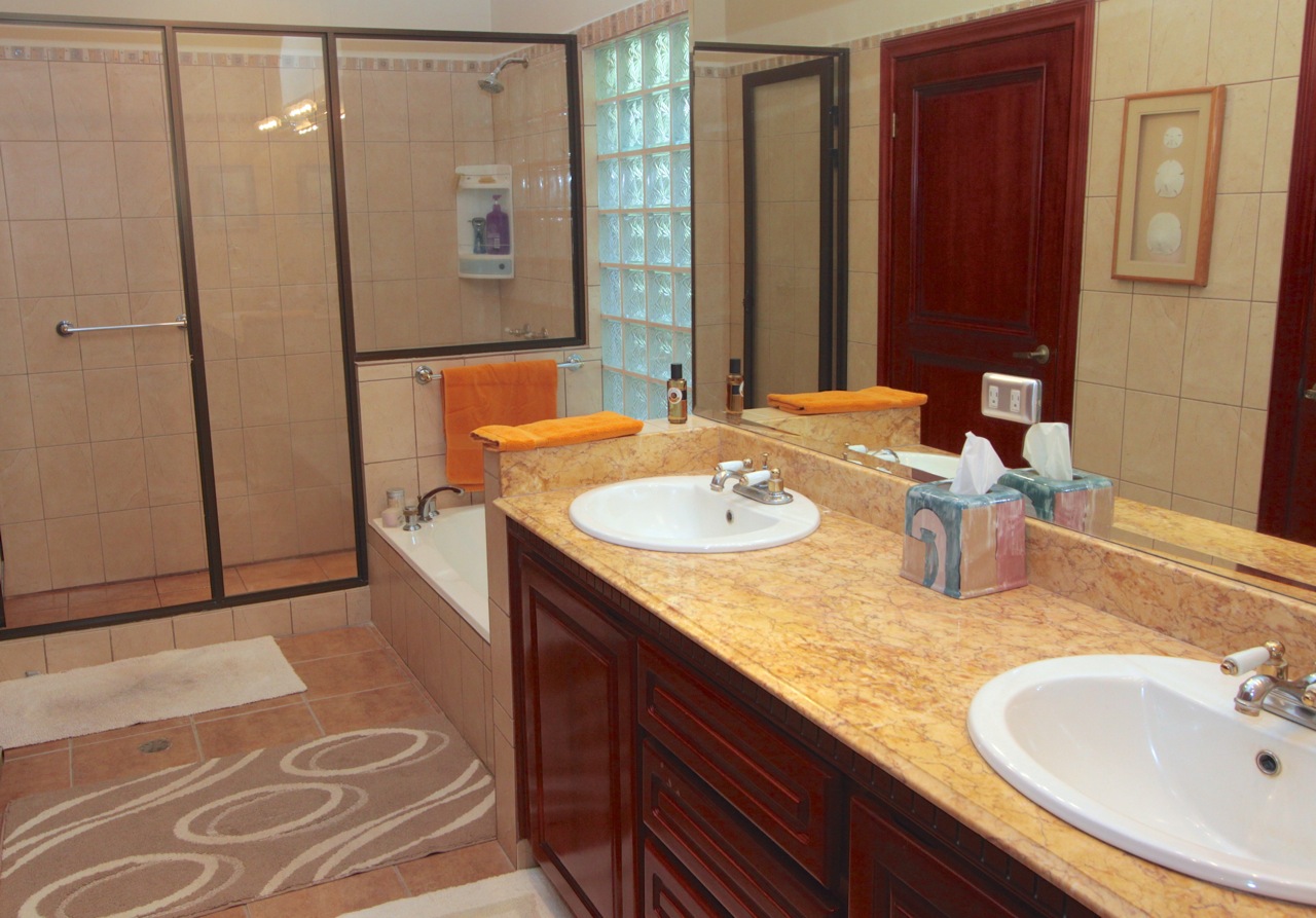 The Master bath has a jacuzzi tub and walk in shower with double sinks and much storage space.