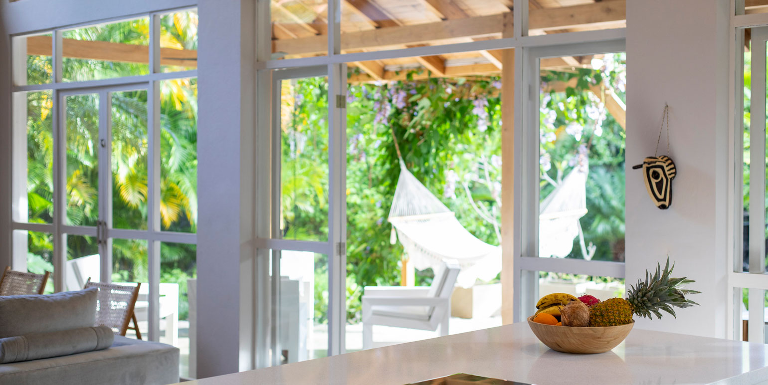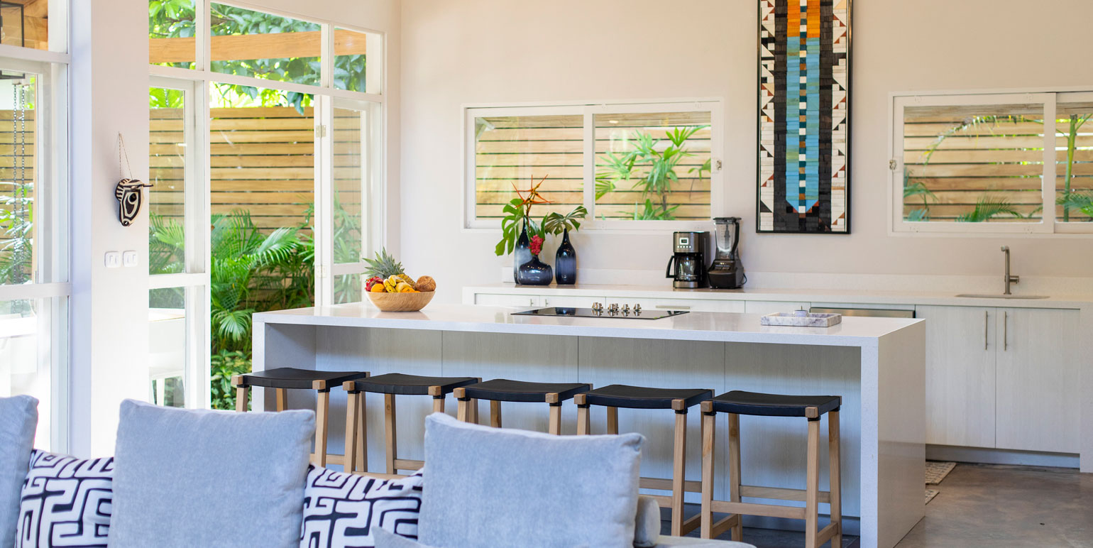 The villa is perfect for indoor and outdoor living. The living areas and kitchen can open up entirely to the large patio, allowing a seamless flow between indoor and outdoor spaces while you enjoy the view of the pool.