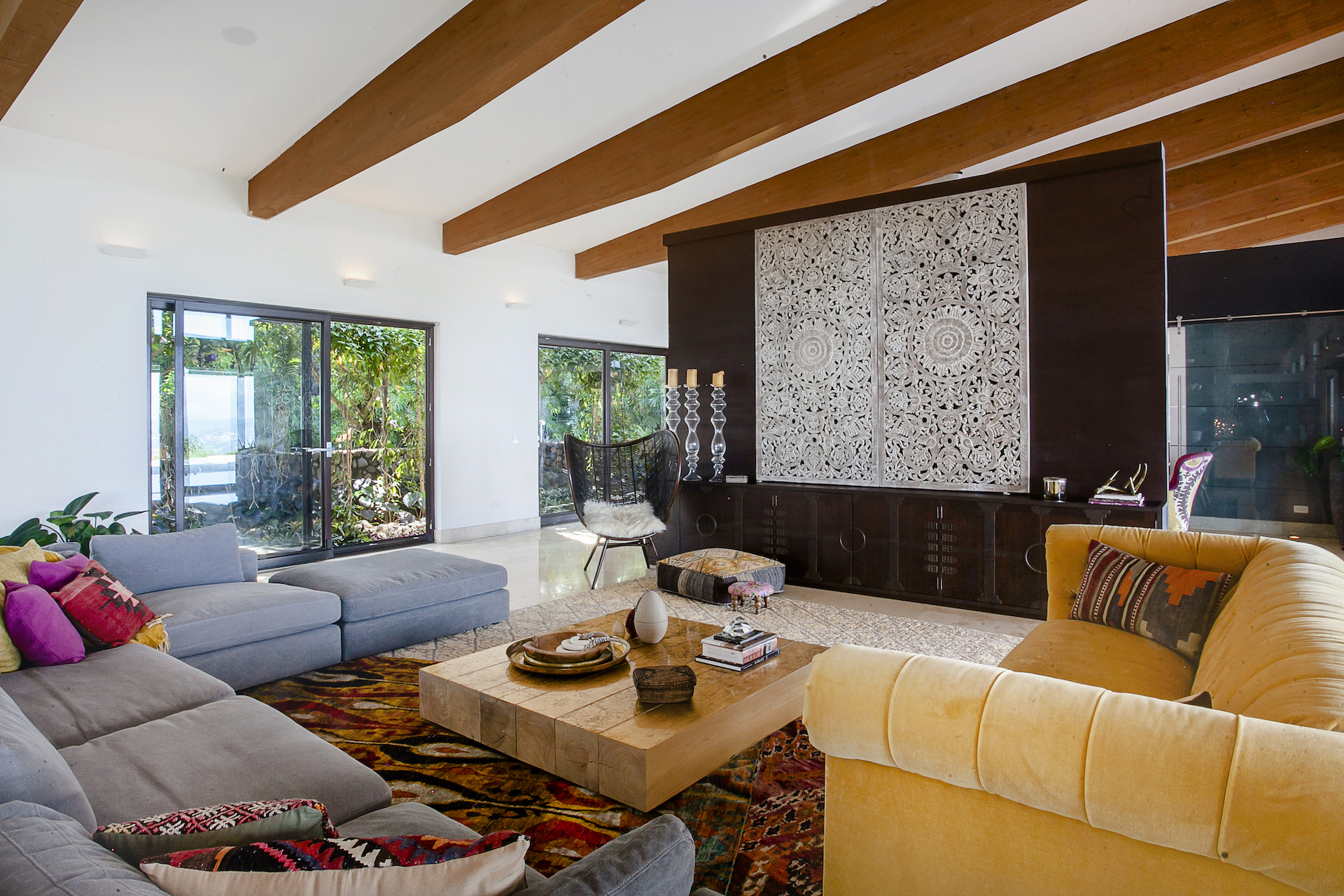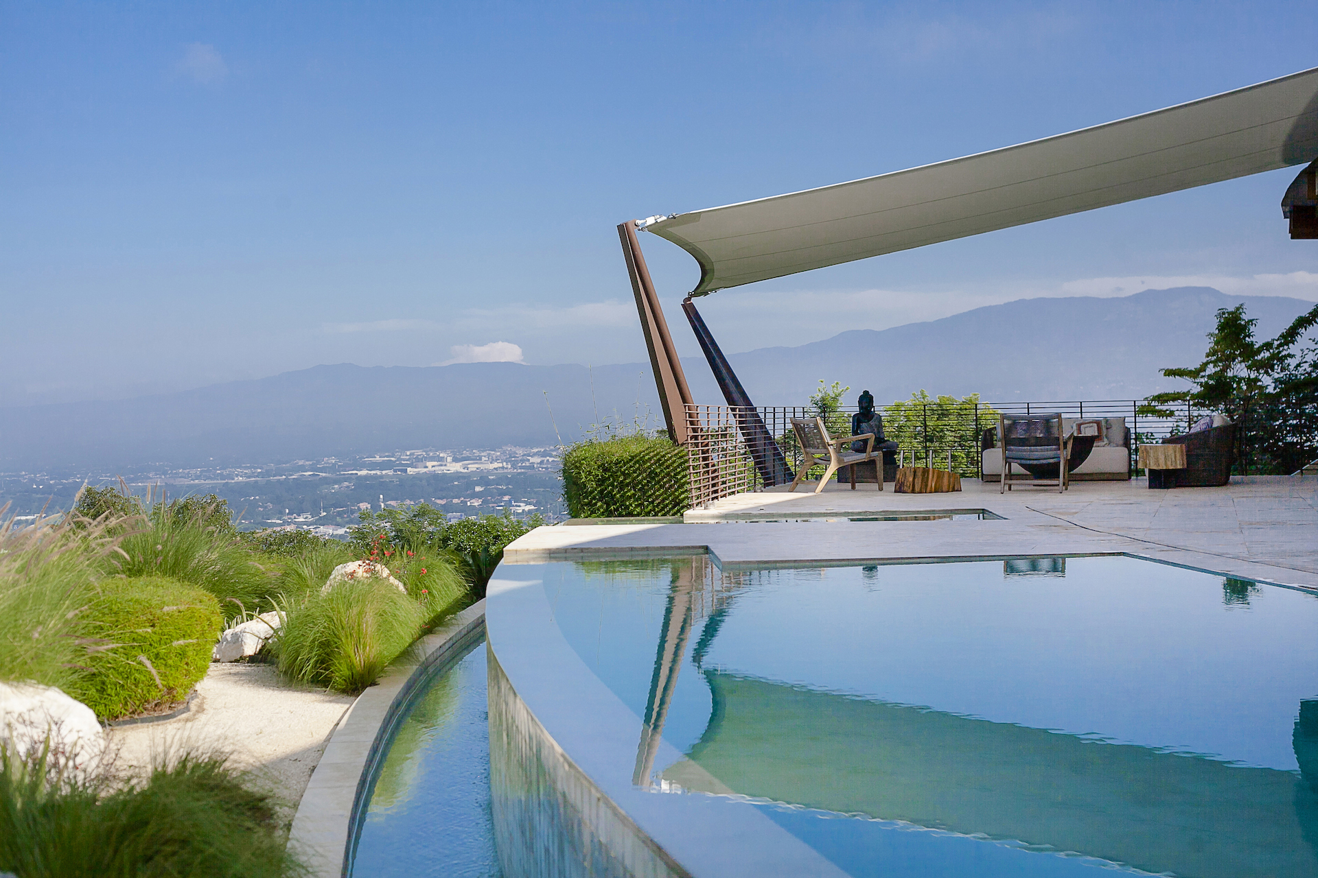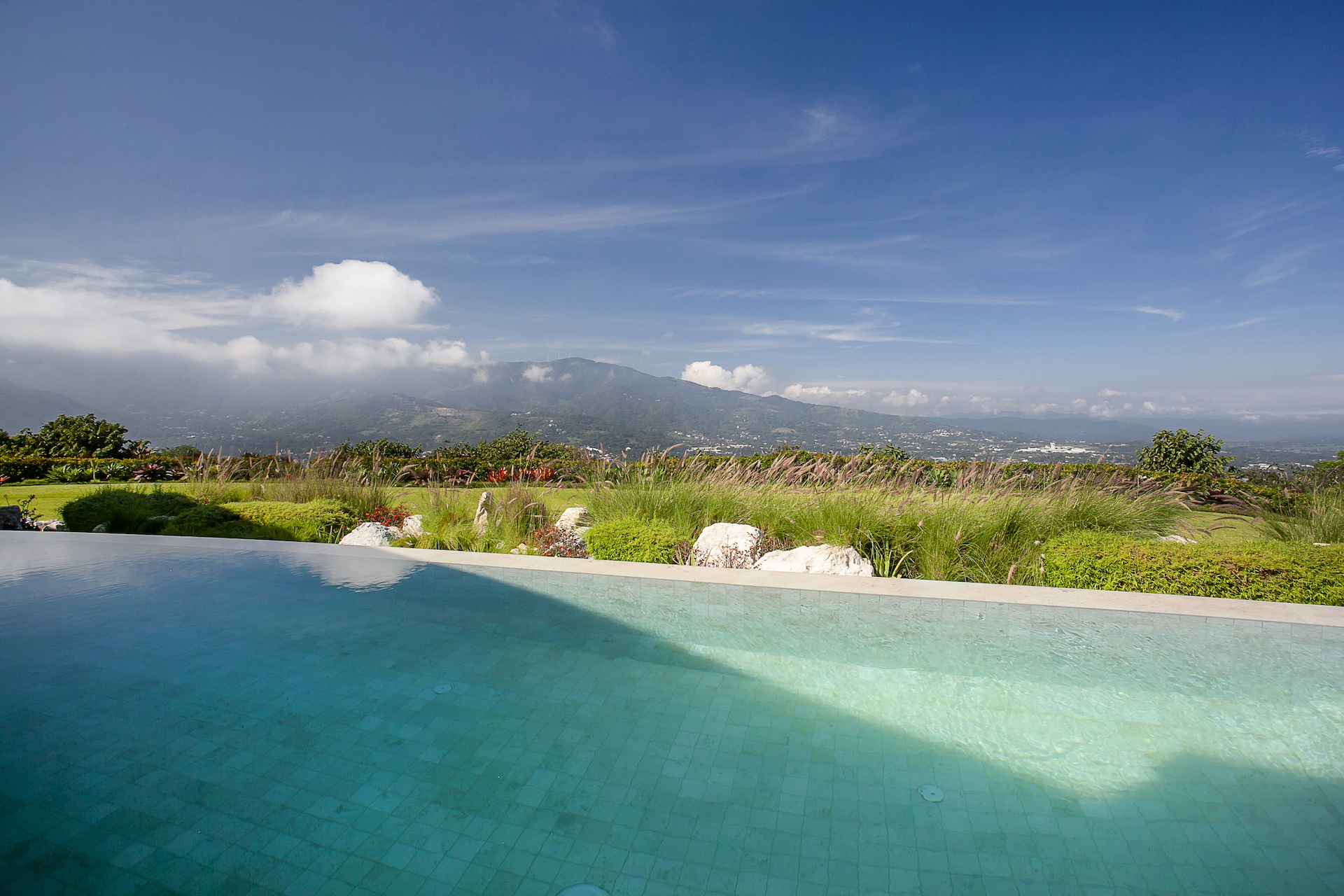 Upon arriving at Shangri La, you will come to one of the only private gated entrances, within Villa Real which is where the true sense of arrival begins. As the iron gate slowly opens, you will know you have arrived. Unlike most homes in Villa Real, the entrance to this estate is a flat, slowly winding concrete paved road, lined with lush greenery on either side. As you meander around the first curve, you will experience sensory overload as the view opens up dramatically combining what seems to be endless views of the mountains, and surrounding valleys, with a stunning, contemporary tropical residence in your peripheral. As you continue to approach the residence, you will find an expansive, private cul de sac arrival, with multiple garages both for daily use and the collection. Upon entering the home, which unlike most homes in Villa Real, sprawls horizontally as opposed to vertically, you push through the massive pivoting door and your senses will continue to be amazed.