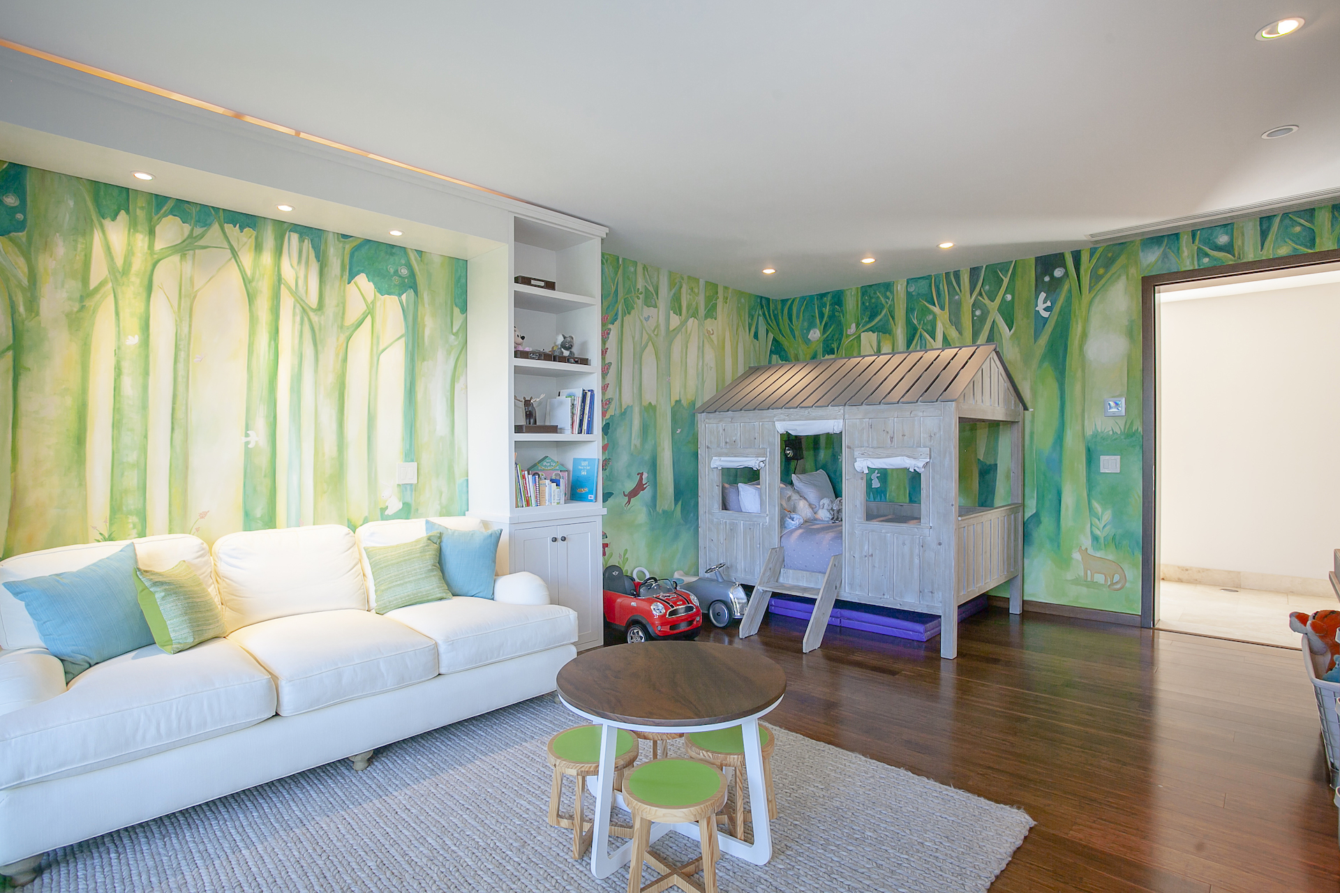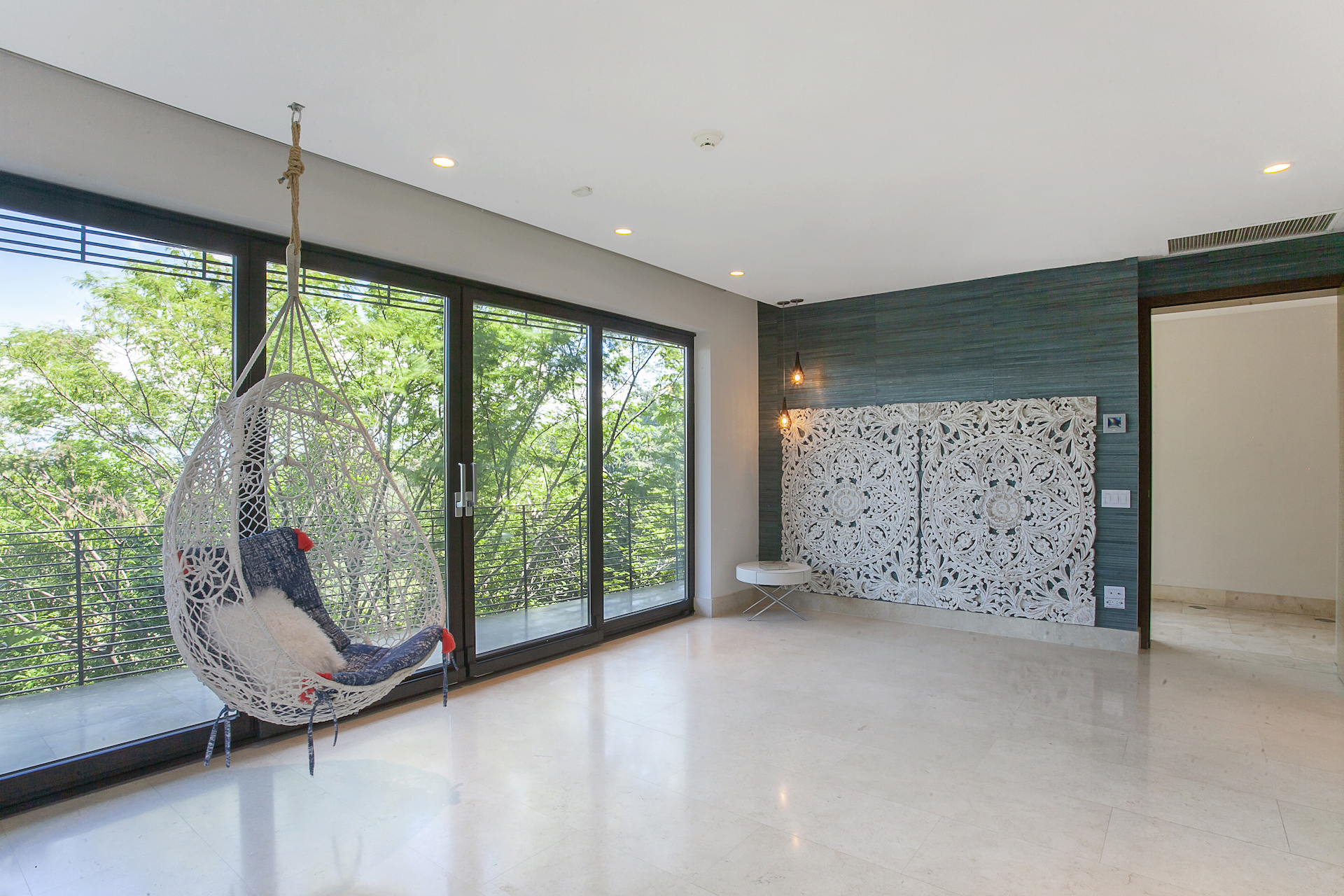Just off to the right is an enclosed, yoga or meditation room that is tucked into the lush greenery in the background. Of course, the master bedroom boasts an impressive walk-in closet, and a spa-inspired bathroom. Before heading downstairs, it is important to note that those lucky enough to inhabit the master suite can live and enjoy this once in a lifetime home, on one level... As you walk downstairs (or take the elevator), you will come to a more casual, living room and bar area, which also opens up to the backyard via a large, sliding glass door. As this space is currently accented with a collection car, the entire yard boasts inset draining and lining so that cars can be driven on, through or parked upon. Down this hallway on the second level, you will find three, en-suite bedrooms each with a private bathroom, walk-in closet, spacious layout, and direct access to the terrace. As this is one level lower, while there are views in the backdrop, these bedrooms enjoy a unique, treehouse sensation as they are surrounded by the forest and provide the ultimate intimate and private setting.